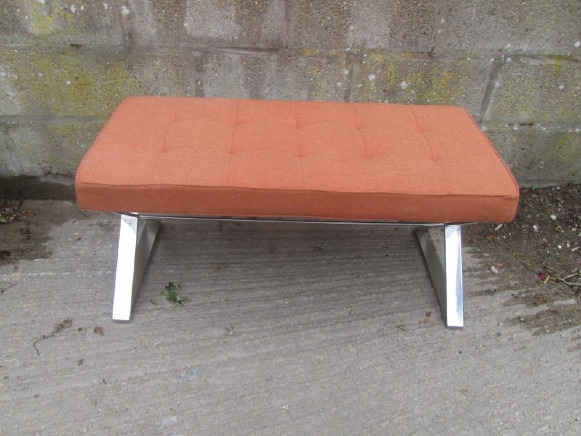 A PADDED FOOT STOOL, UPHOLSTERED IN MATERIAL. STURDY CHROME METAL FRAME. IN A RETRO STYLE.