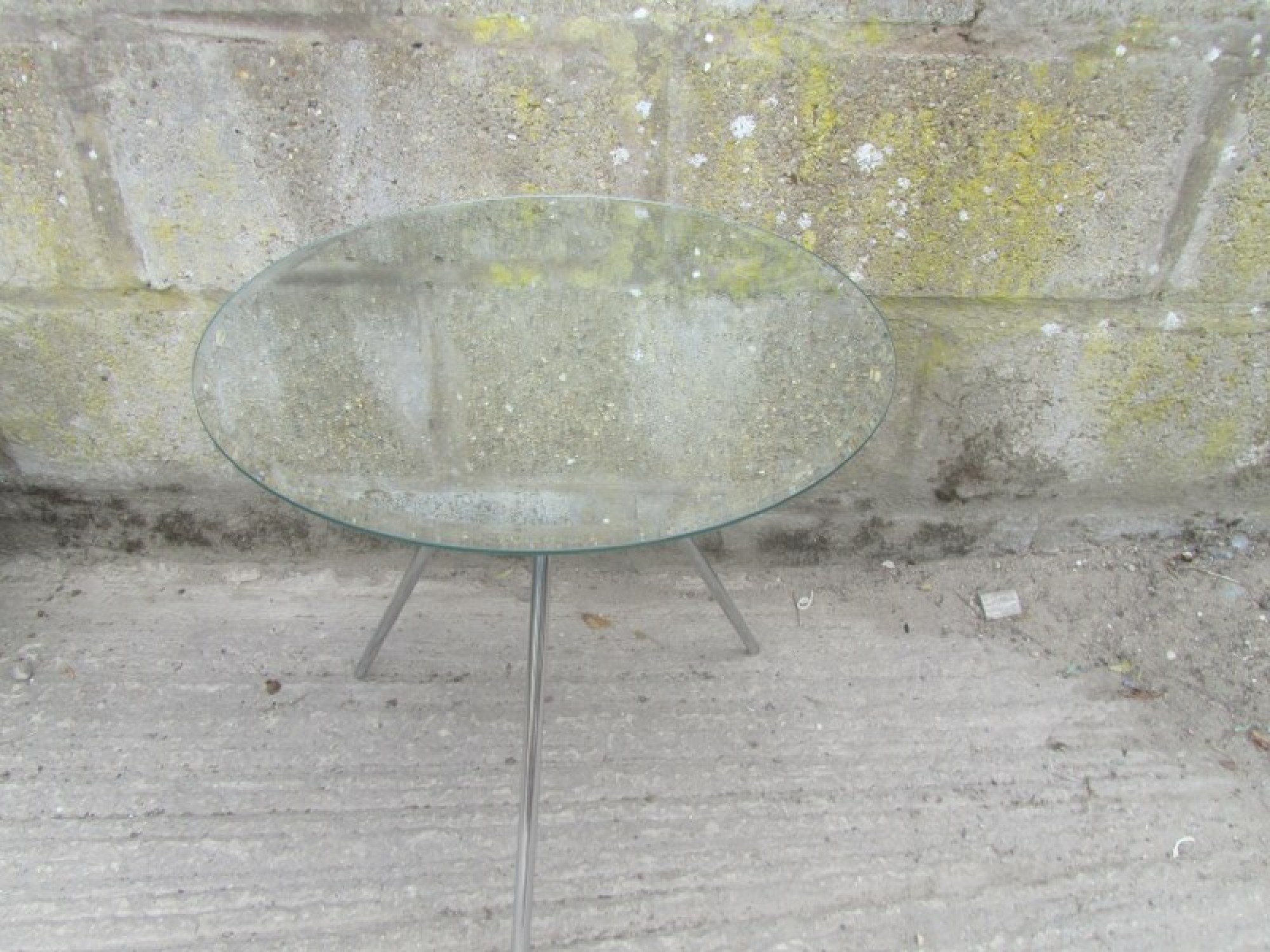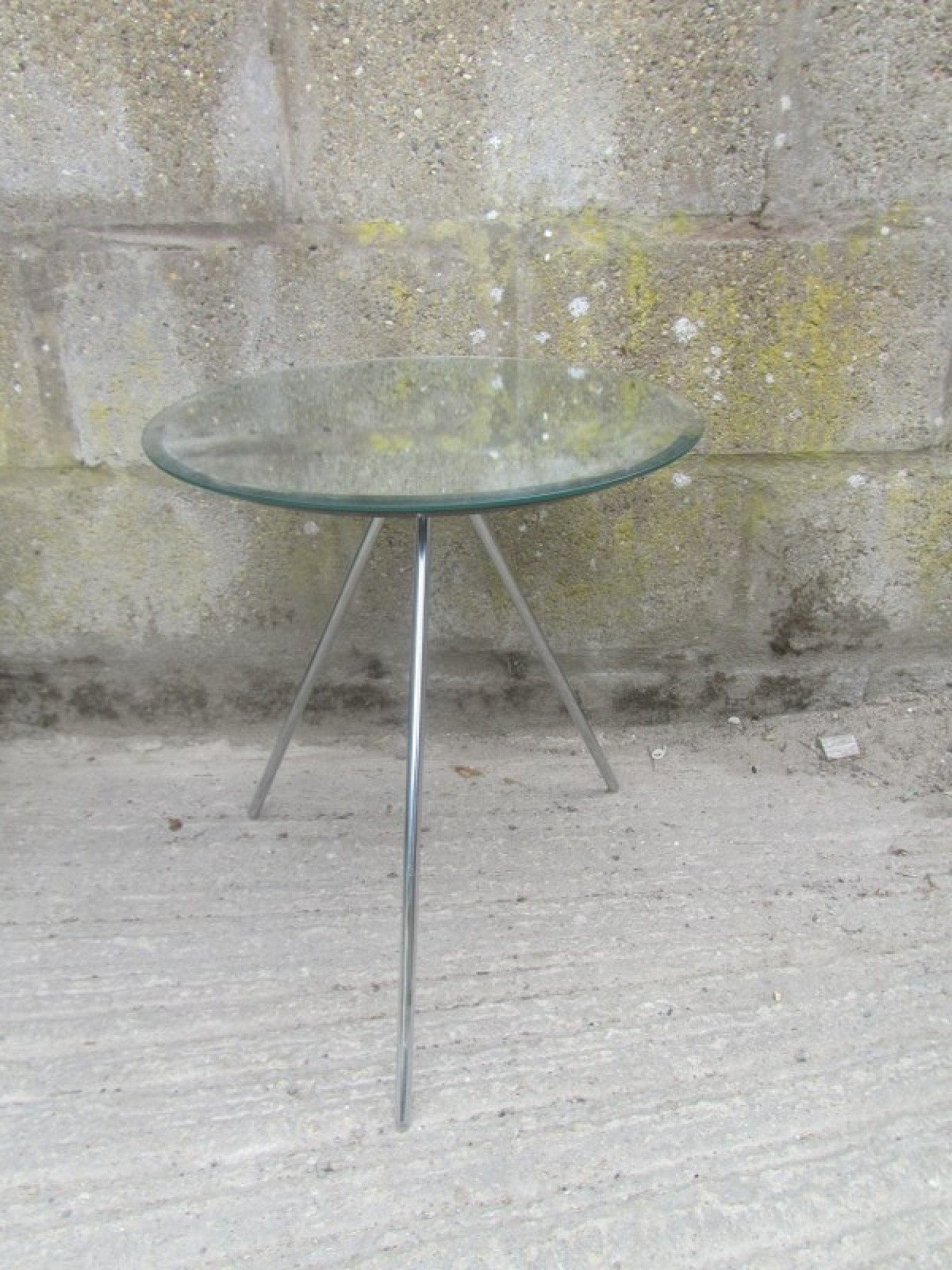A STYLISH TABLE, IT STANDS ON 3 METAL LEGS, STRONG AND STURDY. IT HAS A METAL FRAME WITH A MIRROR TOP, IDEAL FOR ANYWHERE IN THE HOME.