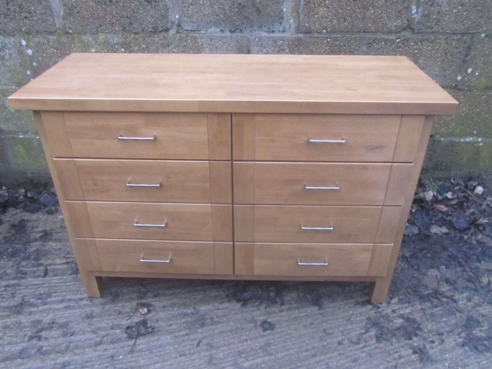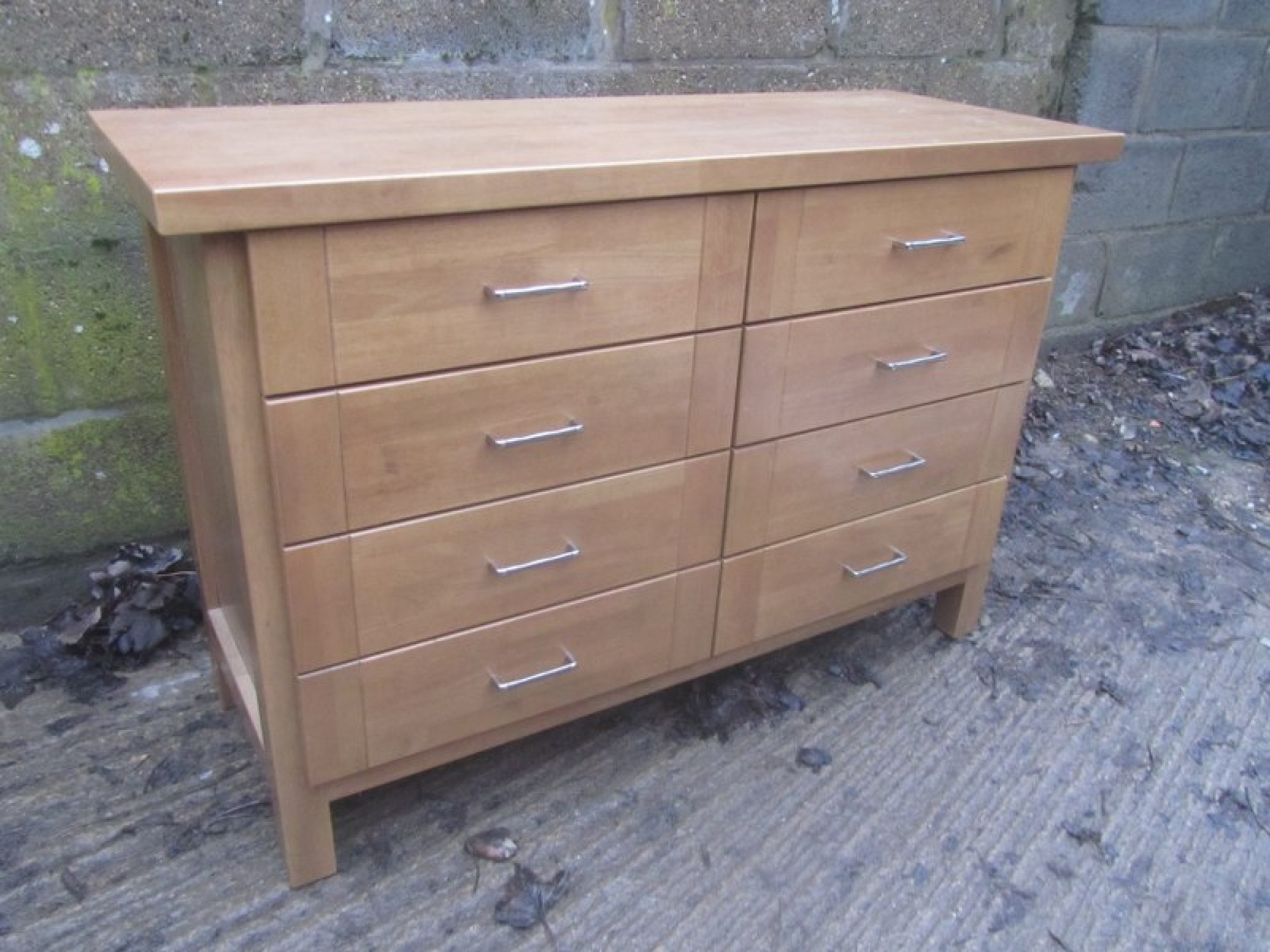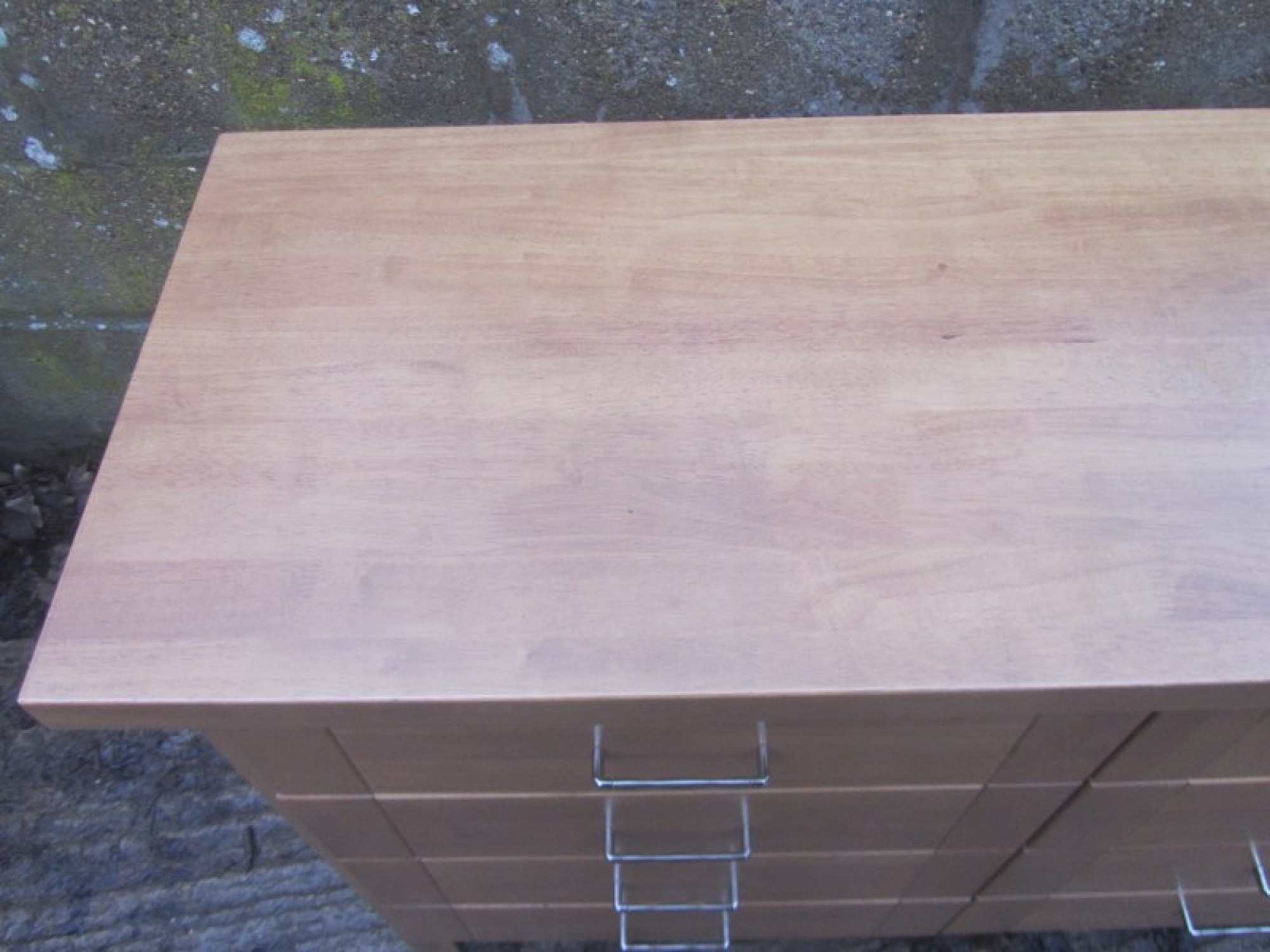 A MODERN BEECH CHEST OF DRAWERS OR SIDEBOARD. METAL HANDLES, GOOD QUALITY. PLENTY OF STORAGE SPACE.