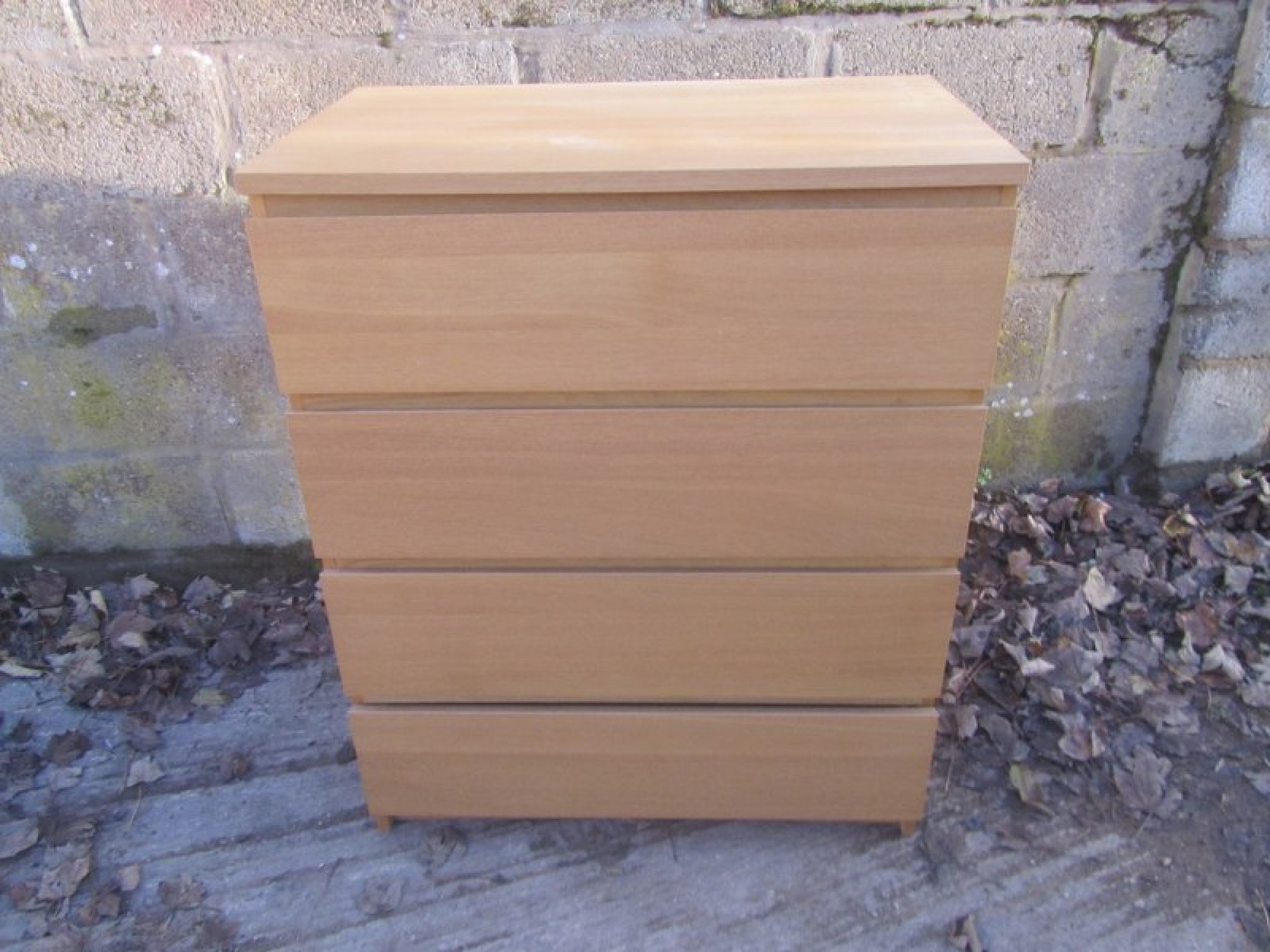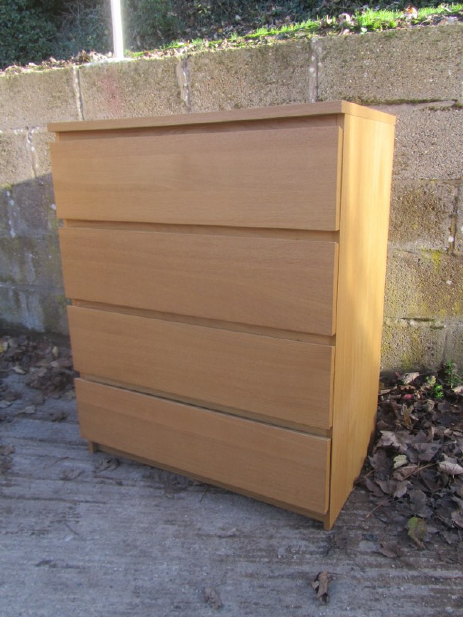A MODERN CHEST OF DRAWERS. IT IS OAK VENEER AND IN GOOD CONDITION. LARGE, PLENTY OF STORAGE SPACE.