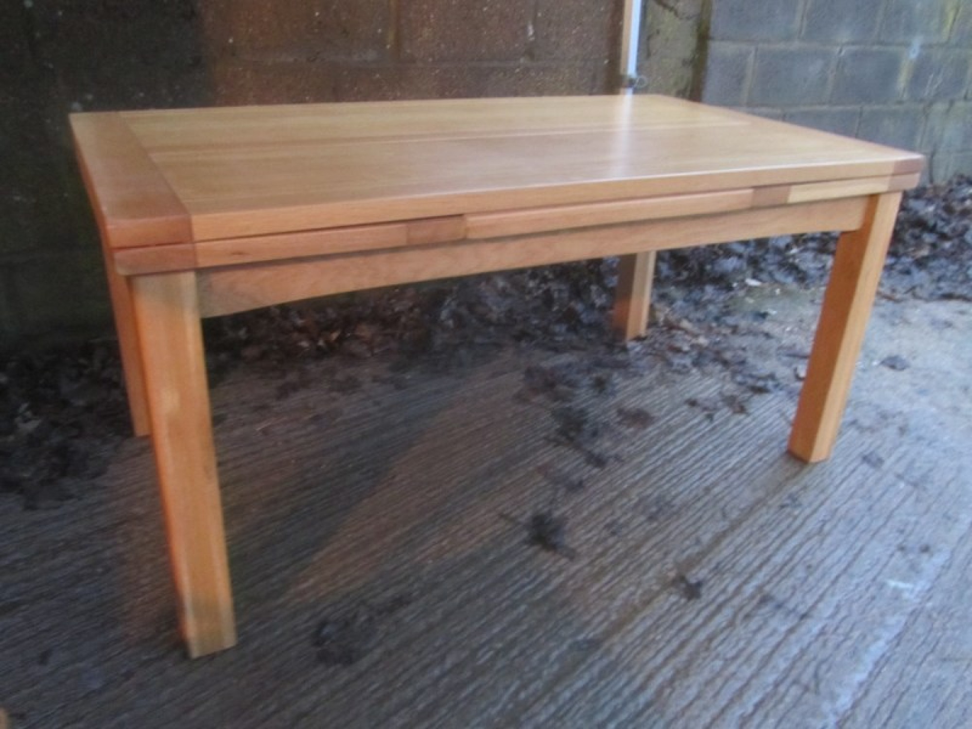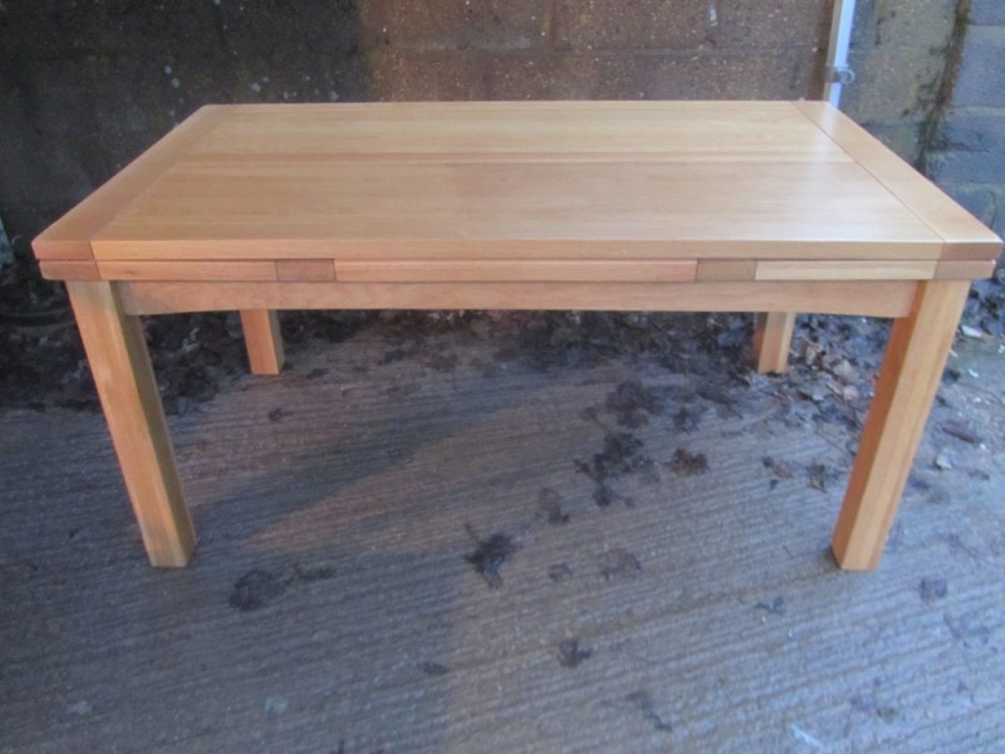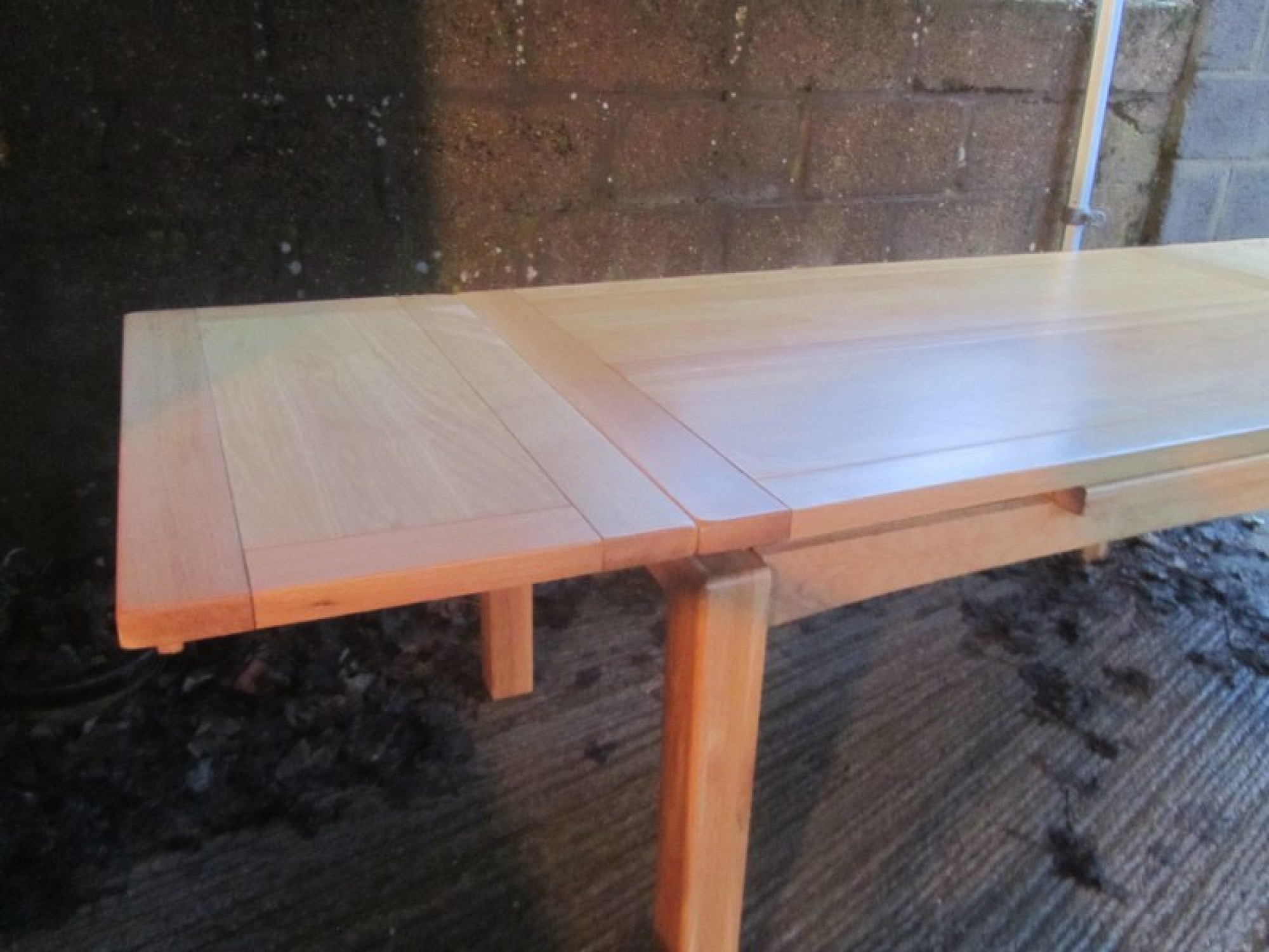 THE TABLE HAS REMOVABLE LEGS, THE TOP IS IN AN OAK VENEER. IT SEATS 6 - 8 DINERS, WITH A SLIDE OUT LEAF EACH SIDE. TABLE MEASUREMENTS ARE BELOW, EXTENDED SIZE IS 260cm x 90cm. A PRACTICAL AND STYLISH DINING TABLE. IN GOOD CONDITION.