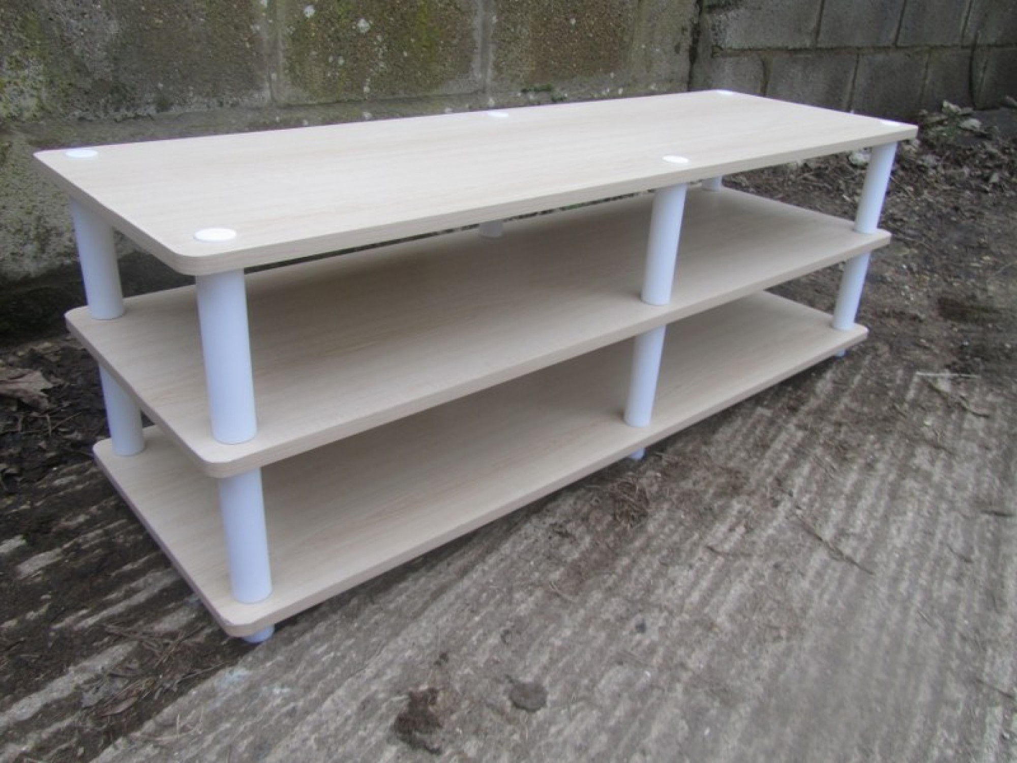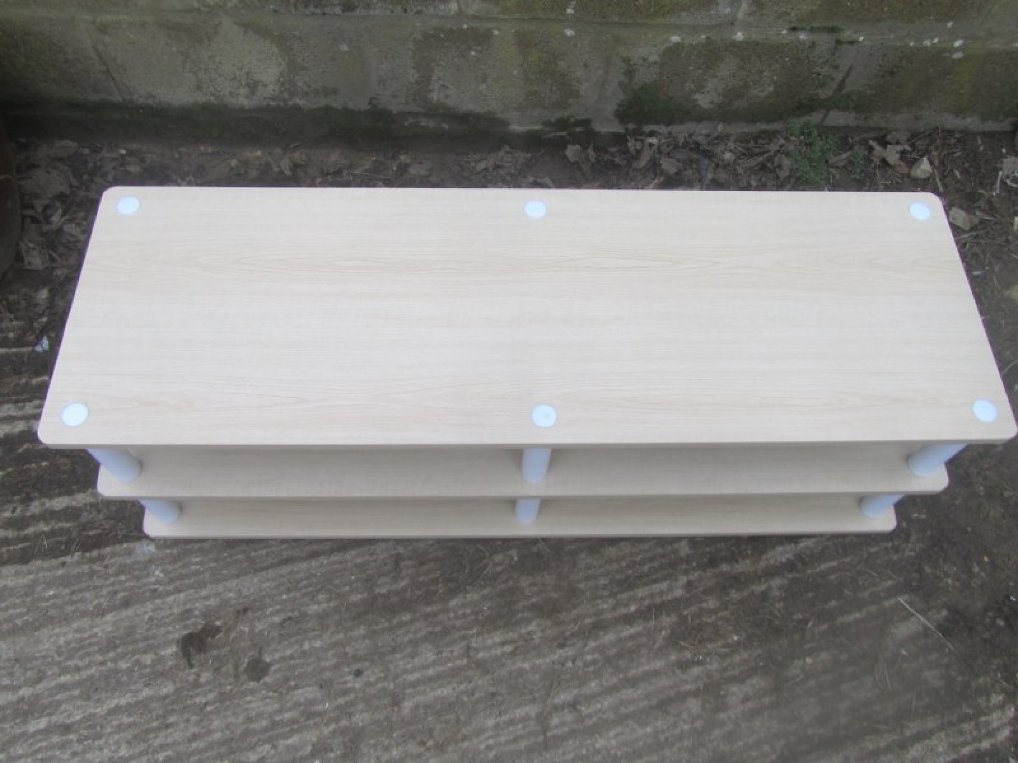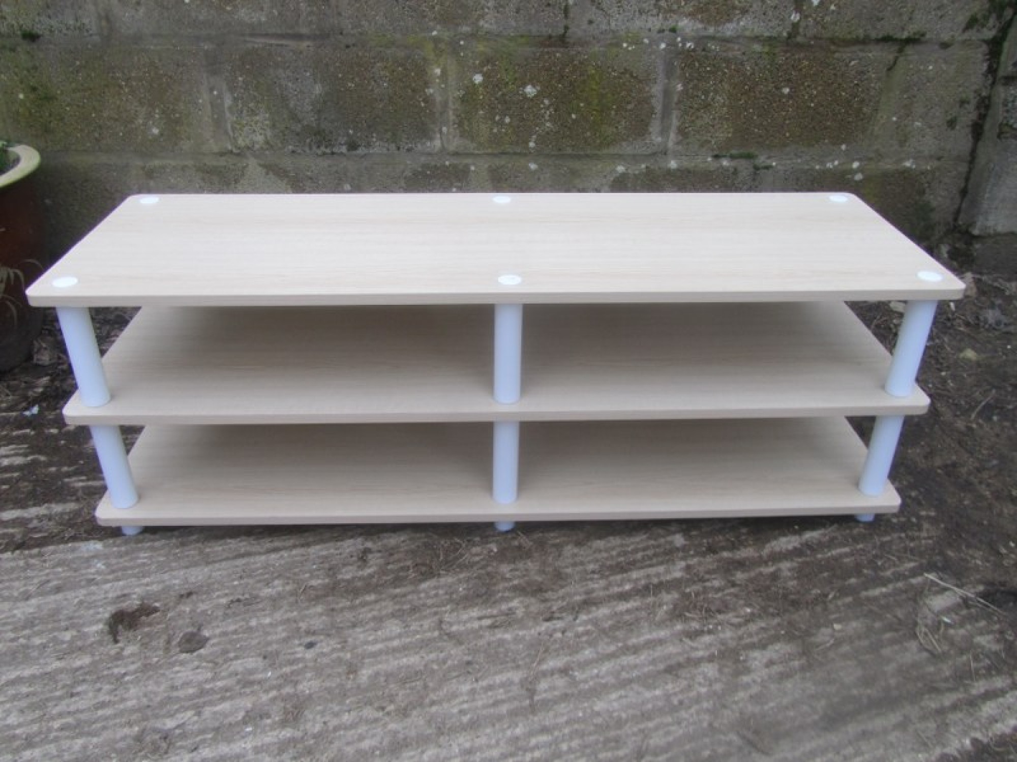 A LOW WOOD EFFECT TV TABLE IN A MODERN MINIMALIST STYLE. STRONG AND STURDY. SPACE FOR SKY BOX, DVD PLAYER etc.