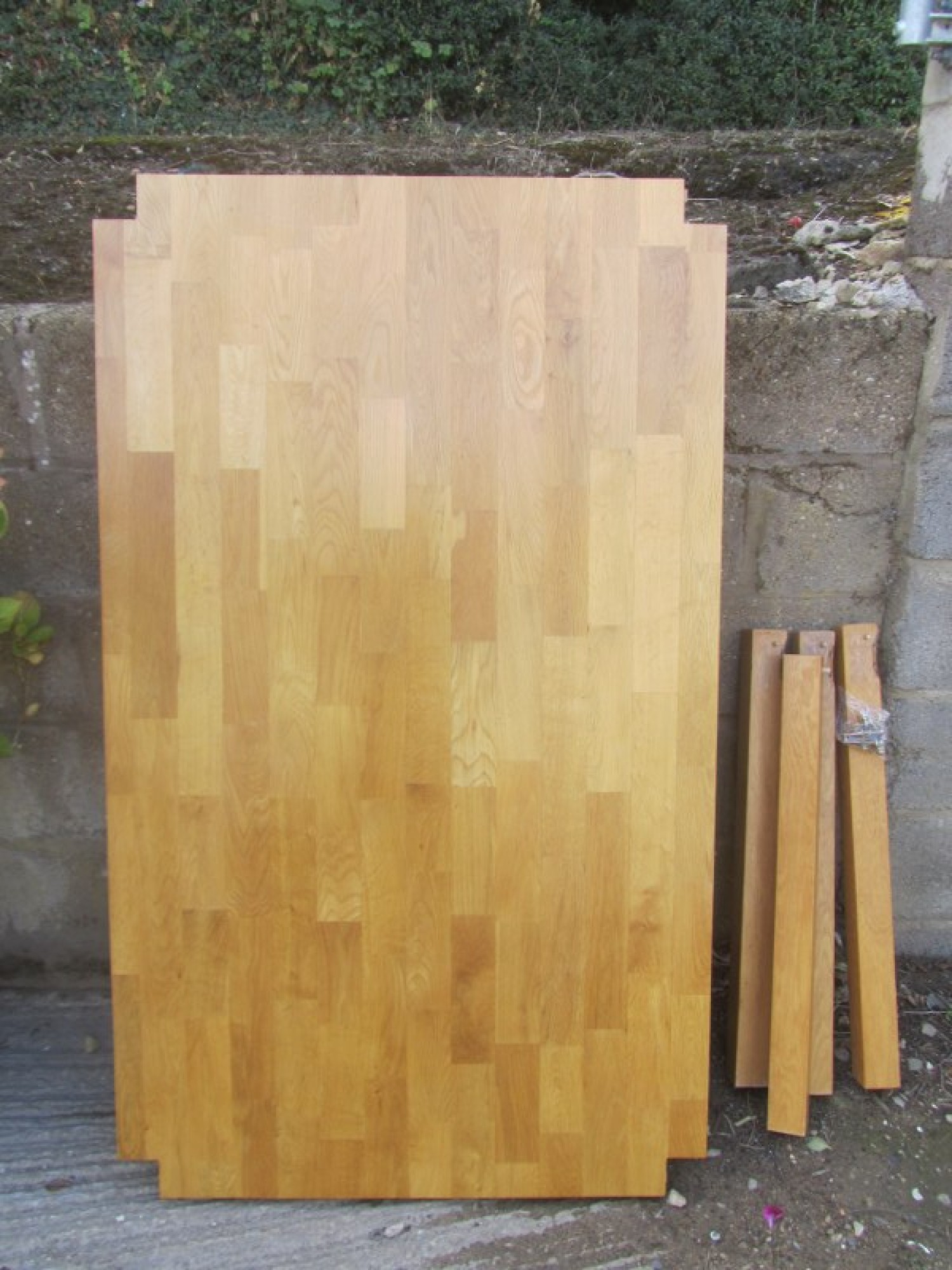 THE TABLE HAS 4 LEGS, THEY REMOVE FOR TRANSPORT. THE TABLE IS SOLID OAK, STRONG AND STURDY. IT SEATS 4 - 6 DINERS. THE TABLE TOP IS RECTANGULAR. SOME LIGHT MARKS AND WEAR.