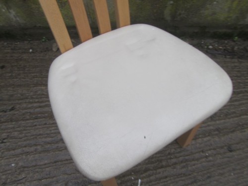 THIS IS A CHAIR FOR THE KITCHEN OR DINING ROOM. IN A MODERN STYLE. IN AVERAGE CONDITION. THE FRAME IS SOLID OAK. STRONG AND STURDY. PADDED SEAT. SEAT HEIGHT IS 47cm.