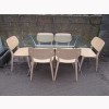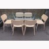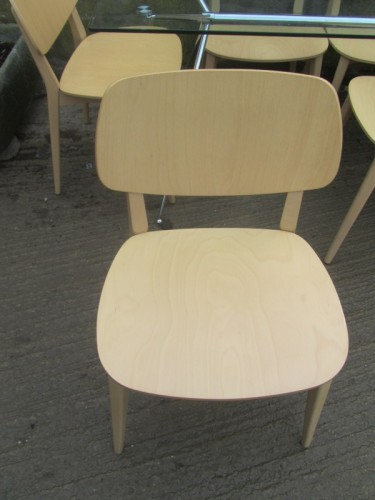 CHROME METAL TABLE BASE WITH LARGE GLASS TABLE TOP. THE 6 CHAIRS ARE A LIGHT COLOURED WOOD FRAME WITH STYLISH SHAPED PLYWOOD SEATS AND BACK RESTS. THE CHAIRS ARE CALLED 'DOLL CHAIRS' DESIGNED BY EMILIO NANNI AND RETAIL NEW FOR £200-300 EACH ONLINE. SOME LIGHT SCUFFS TO THE EDGES. STRONG AND STURDY CHAIRS. IN GOOD CONDITION. CHAIRS ARE 78cm HIGH, 50cm WIDE AND 55cm DEEP, SEAT HEIGHT IS 47cm.