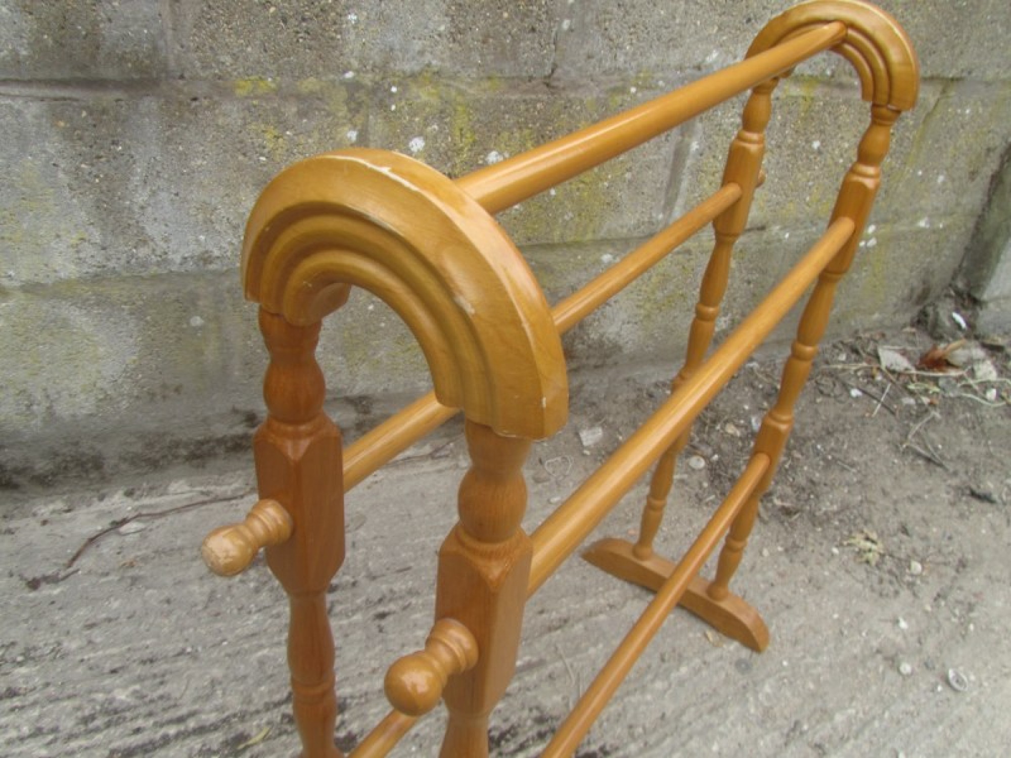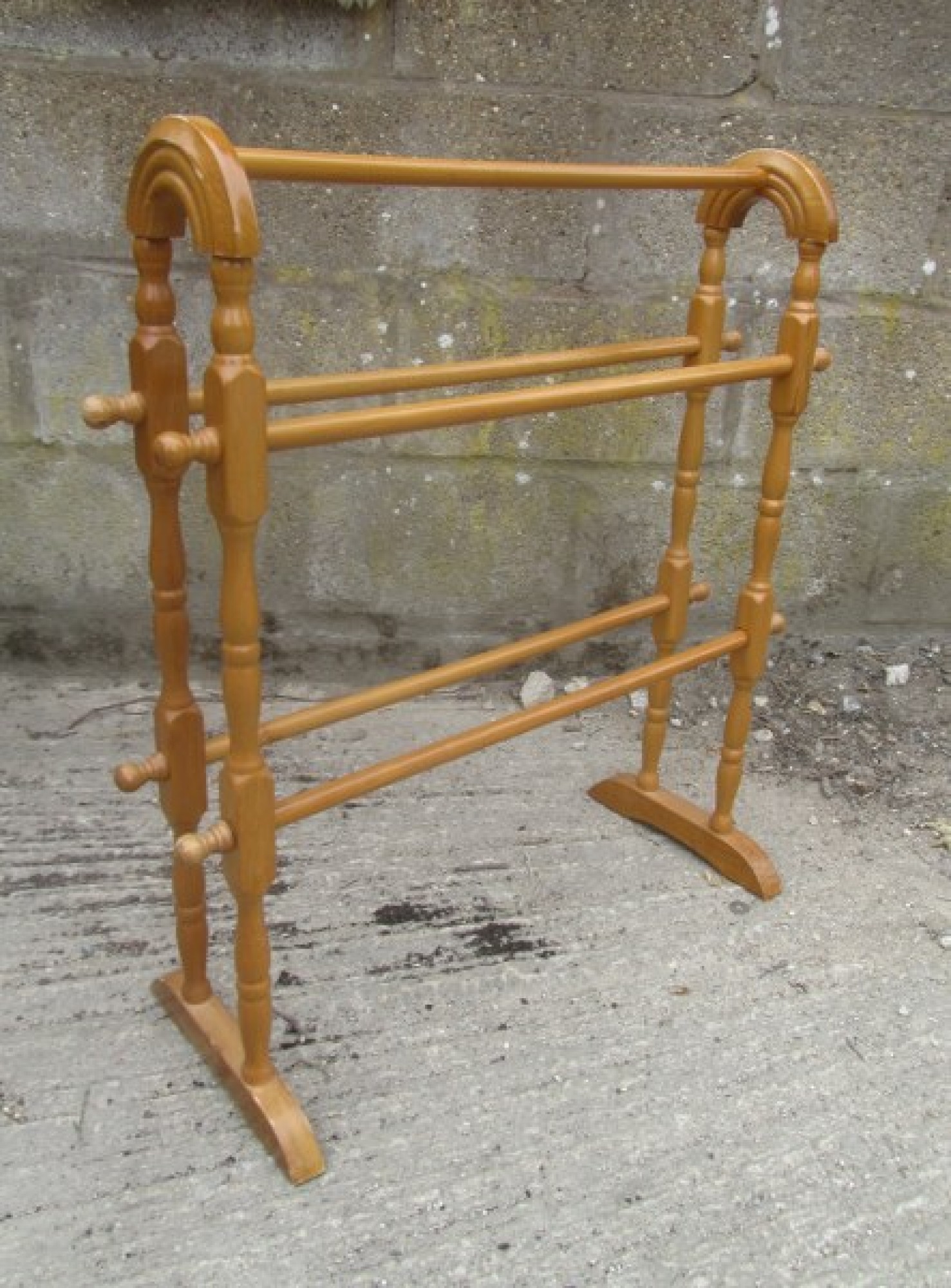 A SMALL TOWEL RAIL MADE FROM SOLID WOOD. IT IT OF SIMPLE CONSTRUCTION, STRONG AND STURDY. IDEAL FOR A BATHROOM OR ANYWHERE IN THE HOME. A USEFUL PIECE.
