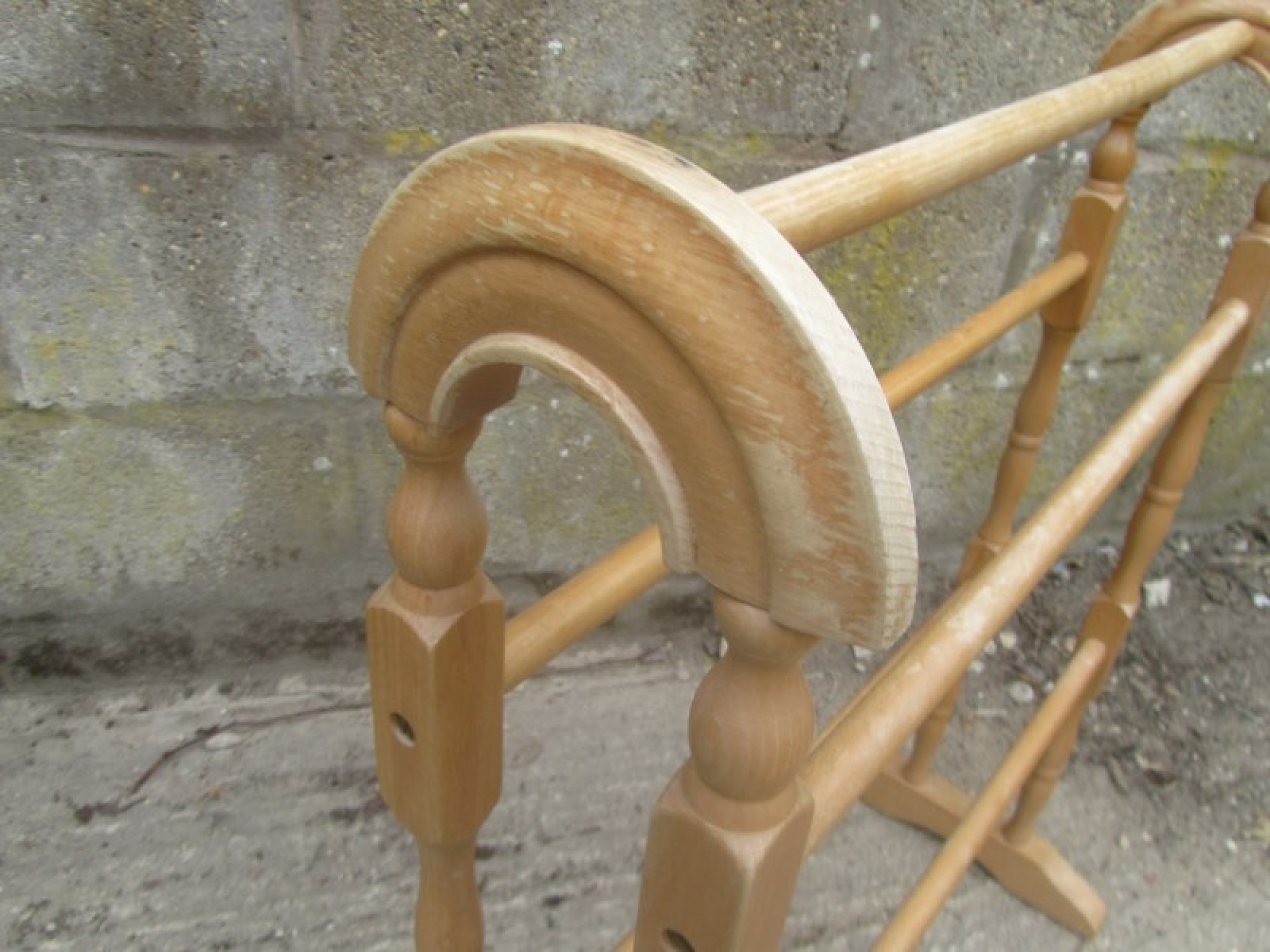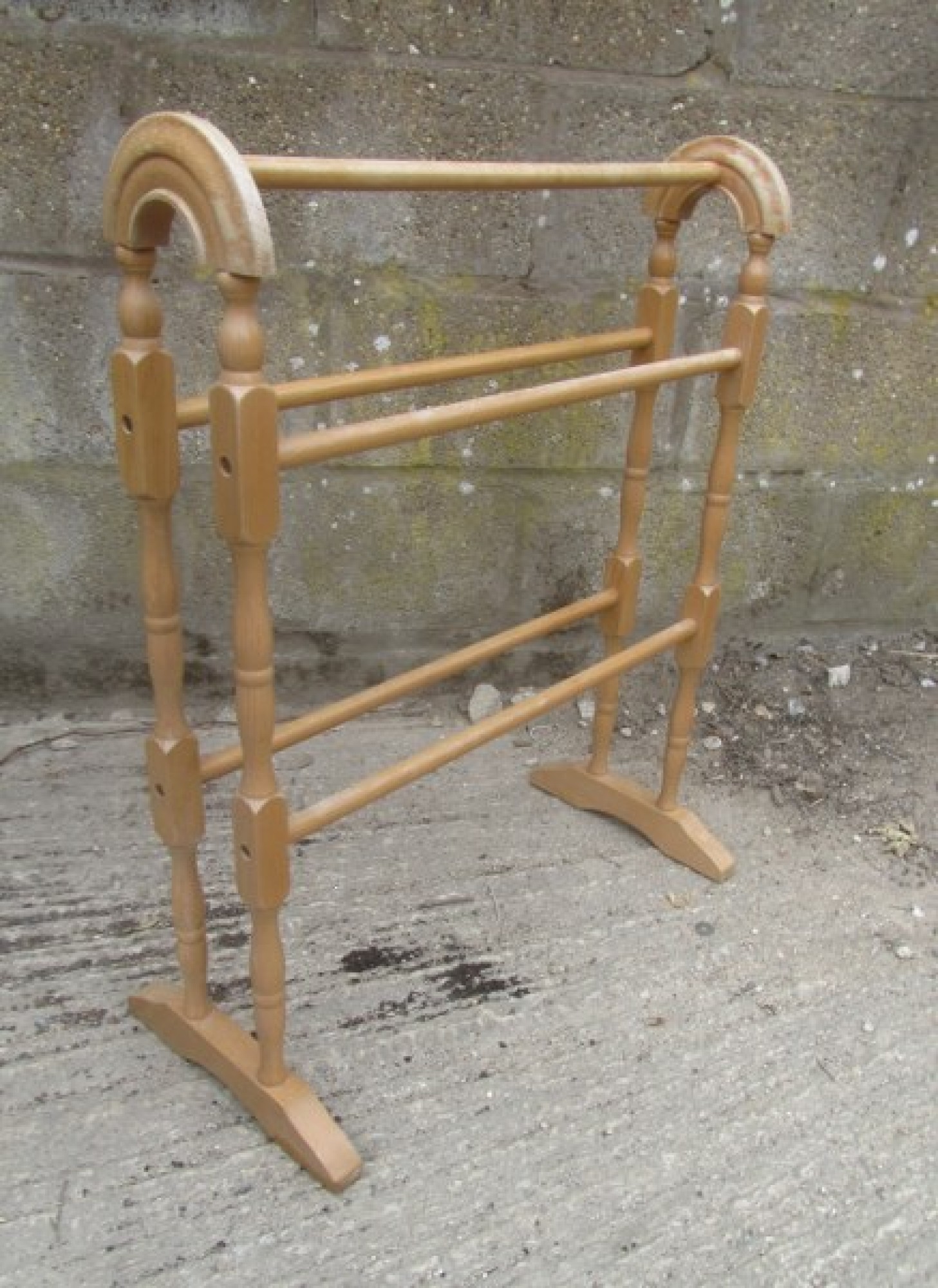 A SMALL TOWEL RAIL MADE FROM SOLID WOOD. IT IT OF SIMPLE CONSTRUCTION, STRONG AND STURDY. IDEAL FOR A BATHROOM OR ANYWHERE IN THE HOME. A USEFUL PIECE.