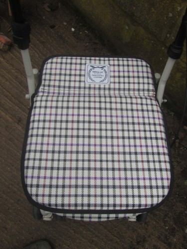 A SHOPPING TROLLEY WITH MATERIAL BAG AND METAL FRAME. SEAT WITH FOLD UP BACK REST.