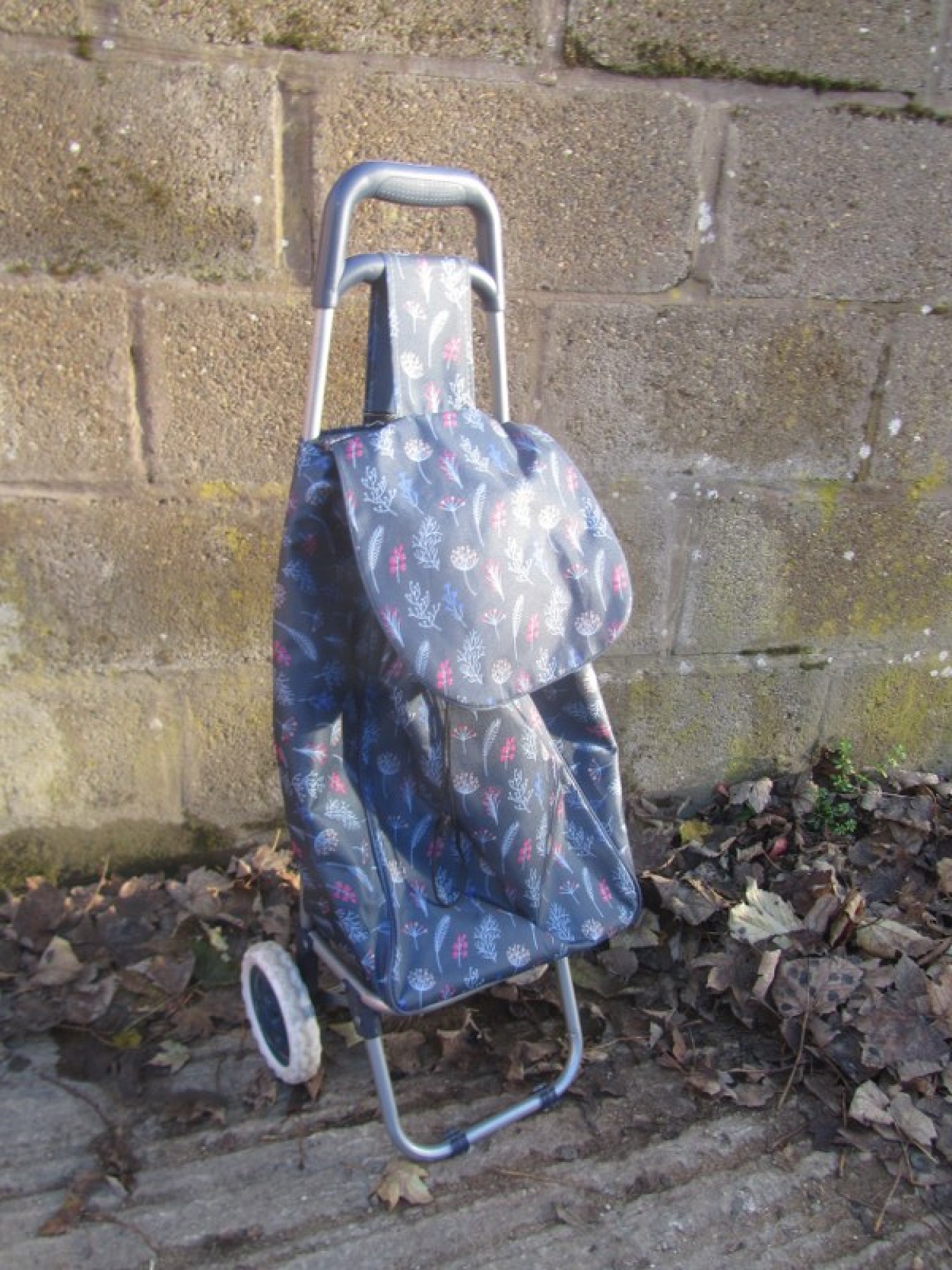 A SHOPPING TROLLEY WITH MATERIAL BAG AND METAL FRAME.