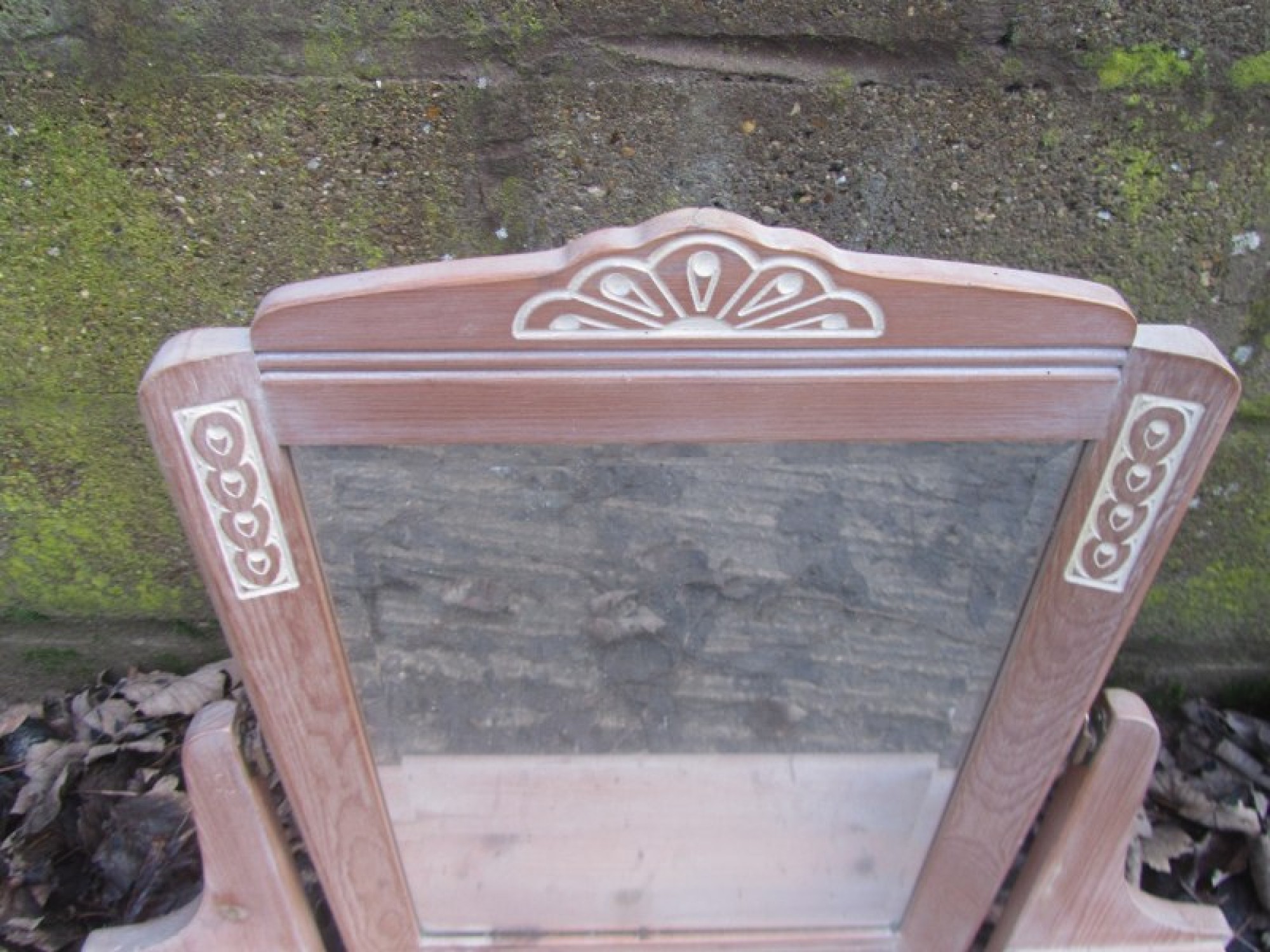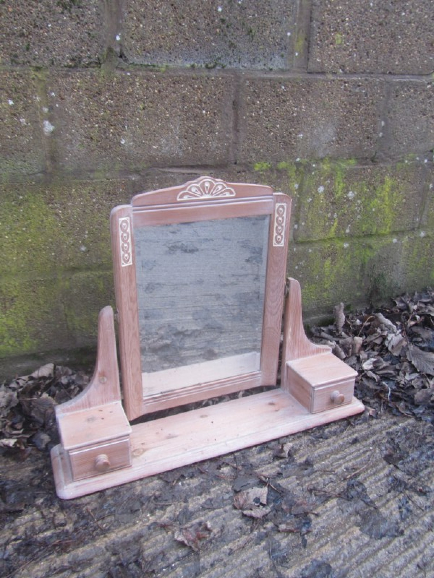 THIS IS SOLID PINE. IT IS A DRESSING TABLE MIRROR, THERE IS A LARGE CENTRAL MIRROR. IT NEEDS FITTING TO A TABLE TOP SO IT DOESN'T TIP OVER.