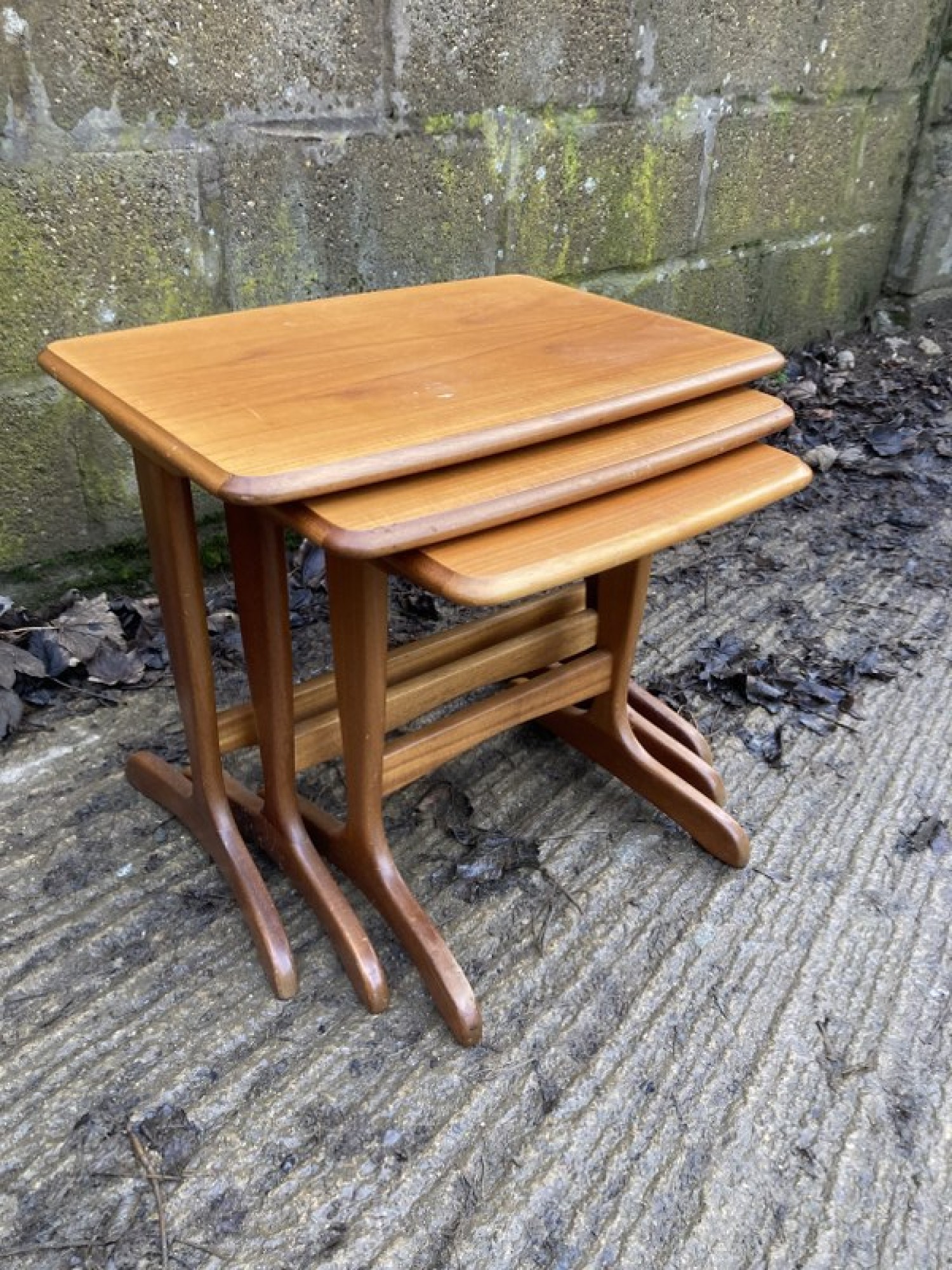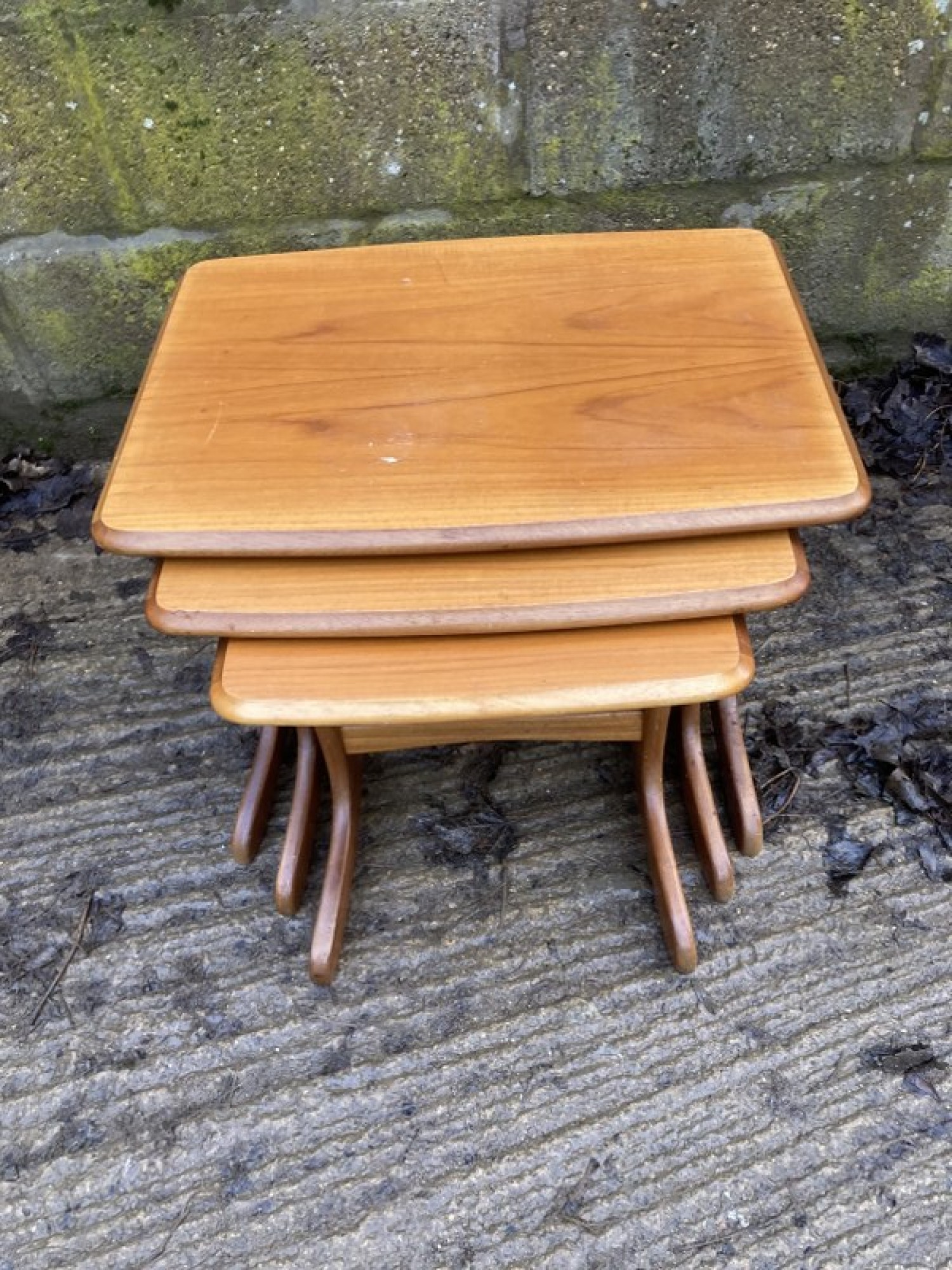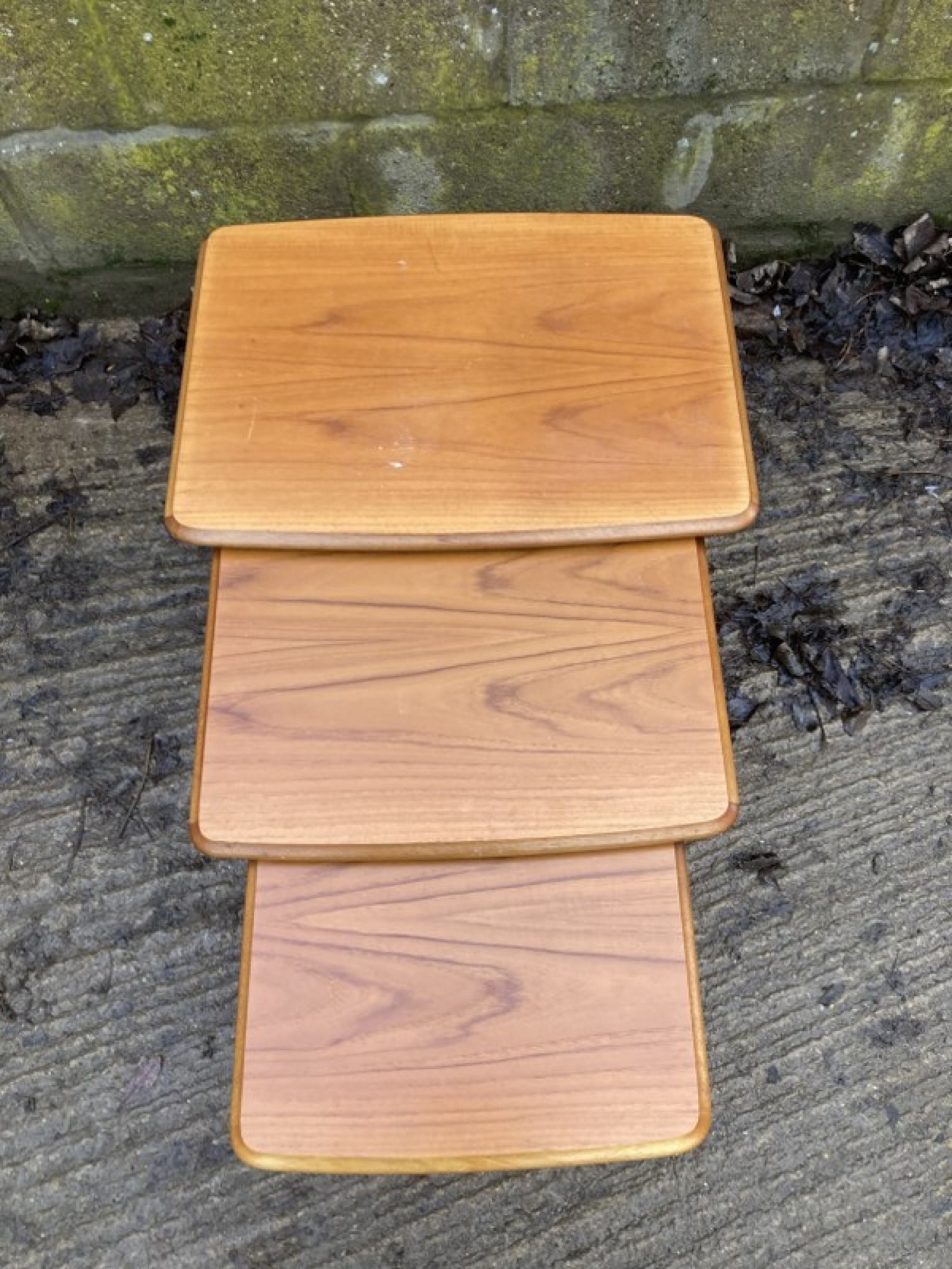 THIS IS A SET OF 3 TABLES. THE TABLES ARE STRONG AND STURDY, TEAK VENEERED TOPS. A STYLISH SET. SOME MARKS AND WEAR.
