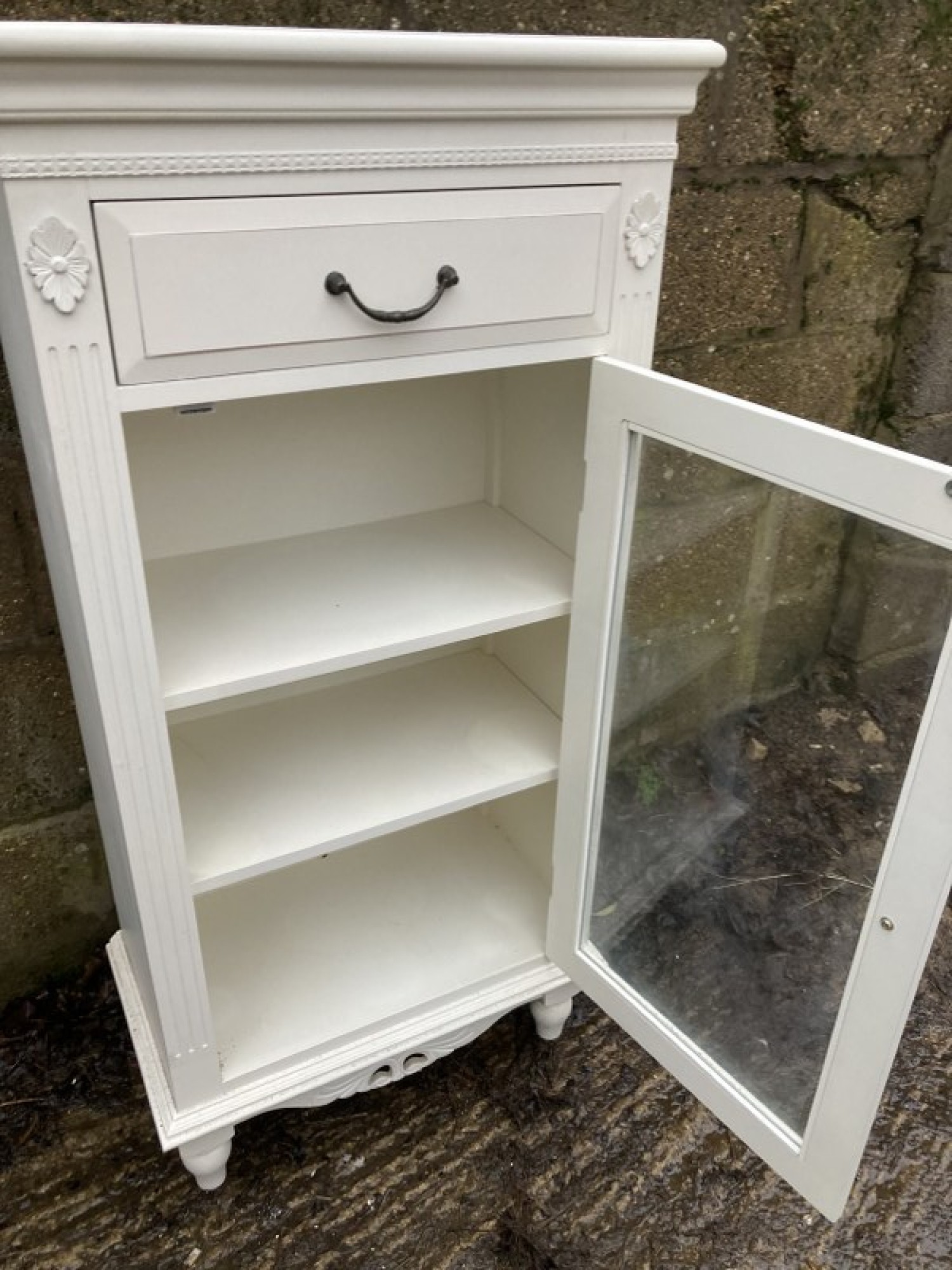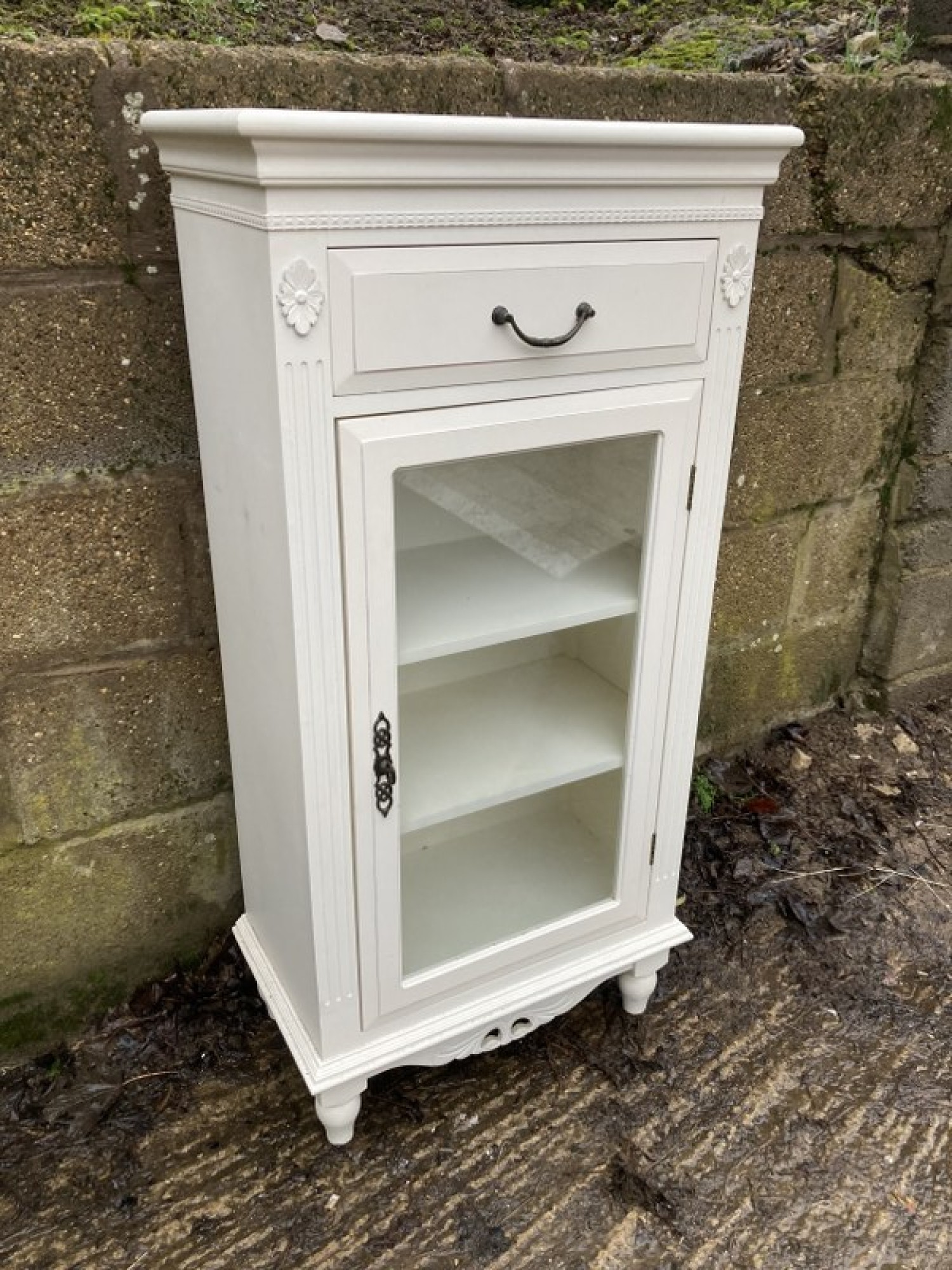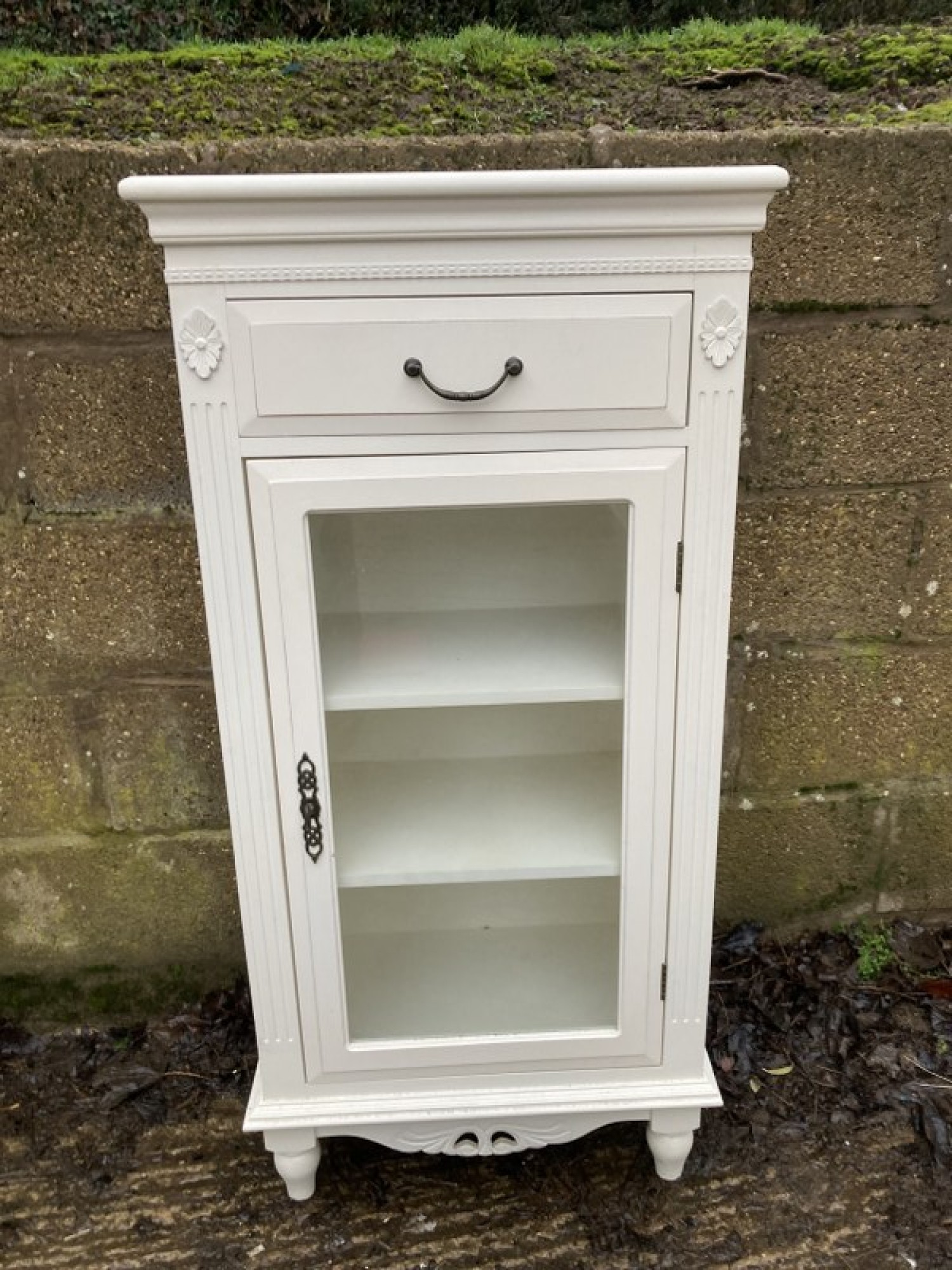 THIS IS A MODERN CABINET. IT IS WHITE. GLAZED DOOR.