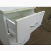 THIS IS A SMALL BEDSIDE CABINET. IT IS WHITE MELAMINE WITH HANDLES. MINOR WEAR AND TEAR.