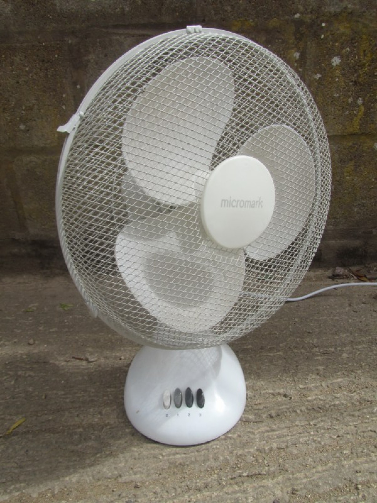 A DESK FAN, IN PLASTIC, IT OSCILLATES, IT HAS PLASTIC BLADES.