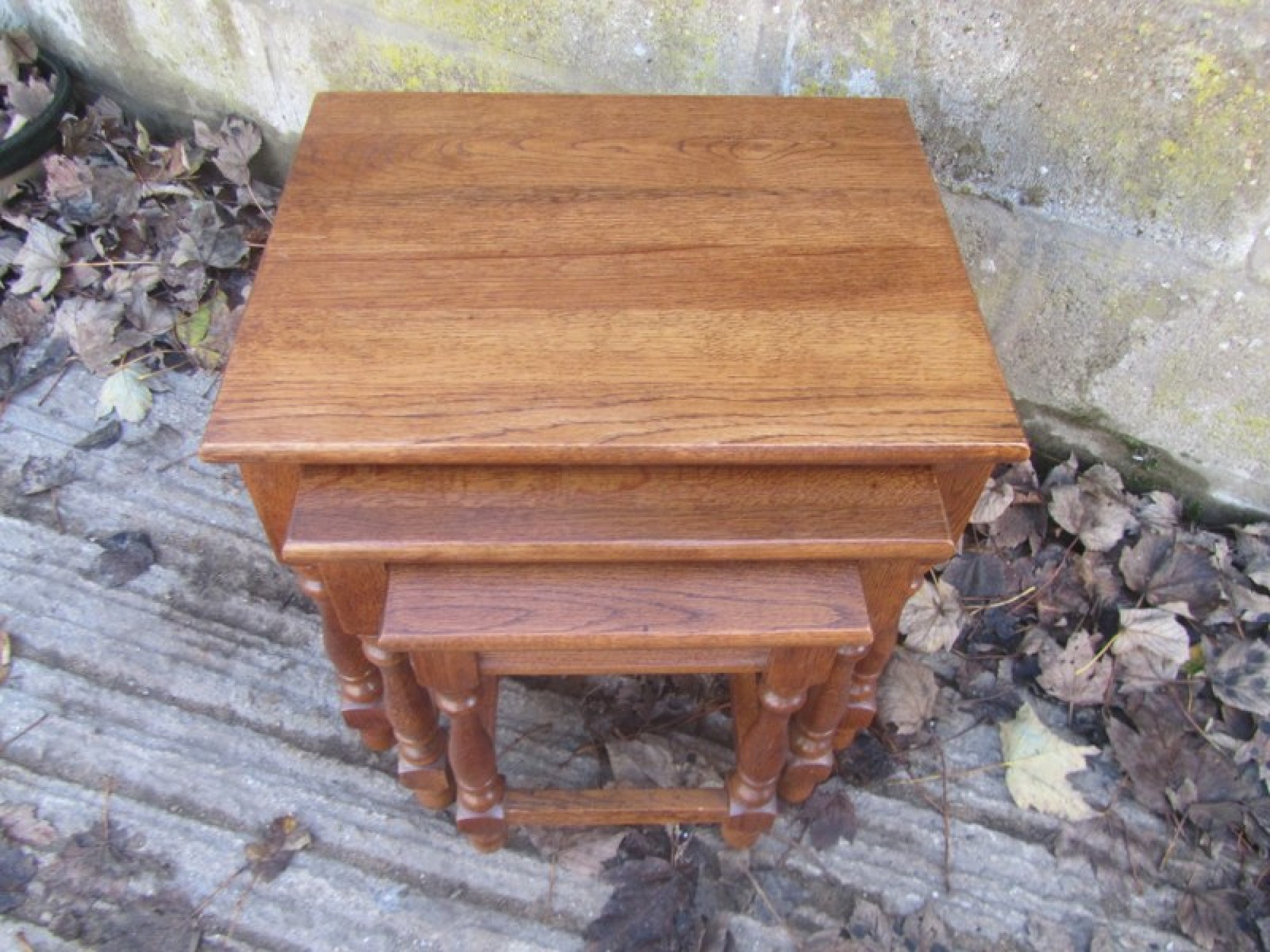 THIS IS A NEST OF 3 SOLID OAK TABLES. THEY ARE A GREAT SET, IDEAL AS COFFEE TABLES, OR OCCASIONAL TABLES. THEY ARE IN GOOD CONDITION, STRONG AND STURDY. THE 2 SMALL TABLES NEATLY SIT INSIDE THE LARGE TABLE, SO DON'T TAKE UP MUCH SPACE WHEN NOT IN USE. SOME LIGHT WEAR.