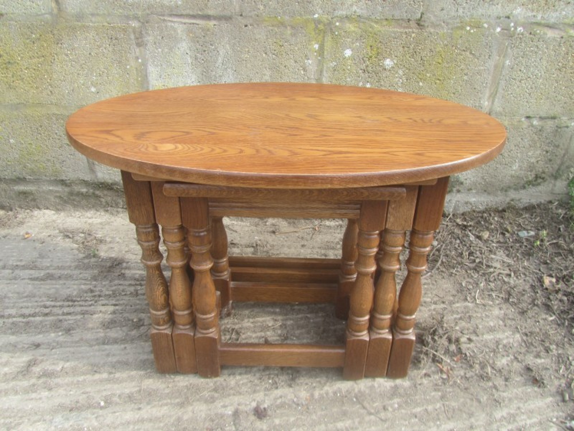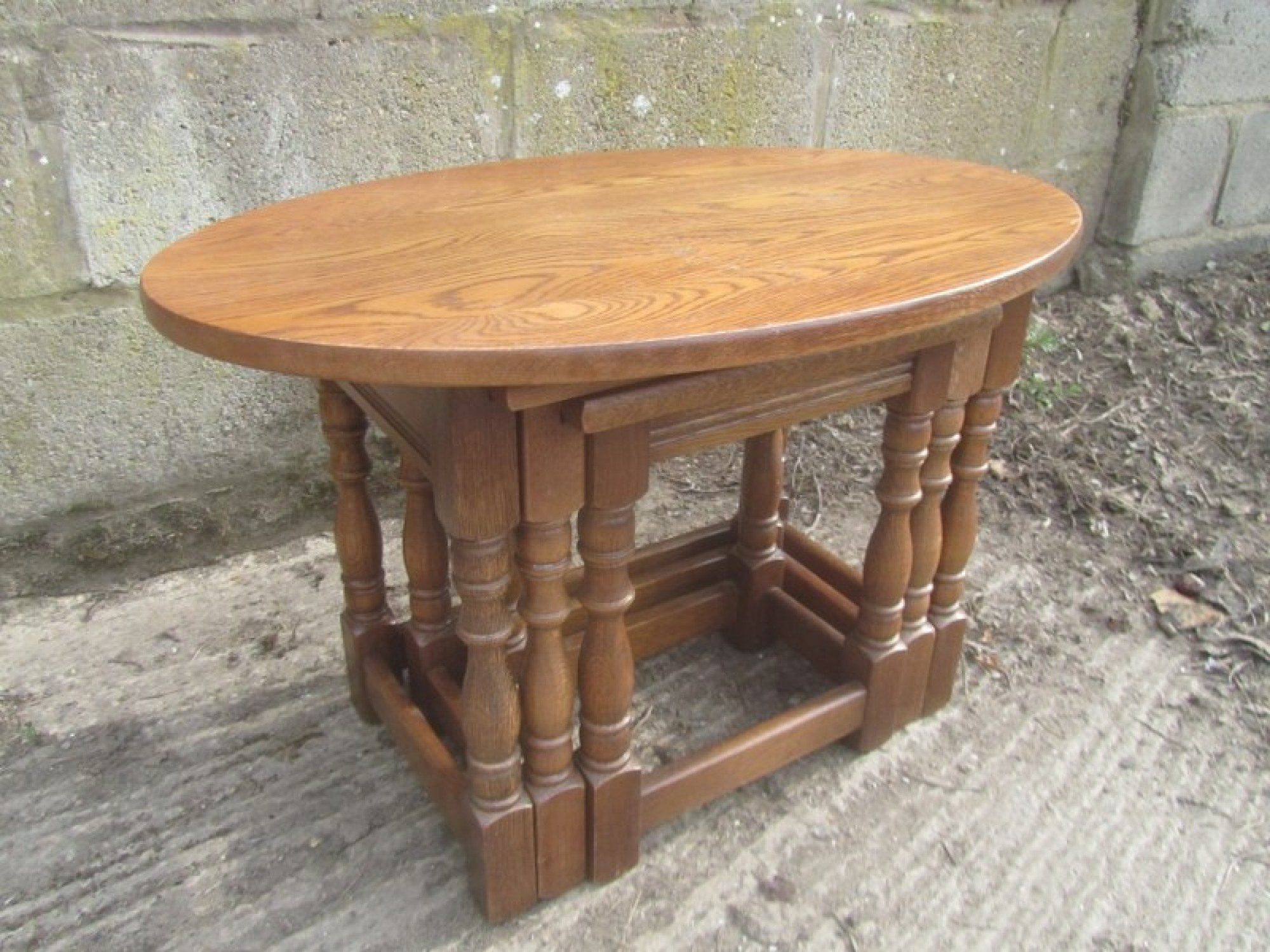 THIS IS A NEST OF 3 SOLID OAK TABLES. THEY ARE A GREAT SET, IDEAL AS COFFEE TABLES, OR OCCASIONAL TABLES. THEY ARE IN GOOD CONDITION, STRONG AND STURDY. THE 2 SMALL TABLES NEATLY SIT INSIDE THE LARGE TABLE, SO DON'T TAKE UP MUCH SPACE WHEN NOT IN USE.