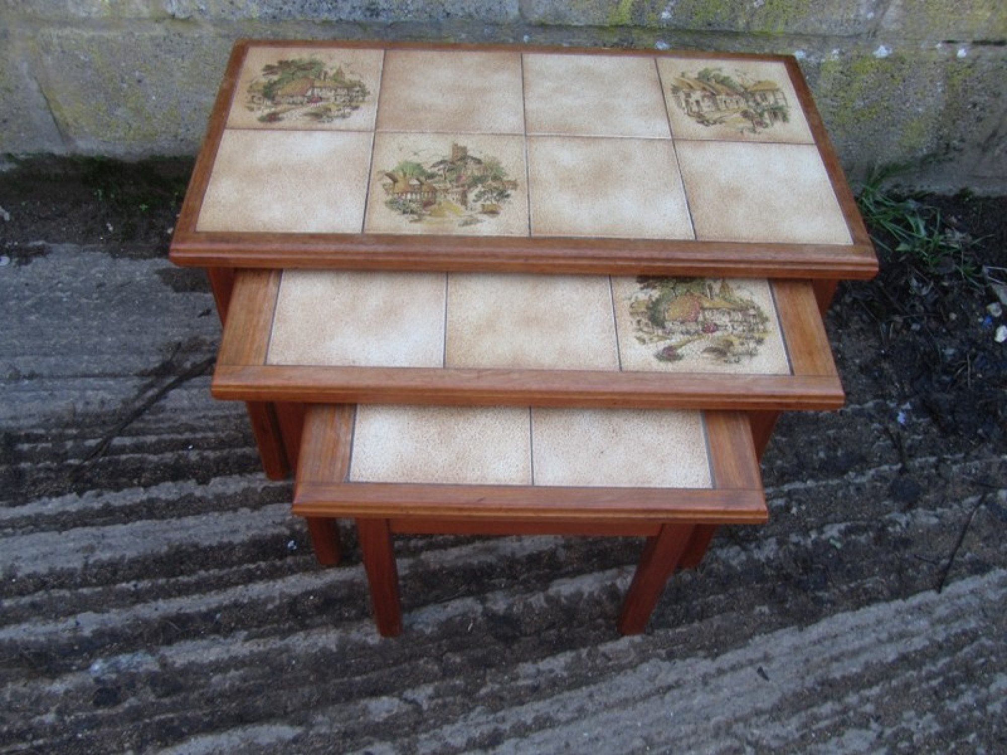 THIS IS A NEST OF 3 TEAK TABLES, A GREAT RETRO SET FROM THE 1960s/70s. IN AVERAGE CONDITION, STRONG AND STURDY. THE TOP IS TILED WITH ORIGINAL TILES. IT HAS A DANISH INFLUENCE ON THE DESIGN, A LOOK SO SOUGHT AFTER AT THE MOMENT.