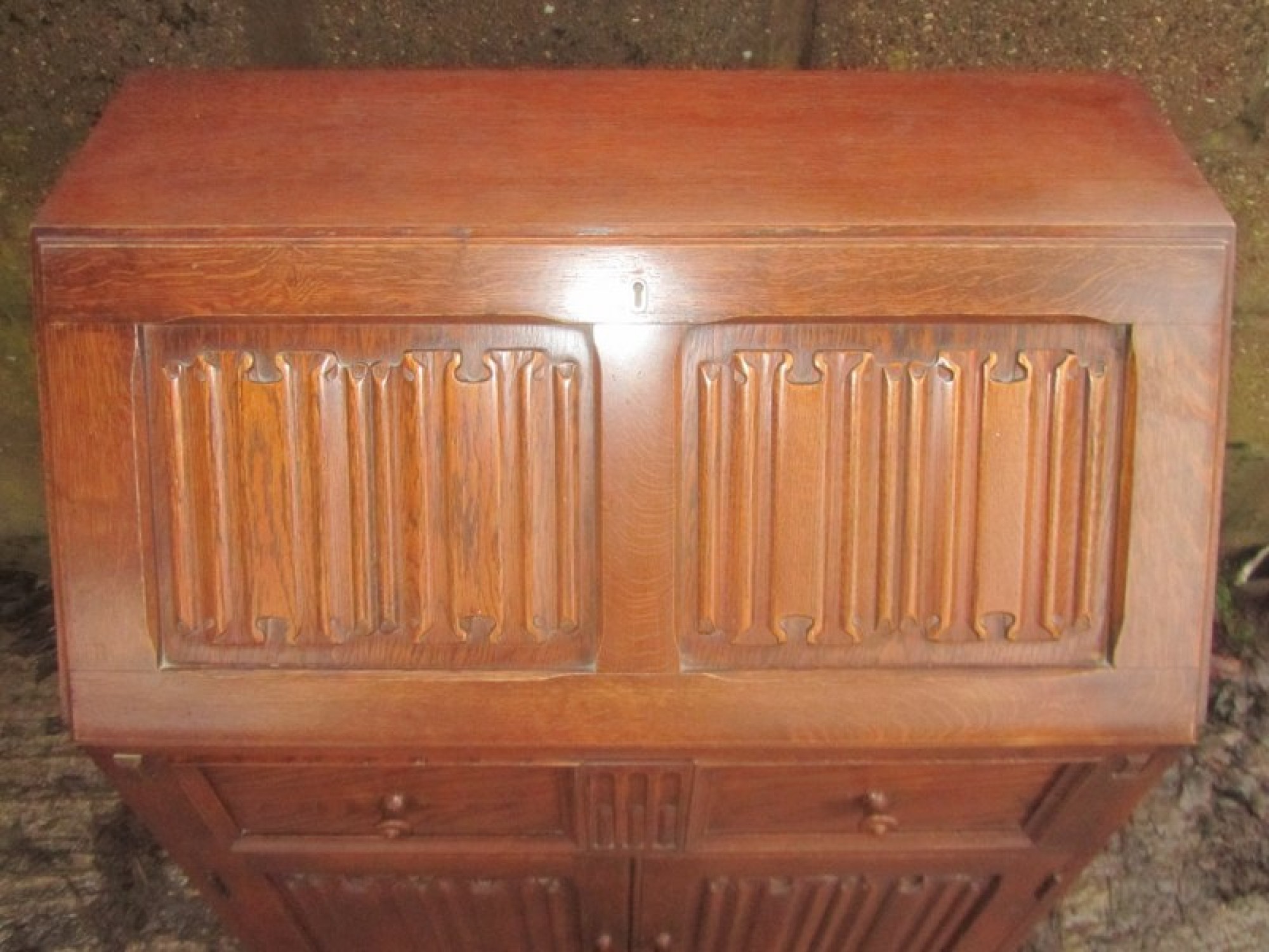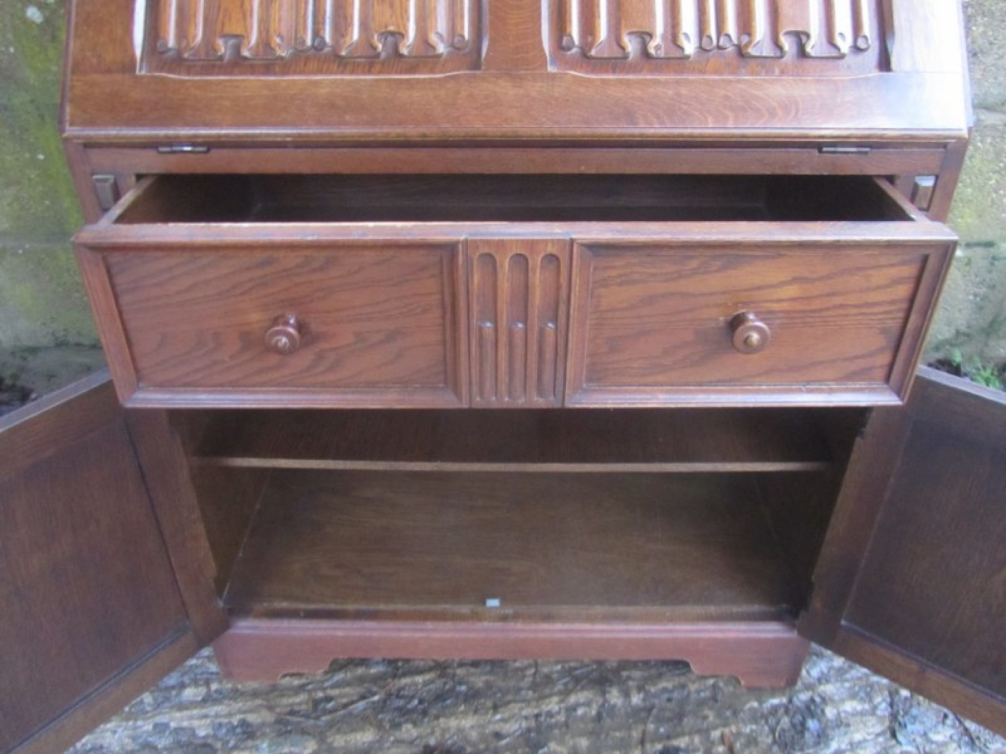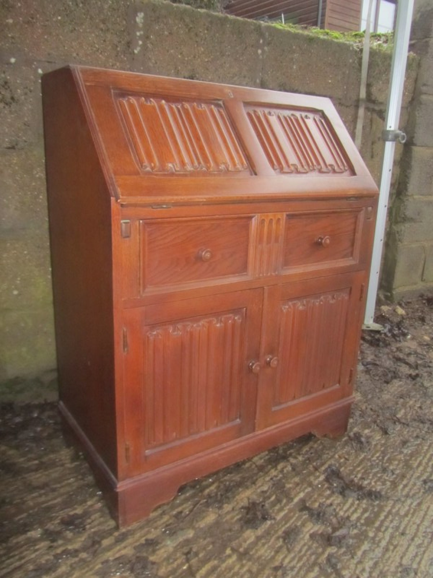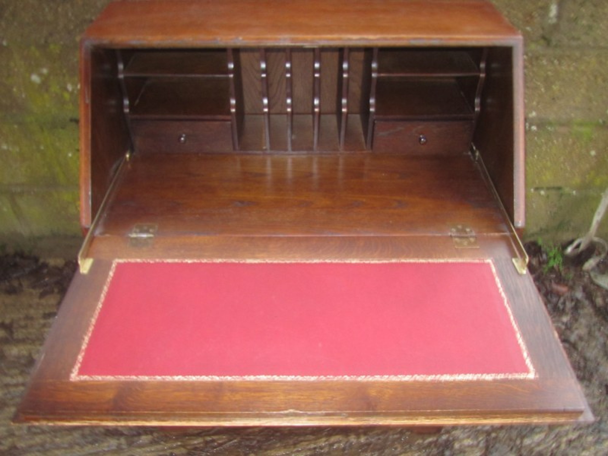 THIS IS A BUREAU FROM THE MID - LATE 20th CENTURY. IT IS OAK, SOLID & VENEERED, THE TOP SECTION HAS A DROP DOWN FRONT WHICH IS SELF SUPPORTING, INSIDE THE BUREAU IT IS FITTED WITH PIGEON HOLES.