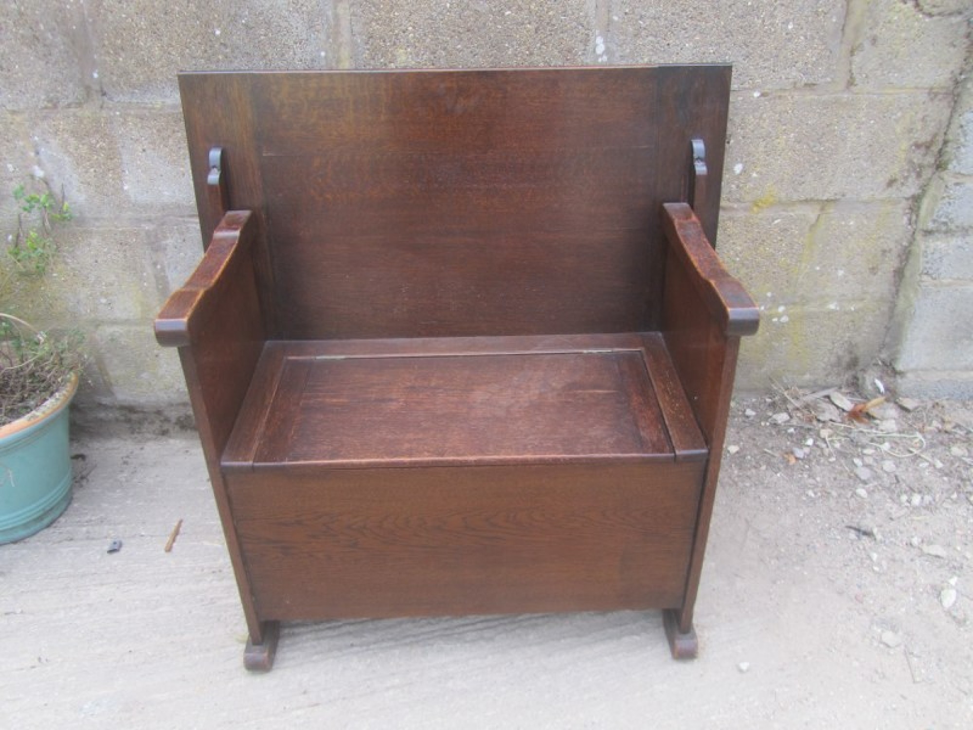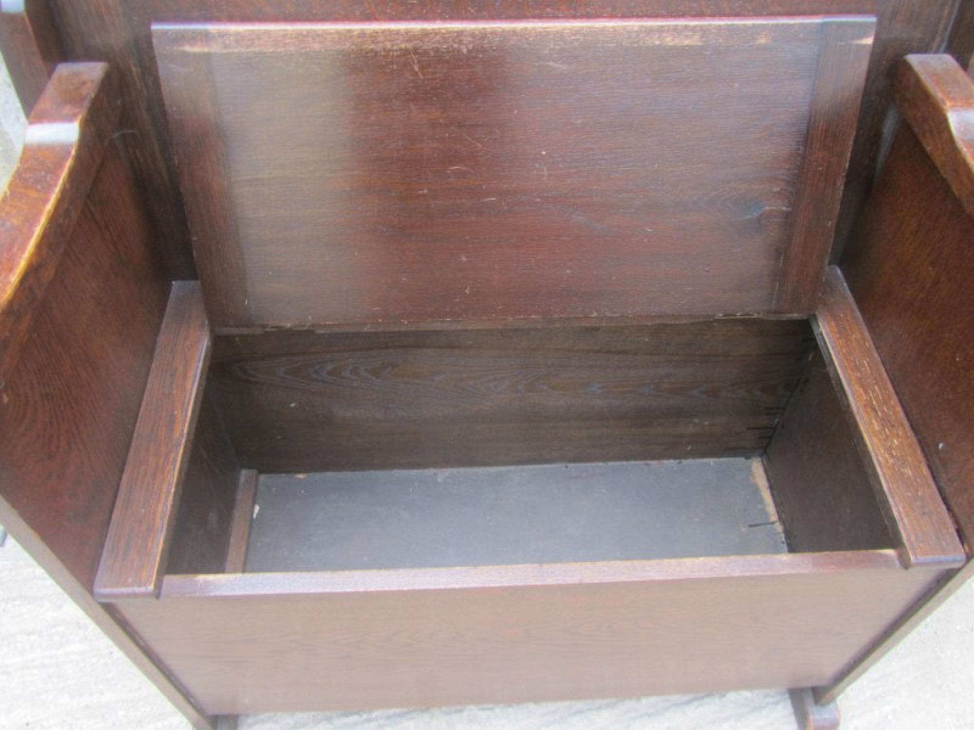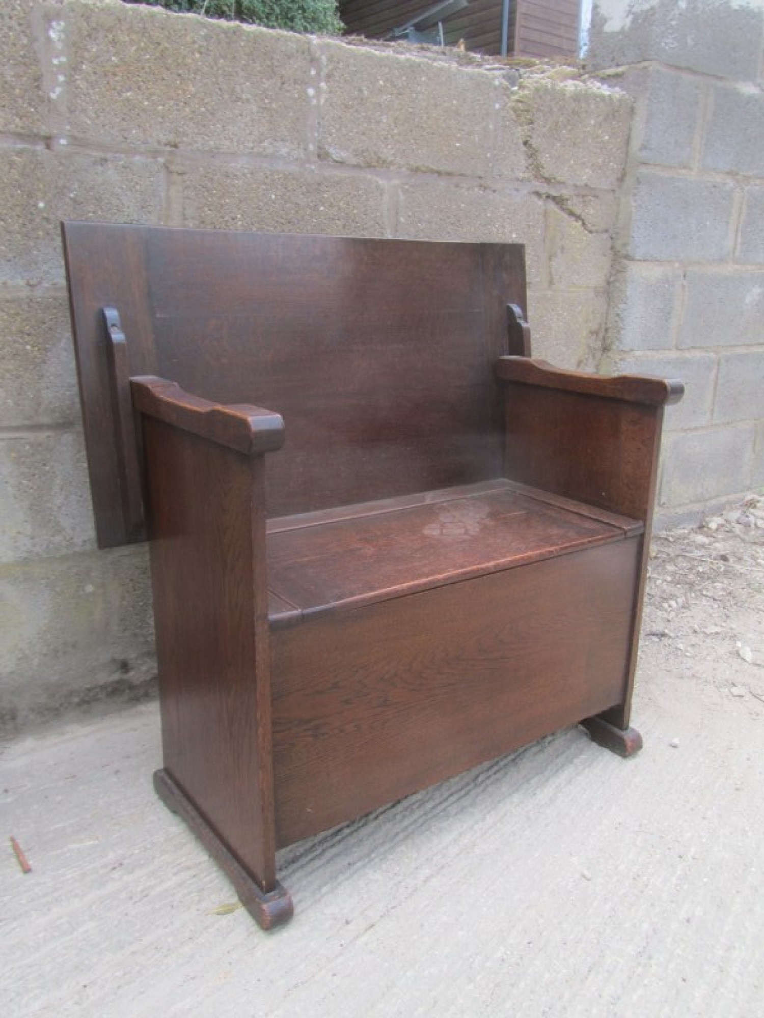 THIS IS AN OAK MONKS BENCH. LIFT UP SEAT WITH STORAGE BELOW. IT IS SOLID OAK, STRONG AND STURDY, SOME WEAR. THE BACK REST SLIDES OVER TO CONVERT IT TO A SIDE TABLE. IN AVERAGE CONDITION.