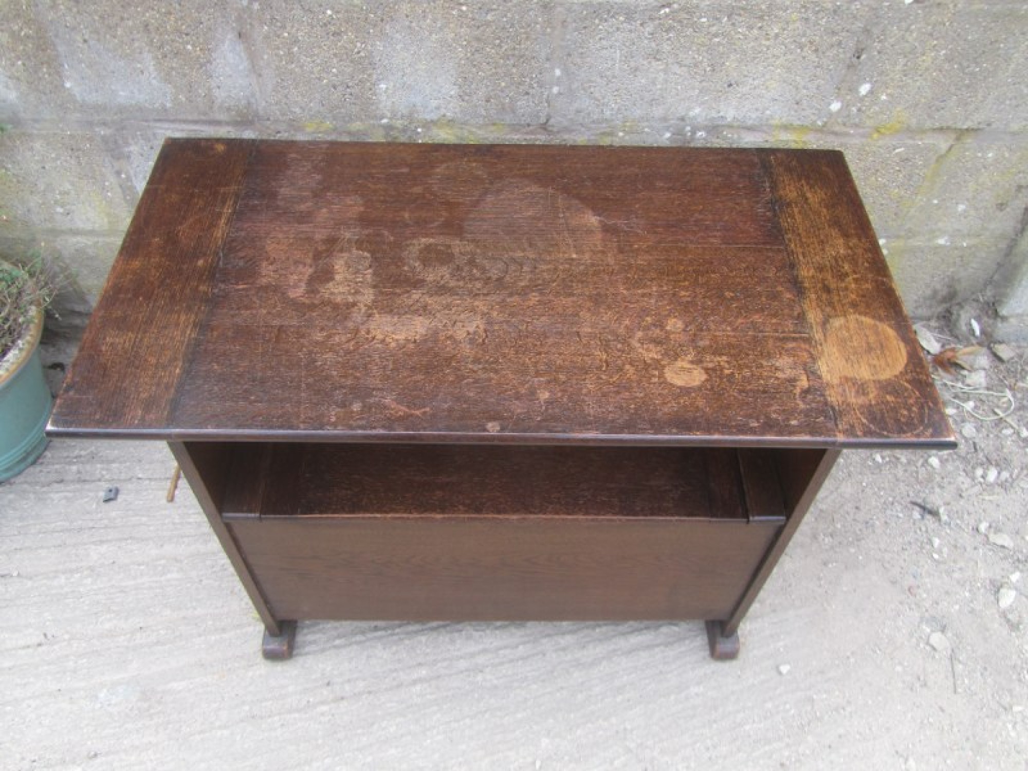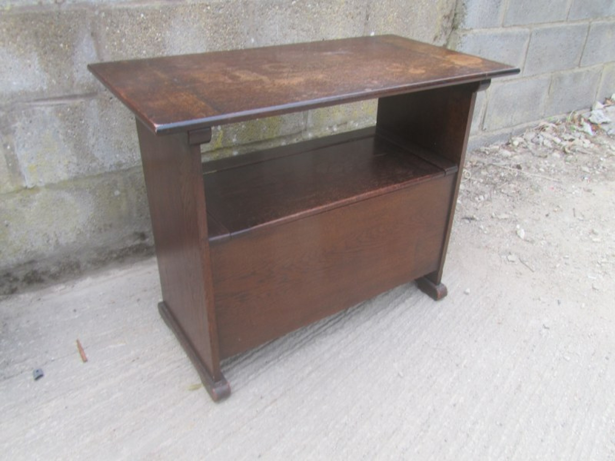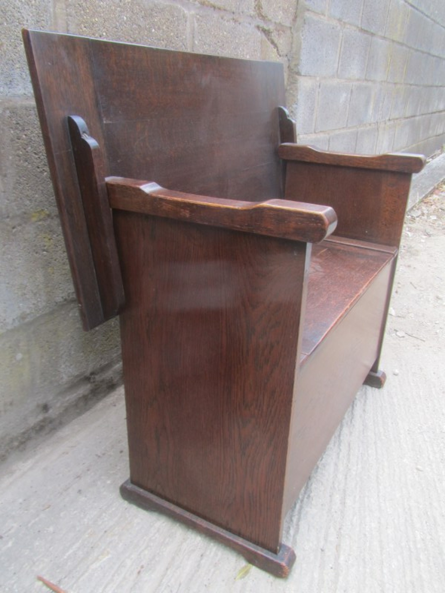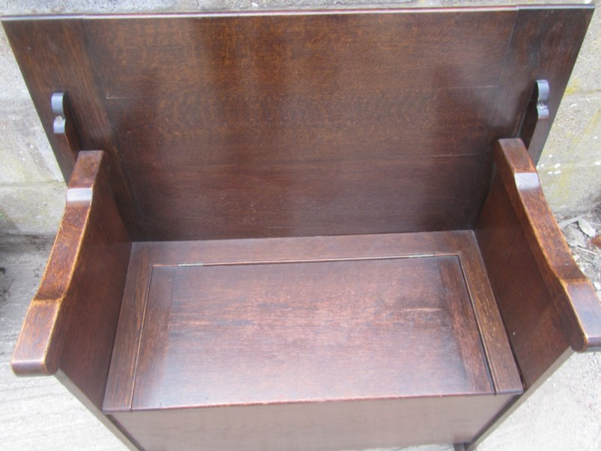 THIS IS AN OAK MONKS BENCH. LIFT UP SEAT WITH STORAGE BELOW. IT IS SOLID OAK, STRONG AND STURDY, SOME WEAR. THE BACK REST SLIDES OVER TO CONVERT IT TO A SIDE TABLE. IN AVERAGE CONDITION.
