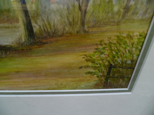 A WATERCOLOUR PAINTING OF TREES & RIVER. IT IS SIGNED.