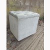 A SMALL FOOTSTOOL WITH A GREEN PADDED TOP. EASY TO RECOVER. THE TOP LIFTS UP, THERE IS STORAGE SPACE INSIDE.