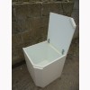 A PAINTED CORNER STORAGE BOX, PAINTED OVER MELAMINE. BASIC CONSTRUCTION.