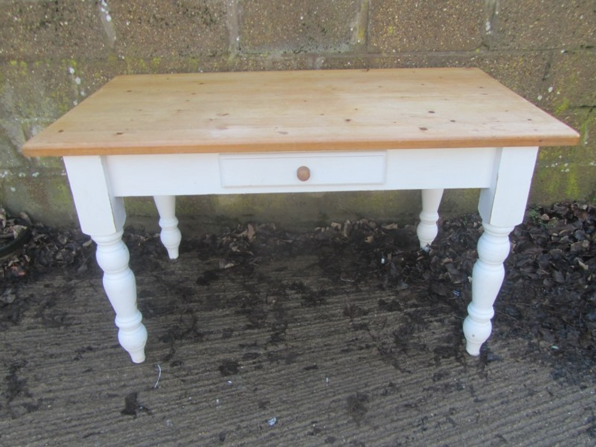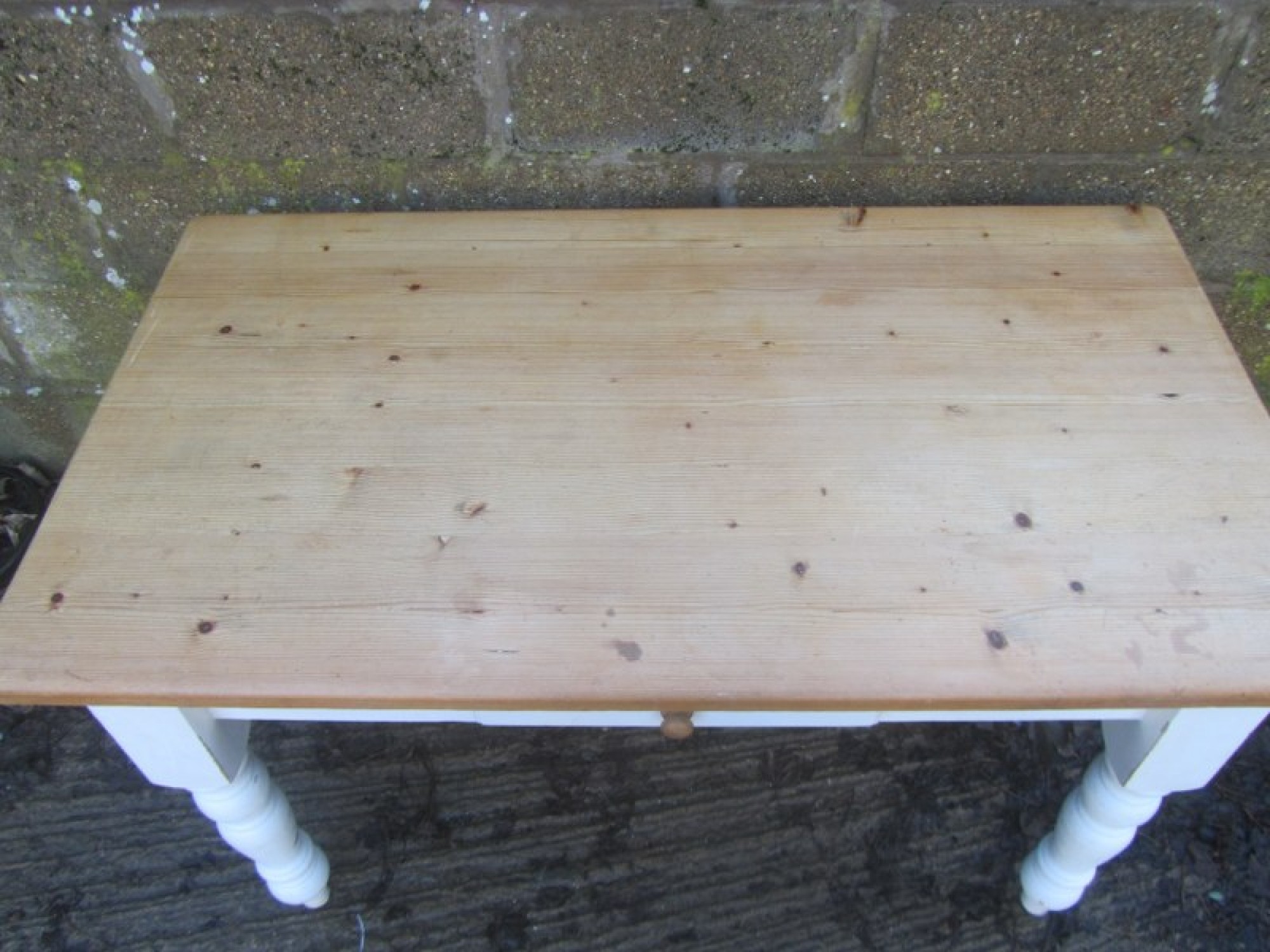 A LARGE SOLID PINE DINING TABLE TO SEAT 4 - 6 DINERS. THE BASE HAS BEEN PAINTED. THE LEGS SCREW IN TO THE TABLE TOP, THEY ARE ALL SLIGHTLY LOOSE. IT NEEDS REPAIRING BEFORE USE.