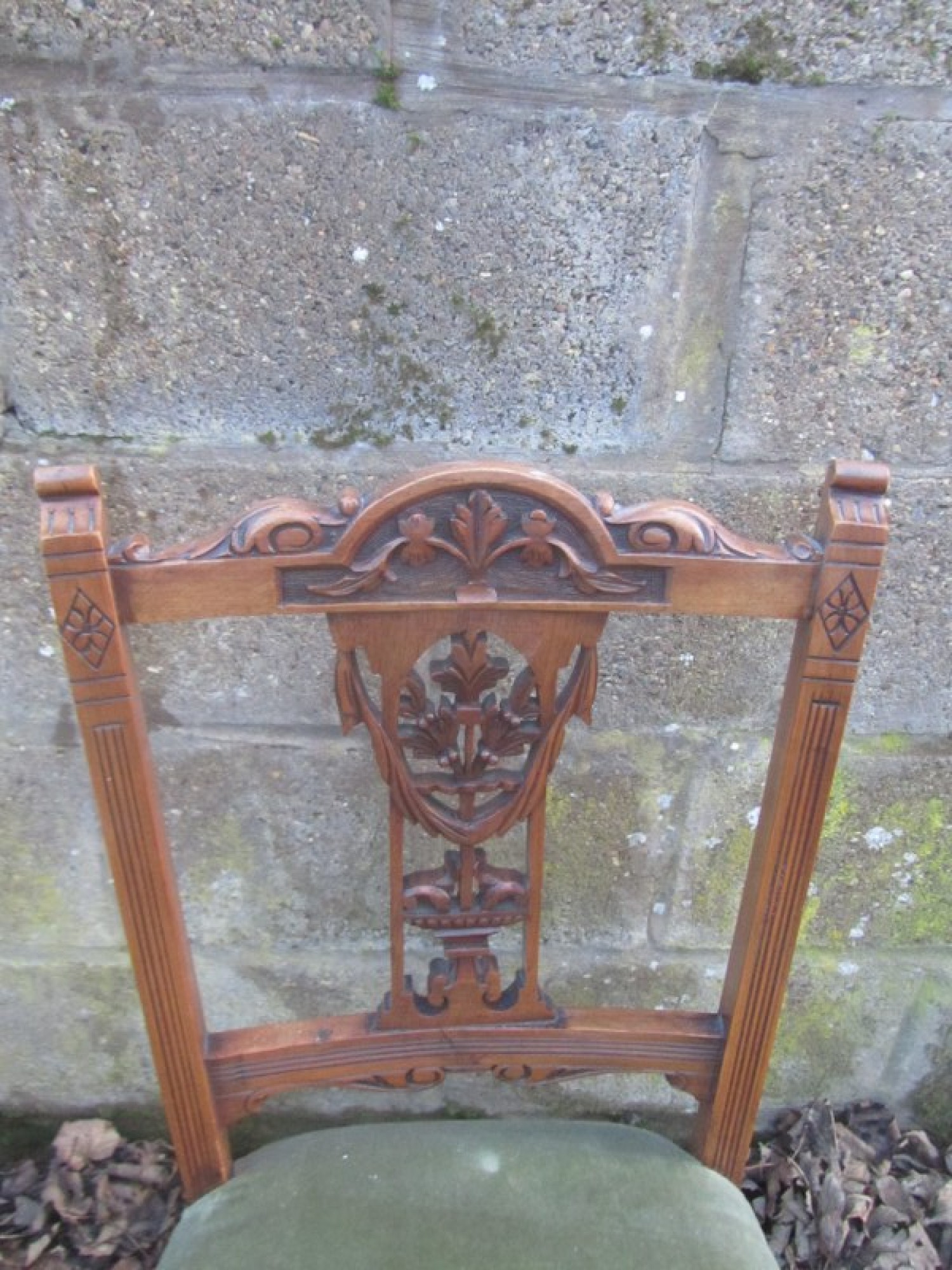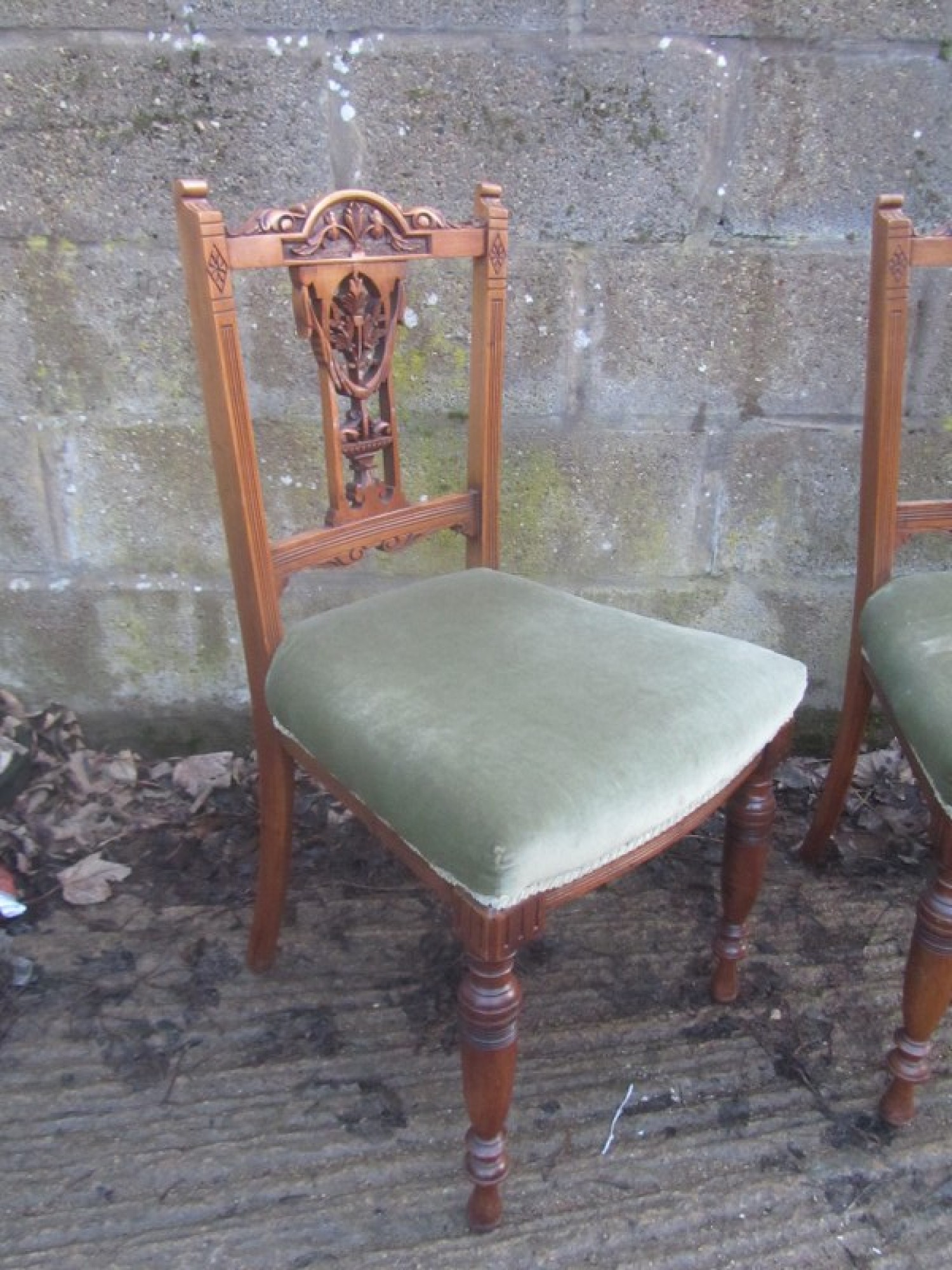 THERE IS DECORATIVE CARVING AT THE TOP OF THE BACK RESTS. THE FRAMES ARE STURDY, MADE FROM SOLID WALNUT. THE UPHOLSTERY IS CLEAN AND IN GOOD CONDITION. IDEAL FOR ANYWHERE IN THE HOME, COULD BE USED AS BEDROOM, HALL OR DINING CHAIRS. HEIGHT TO SEAT IS 46cm.