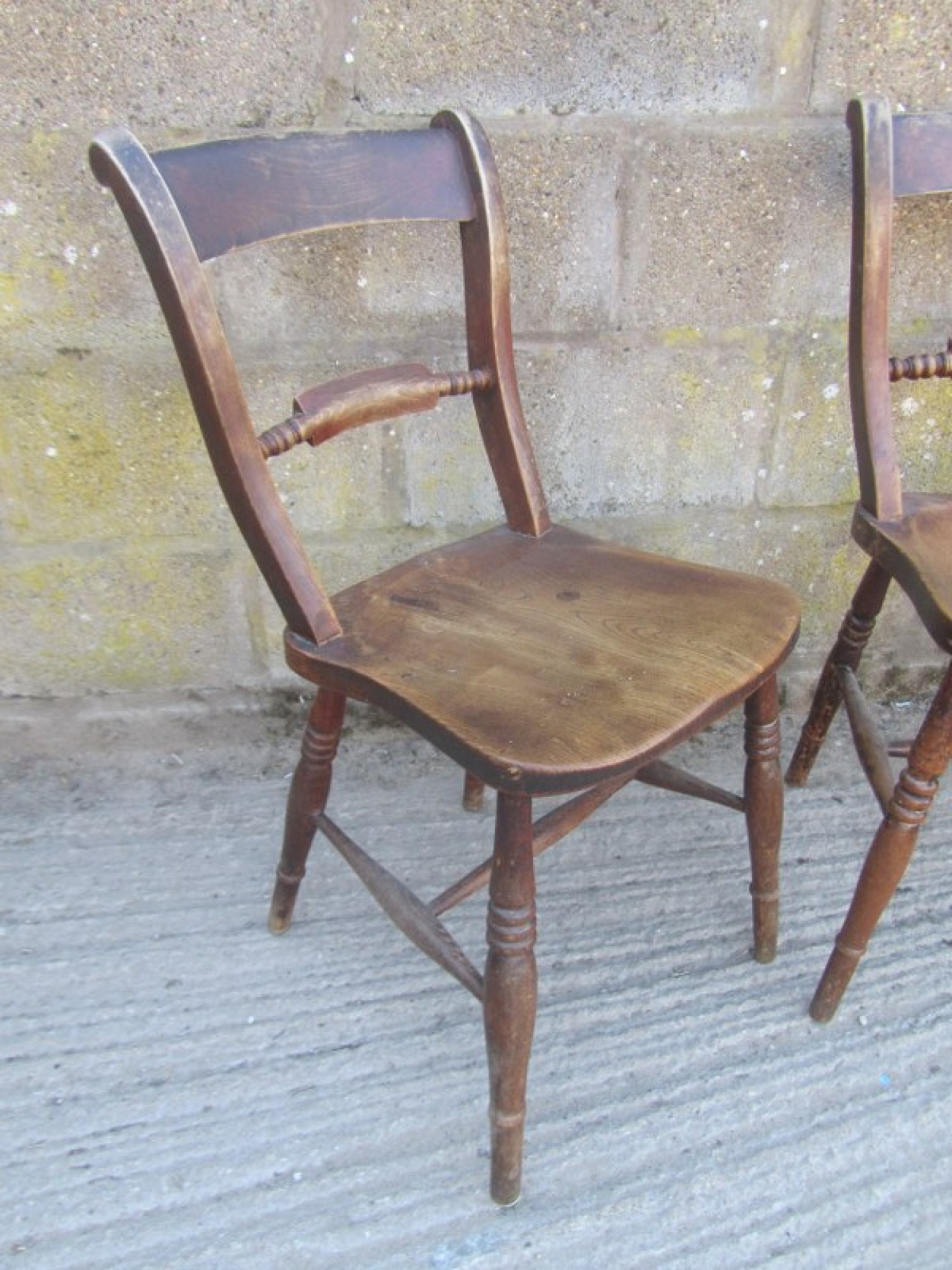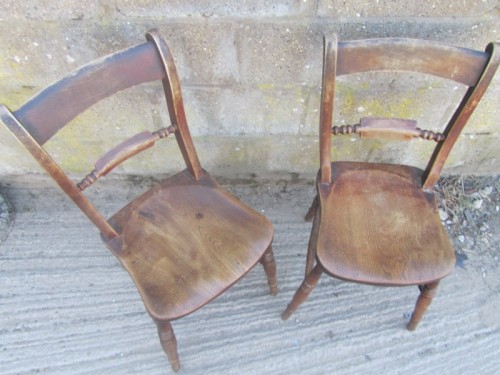 THIS IS A CHARMING PAIR OF SOLID ELM & BEECH KITCHEN CHAIRS. THE SEATS ARE SHAPED. IDEAL FOR ANYWHERE IN THE HOME. NATURAL WEAR AND TEAR, IN AVERAGE CONDITION. SEAT HEIGHT IS 46cm. ONE CHAIR HAS WOODWORM IN THE BOTTOM OF ONE LEG, IT IS NOT SAFE TO USE, HENCE PRICE.