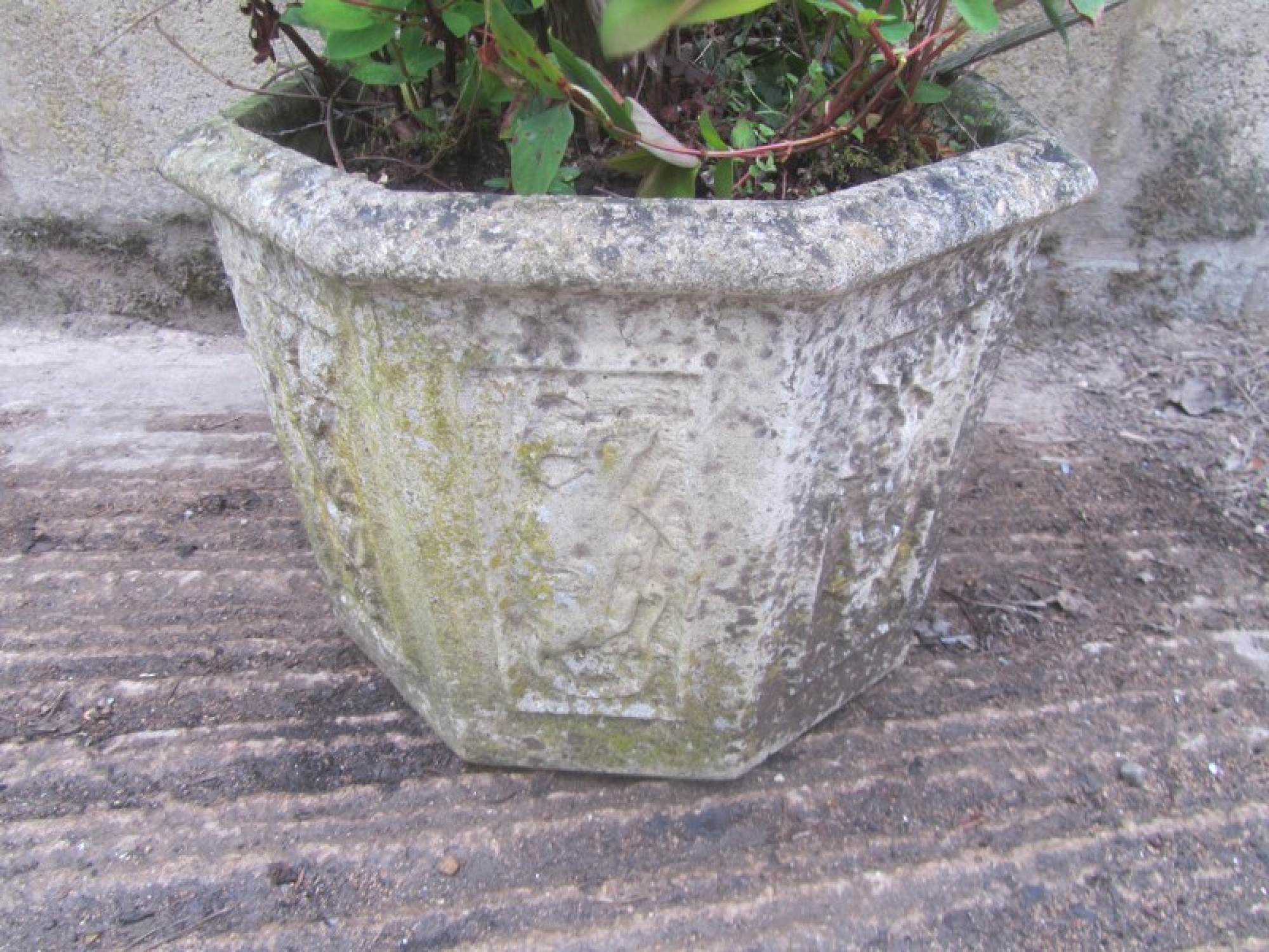 A CAST STONE PLANTER FOR THE GARDEN. IT'S BEEN OUTSIDE FOR YEARS, WITH A WEATHERED LOOK, COMPLETE WITH GREEN STAINING & LICHEN. MADE TO LOOK LIKE WORN LIMESTONE. IT LOOKS VERY OLD, BUT IS PROBABLY ABOUT 20-30 YEARS OLD.