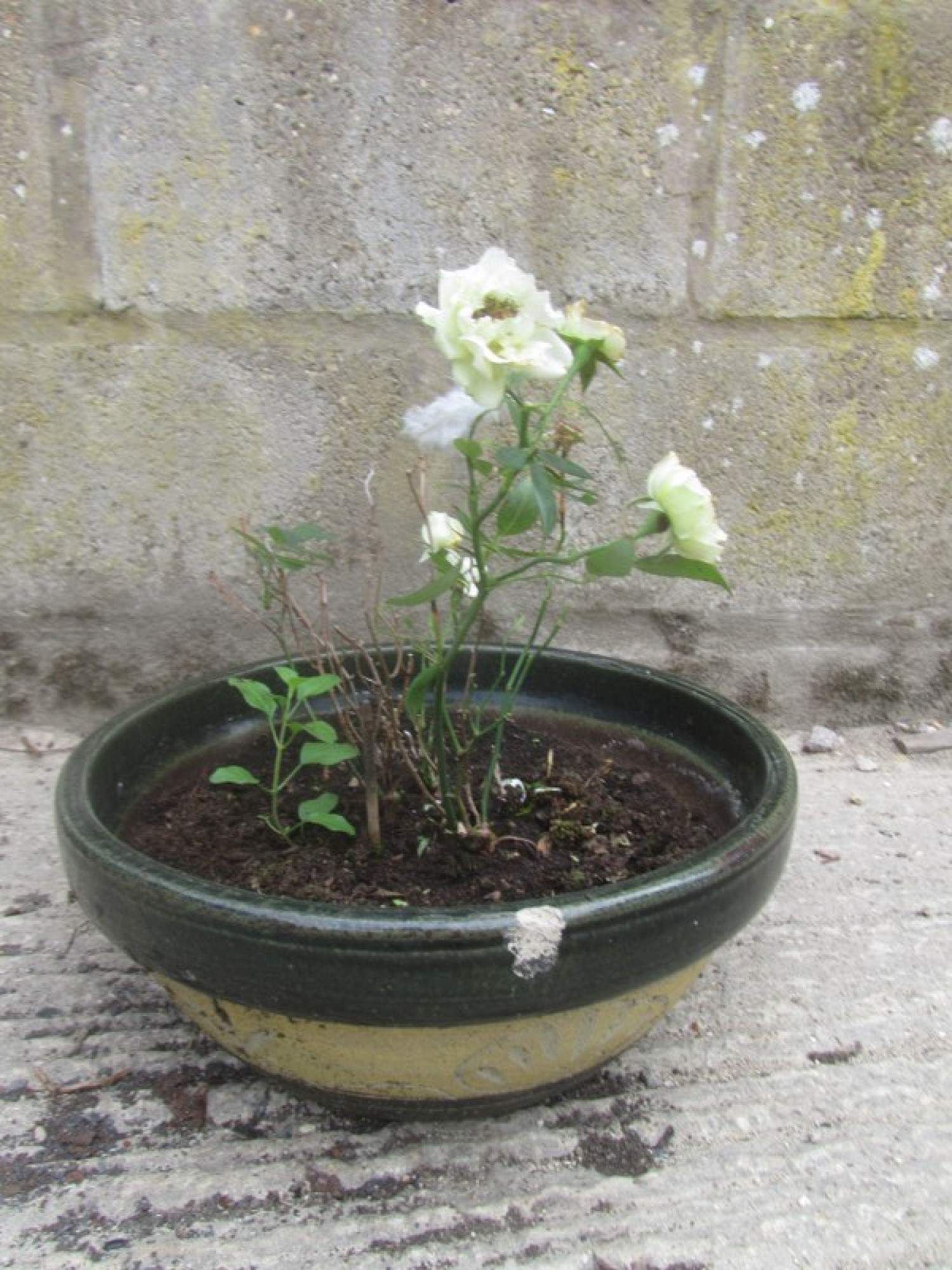 CERAMIC PLANTER FOR THE GARDEN, COULD BE USED INSIDE OR OUTSIDE. WITH A ROSE. SMALL CHIP.