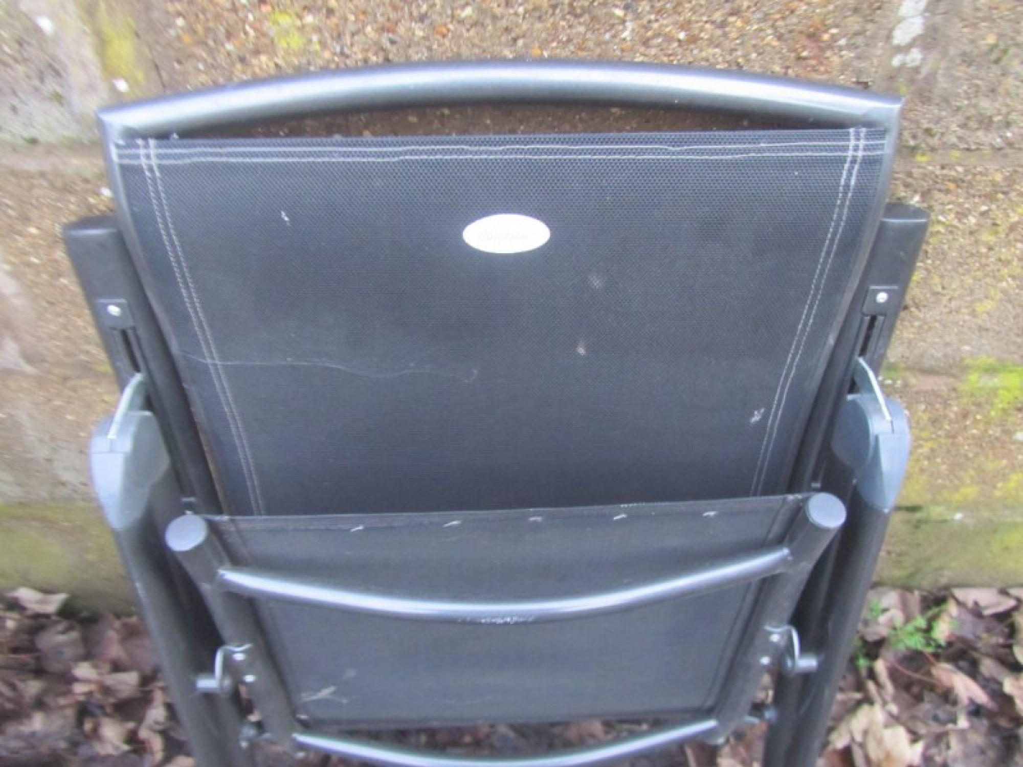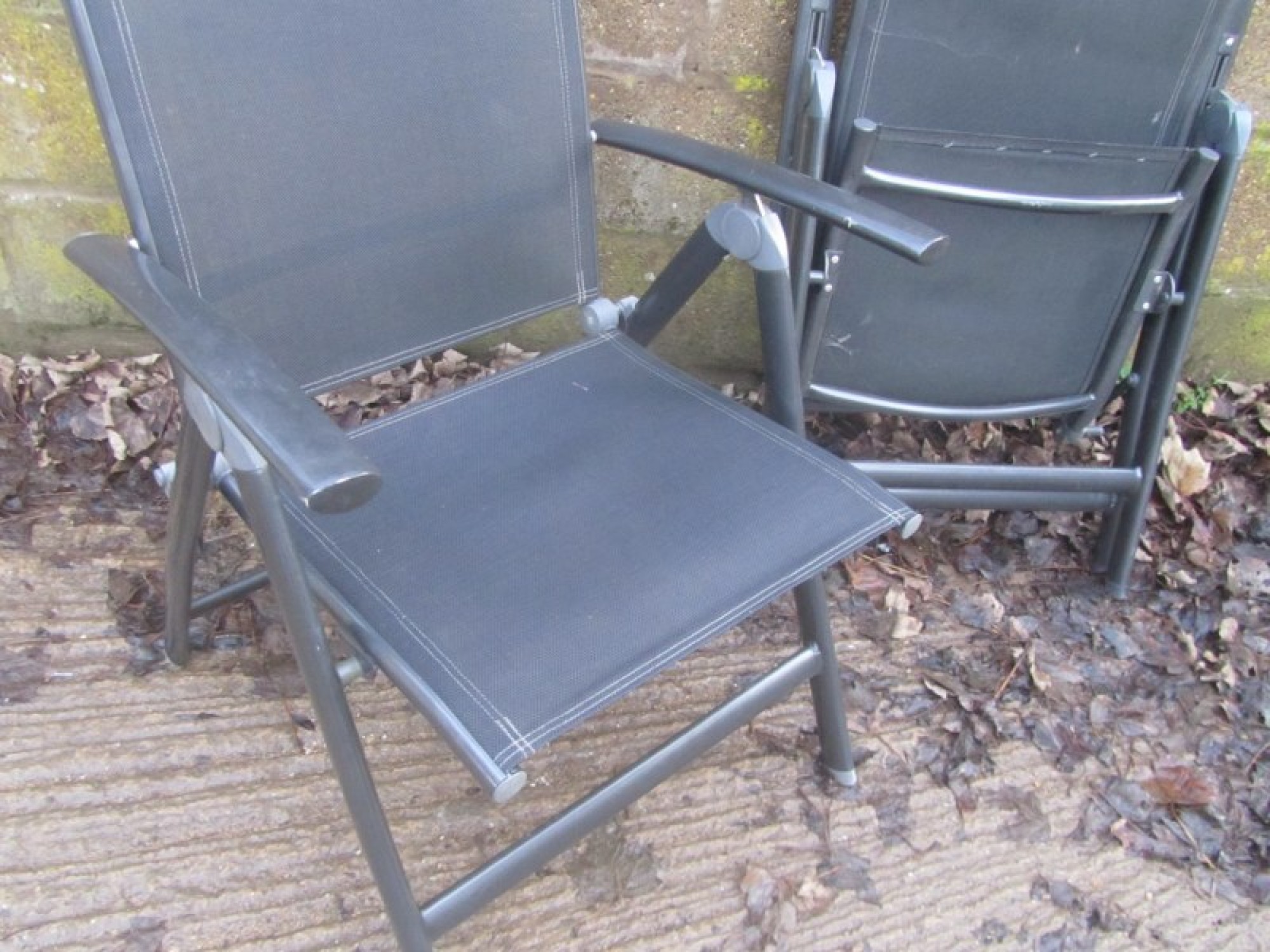 THIS IS A MATCHING PAIR OF FOLD UP OUTDOOR CHAIRS. THE FRAMES ARE METAL. THE SEATS ARE MATERIAL. THERE ARE NO TEARS OR DAMAGE, GOOD CONDITION. FOR SALE AS A PAIR OF CHAIRS. SEAT HEIGHT IS 47cm.
