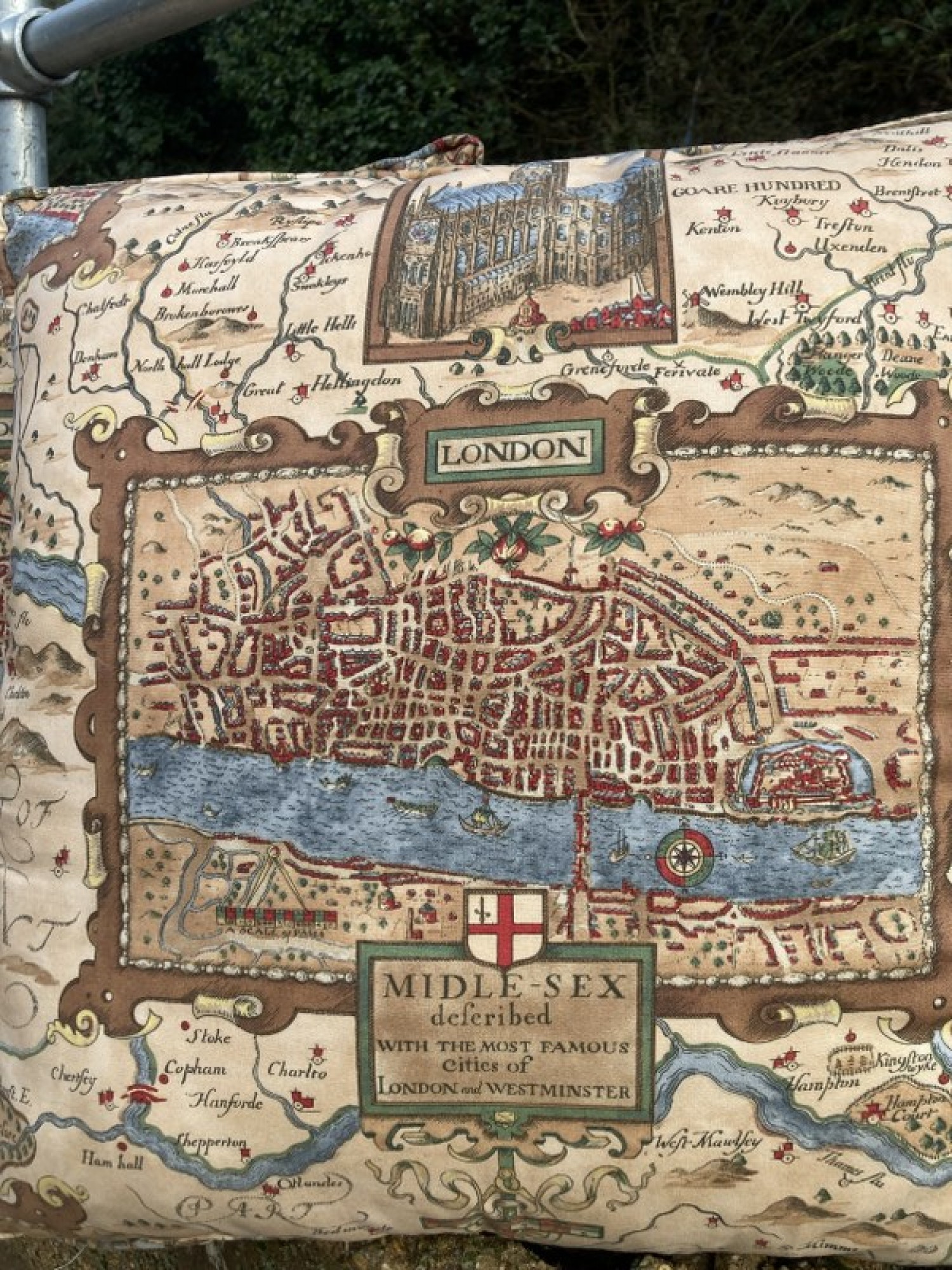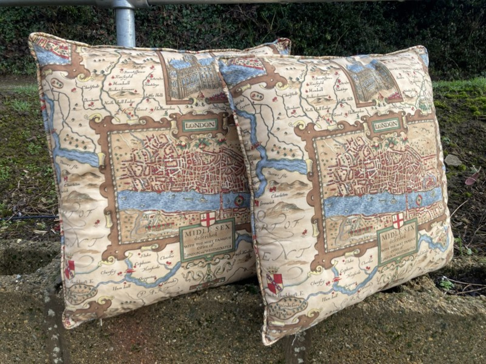 A PAIR OF MODERN LARGE CUSHIONS. DECORATIVE PATTERN DEPICTING OLD LONDON.