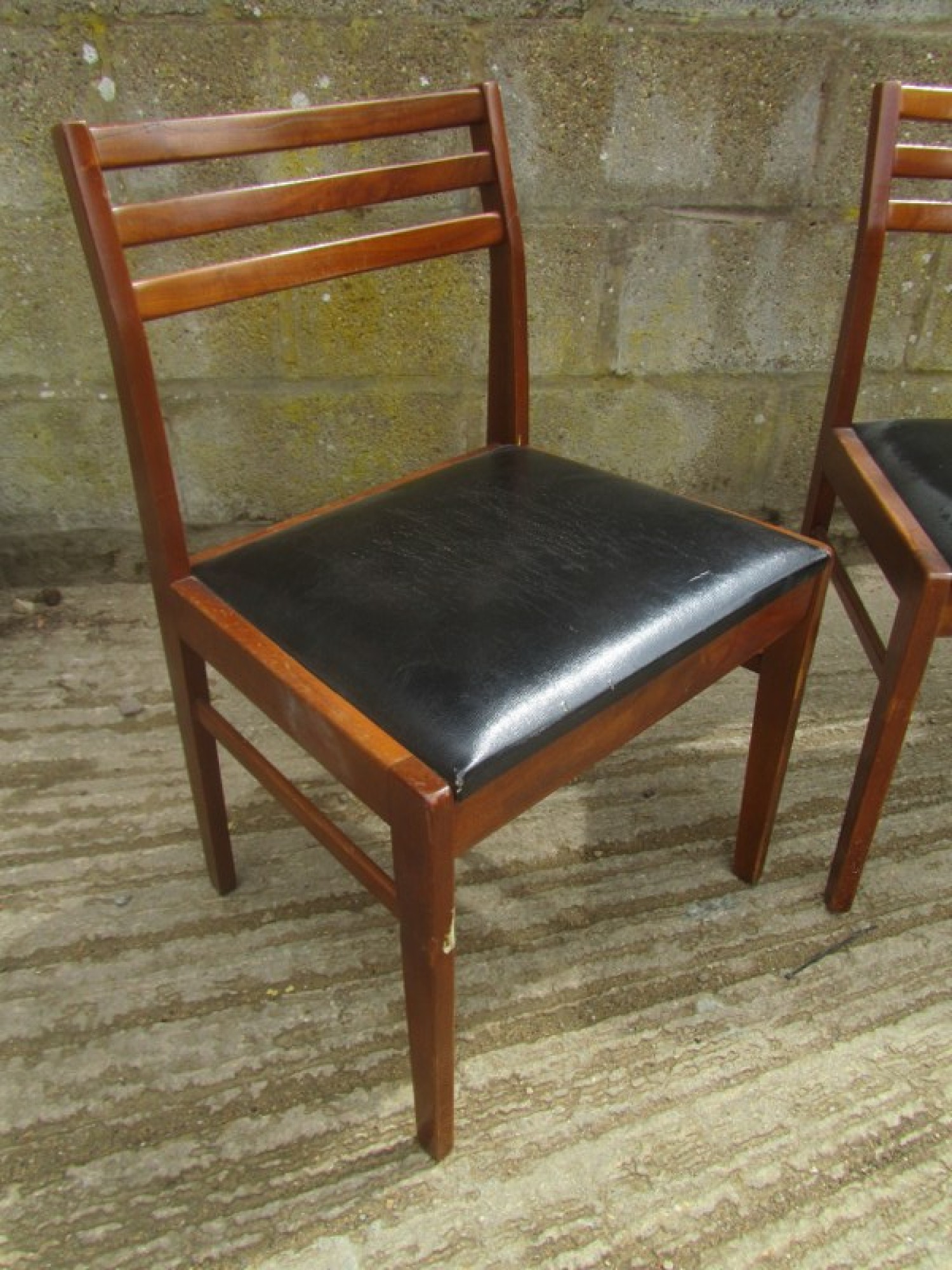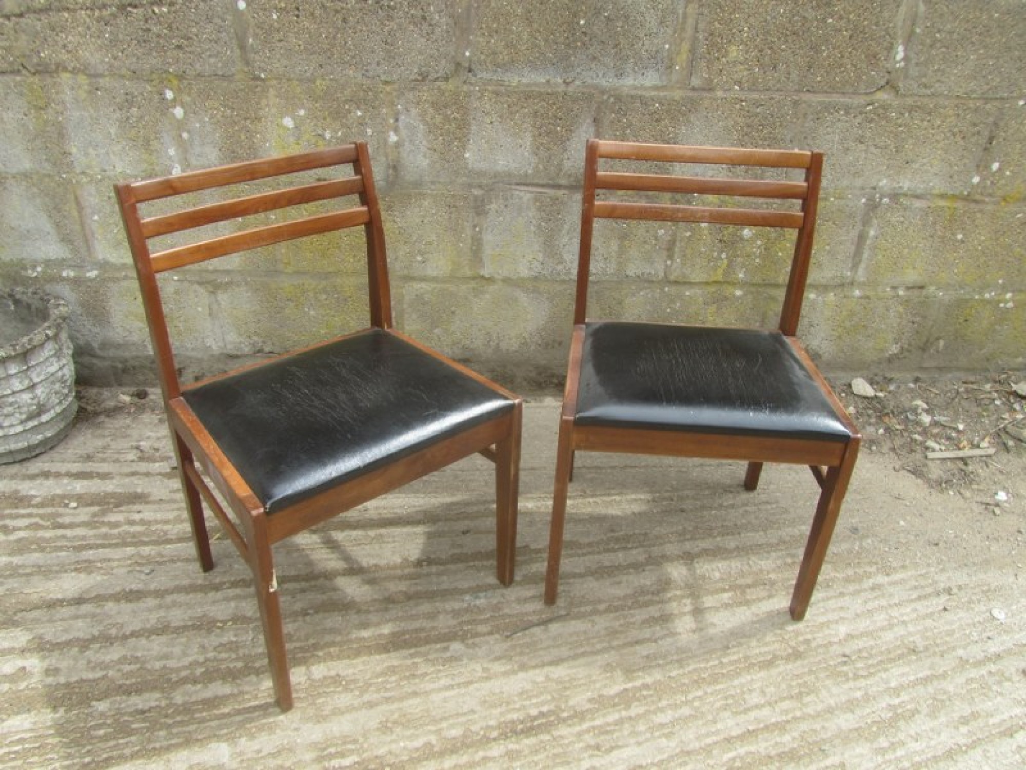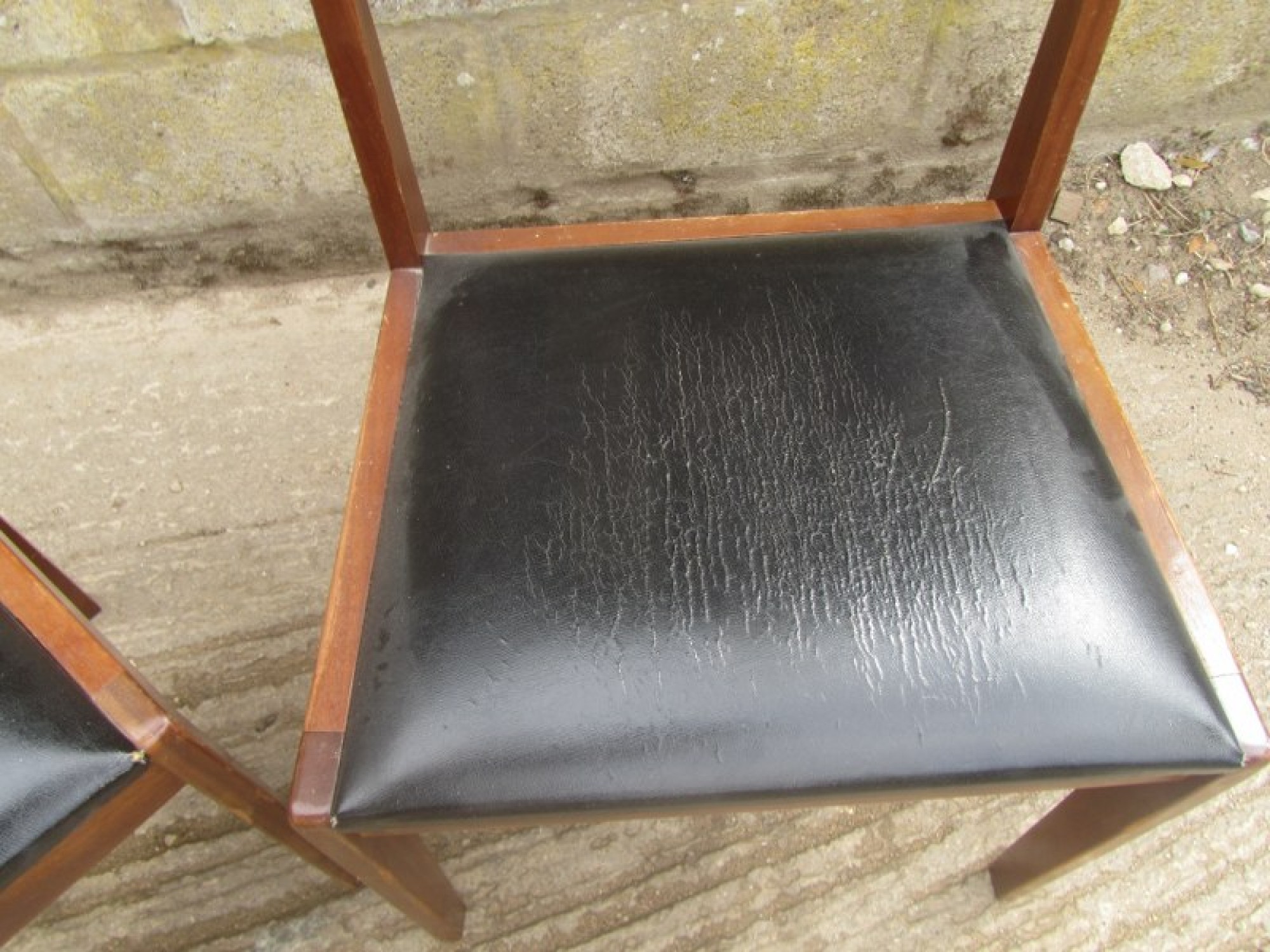 THIS IS A SET OF 2 CHAIRS, THEY HAVE SOLID WOOD FRAMES, THE SEAT PADS ARE COVERED IN WORN VINYL, SOME SCUFFS. THEY WOULD LOOK GREAT COVERED IN A VINTAGE STYLE FABRIC. FOR REUPHOLSTERY/RENOVATION. IN AVERAGE CONDITION, MINOR WEAR AND TEAR. SEAT HEIGHT IS 43cm.