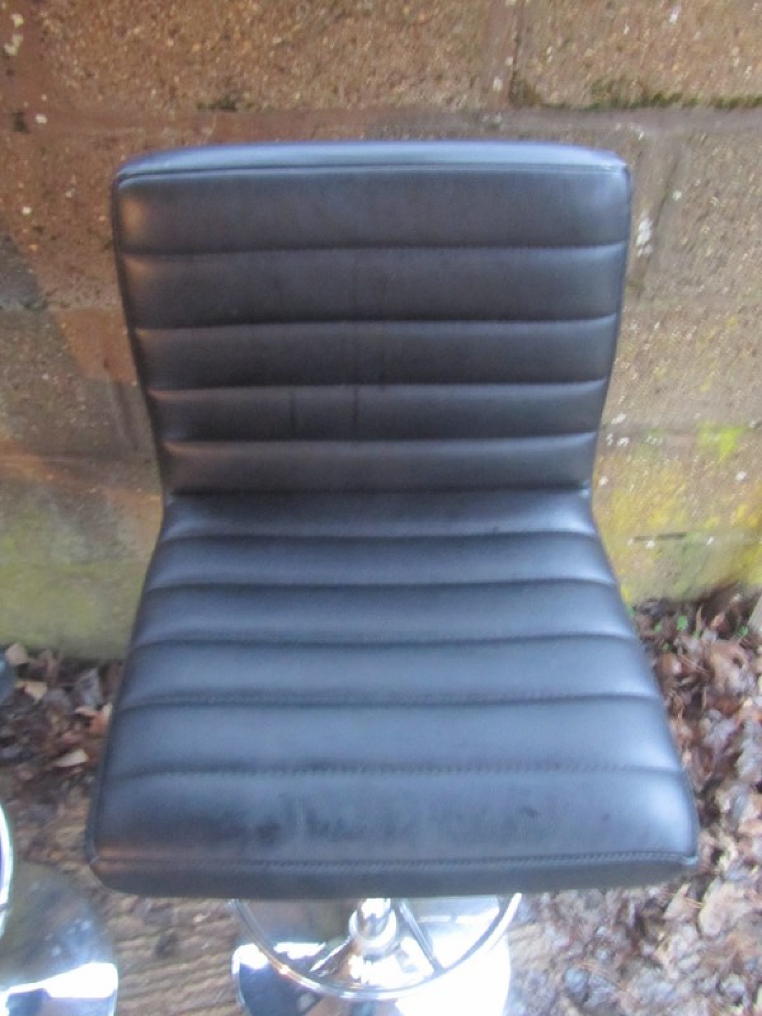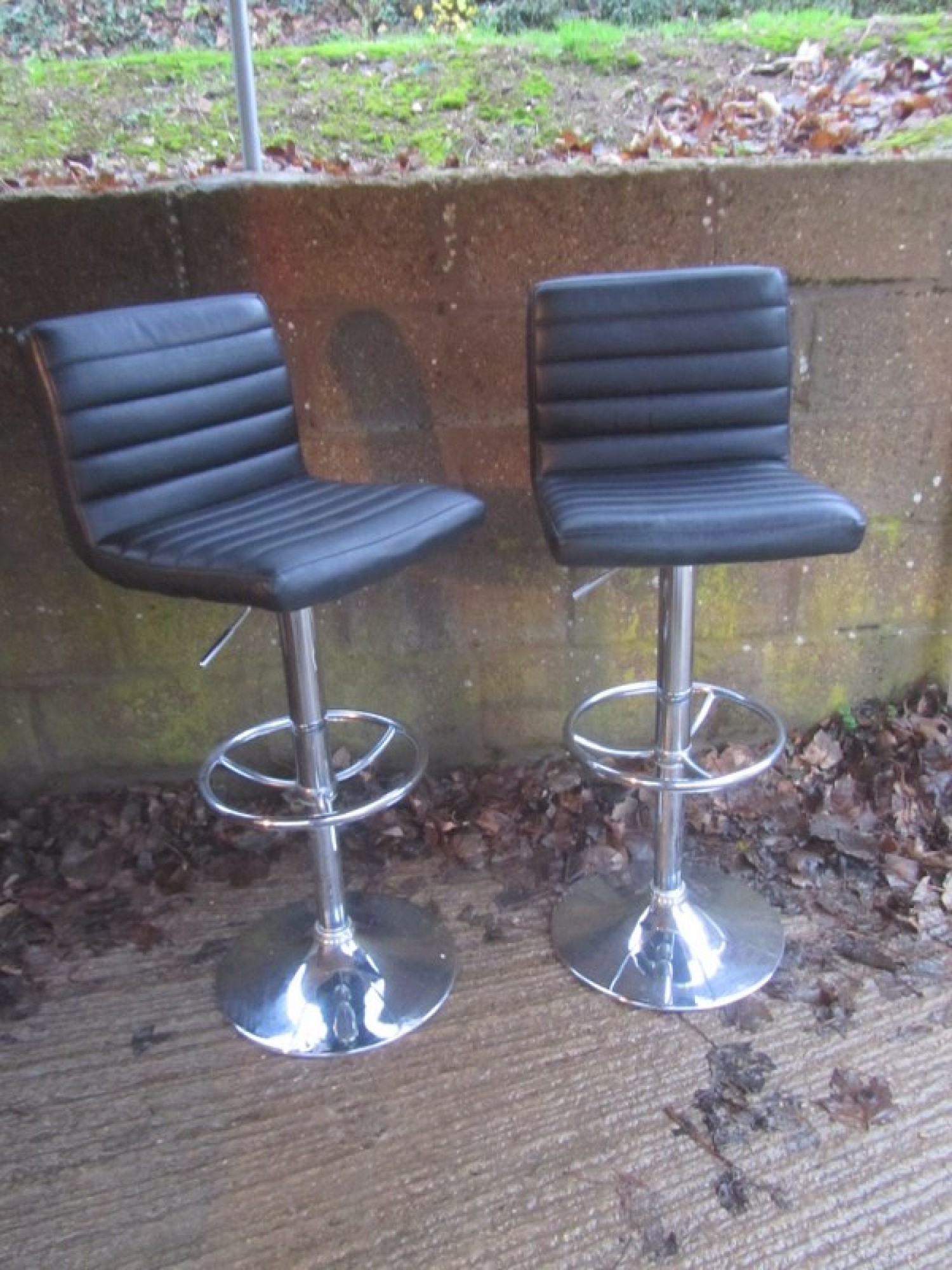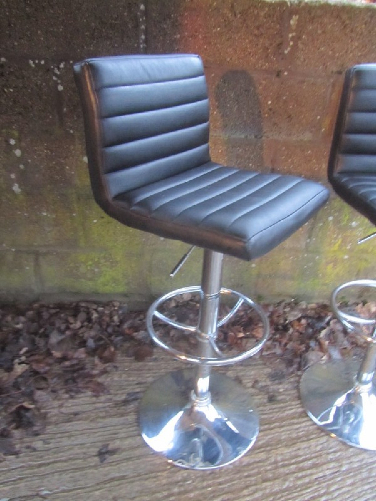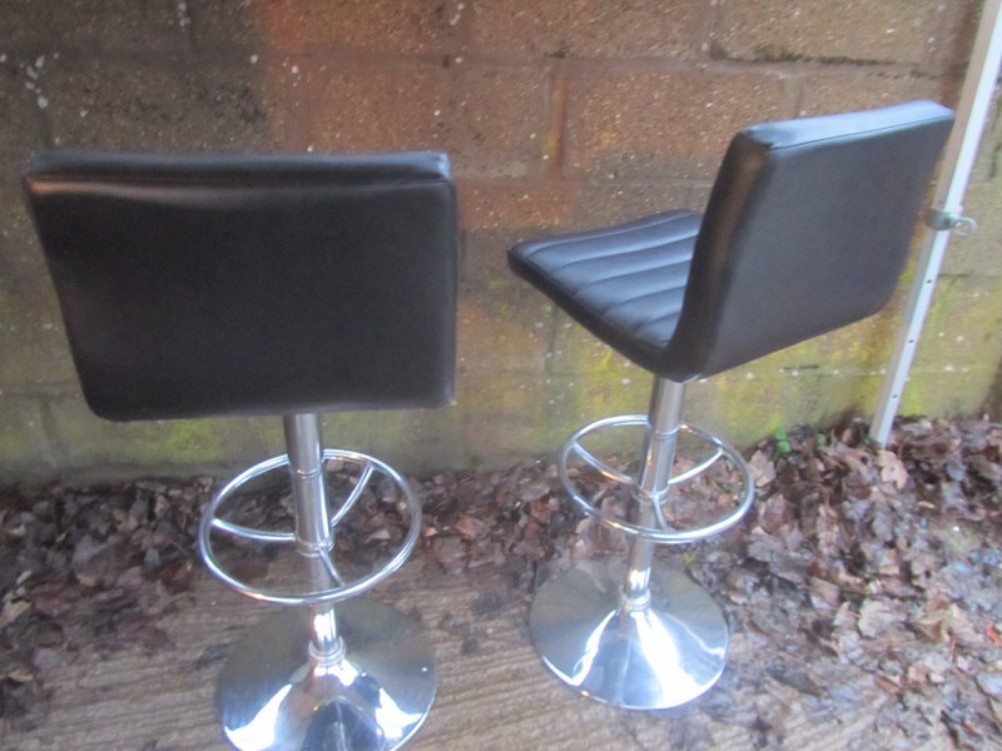 THIS IS A PAIR OF TALL STOOLS. METAL CHROME FRAMES, BLACK PADDED LEATHER EFFECT SEATS. STURDY. GAS LIFT FOR ADJUSTABLE HEIGHT. SEAT HEIGHT IS 62cm - 83cm.