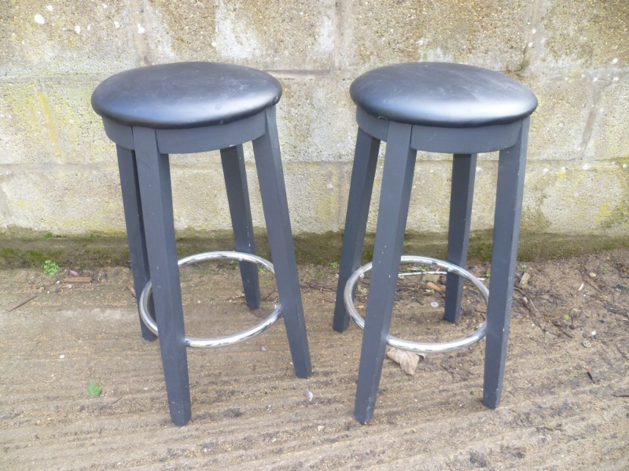 THIS IS A PAIR OF SMALL STOOLS. SOLID WOOD BLACK FRAMES, BLACK PADDED VINYL SEATS. STURDY.