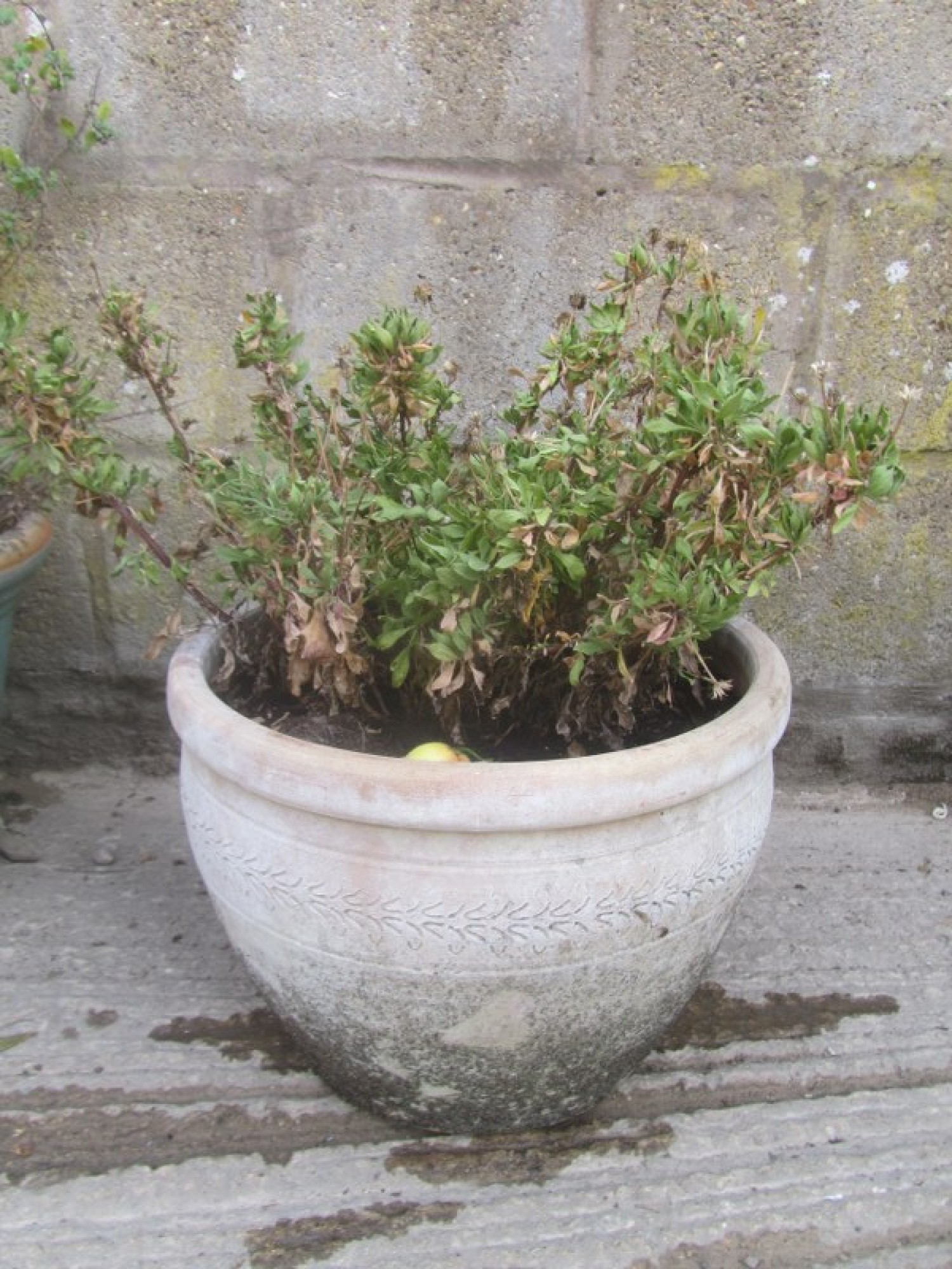 A ROUND TERRACOTTA PLANTER FOR THE GARDEN. COULD BE USED INSIDE OR OUTSIDE. WEATHERED.