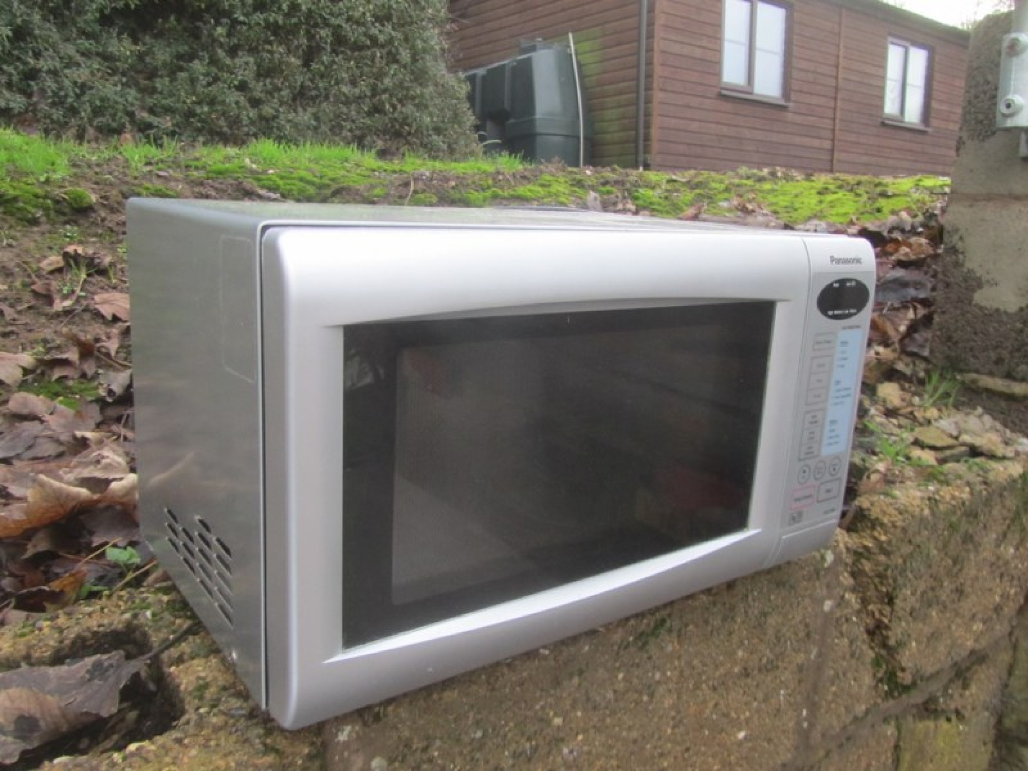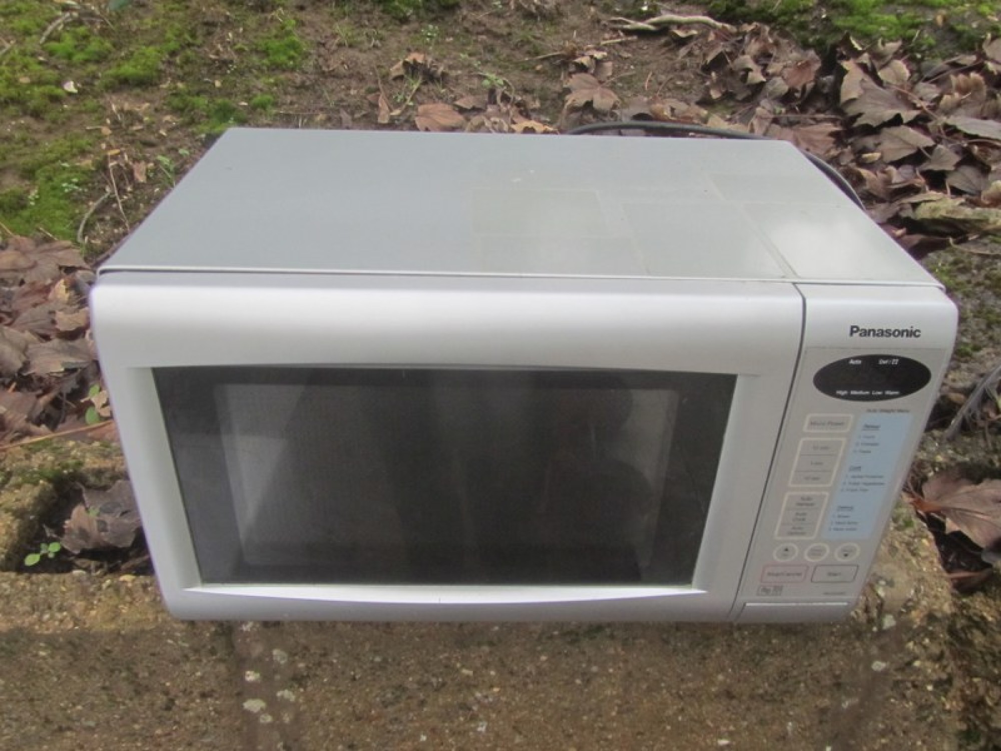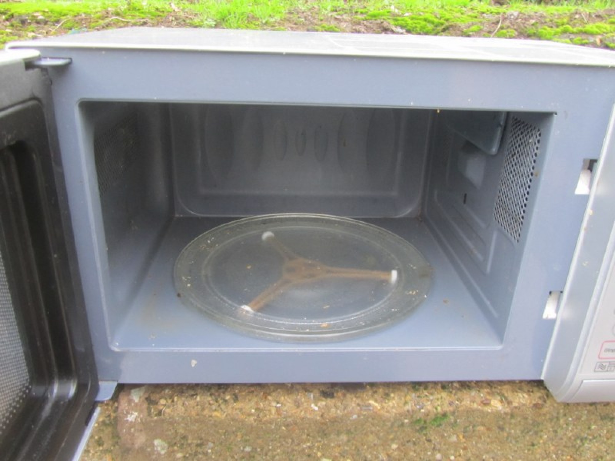 A SILVER MICROWAVE WITH SIMPLE CONTROLS. NO INSTRUCTIONS. IT NEEDS A CLEAN.
