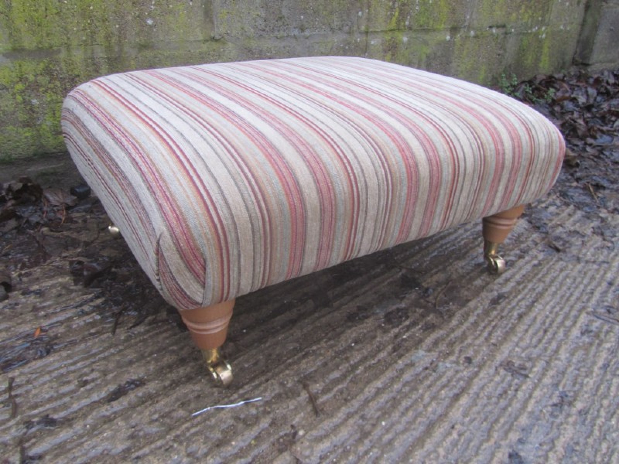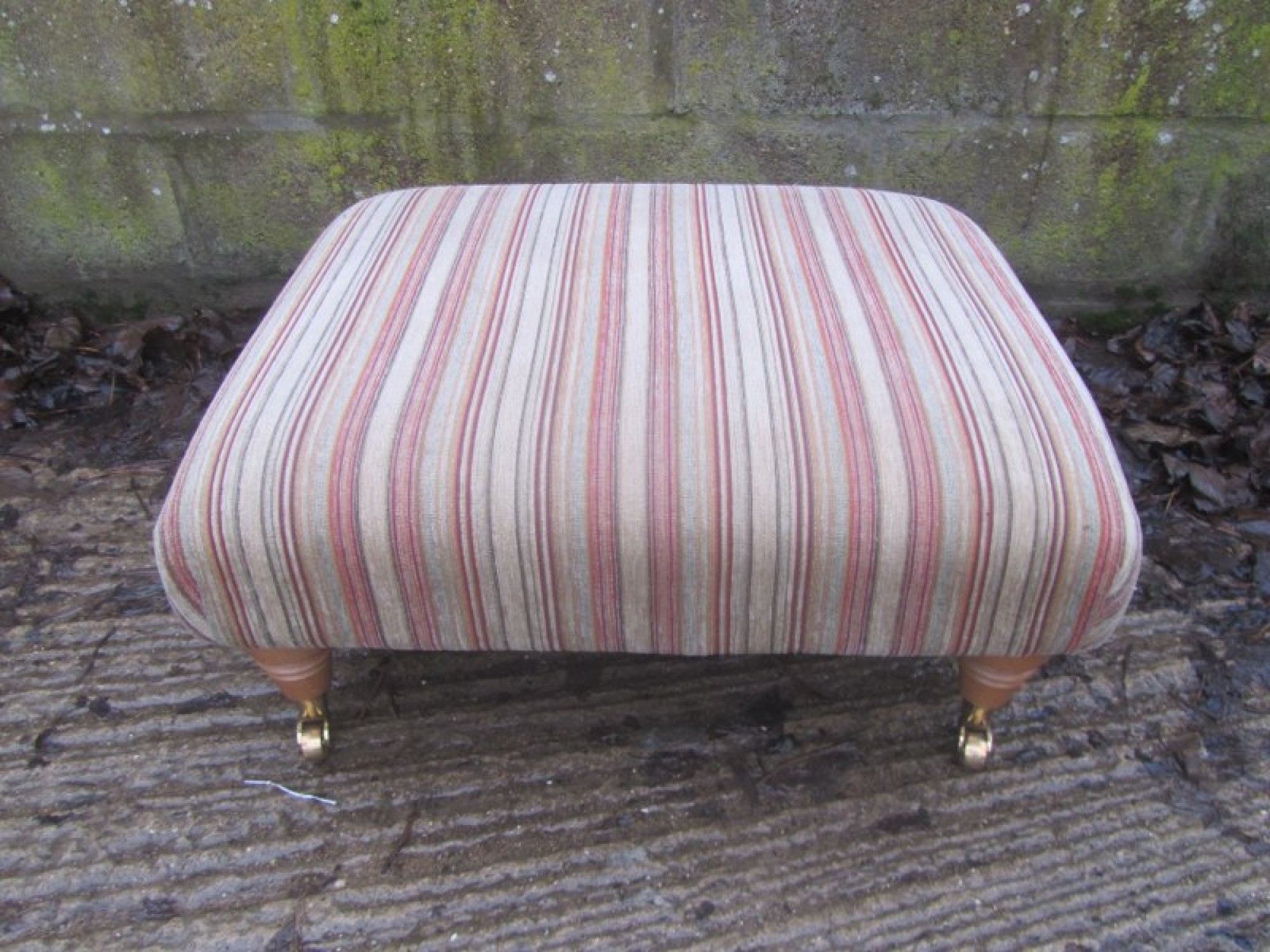A LARGE FOOTSTOOL WITH A PADDED TOP, WOODEN LEGS AND BRASS CASTORS. THE STOOL IS IN A MODERN STYLE. GOOD CLEAN CONDITION.