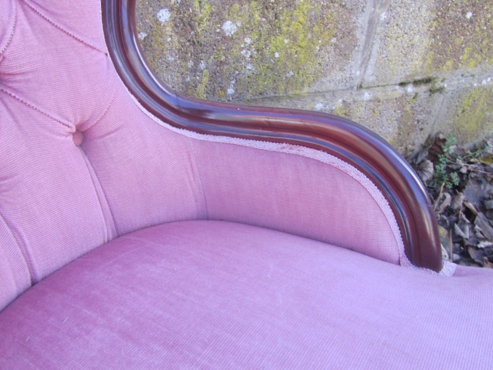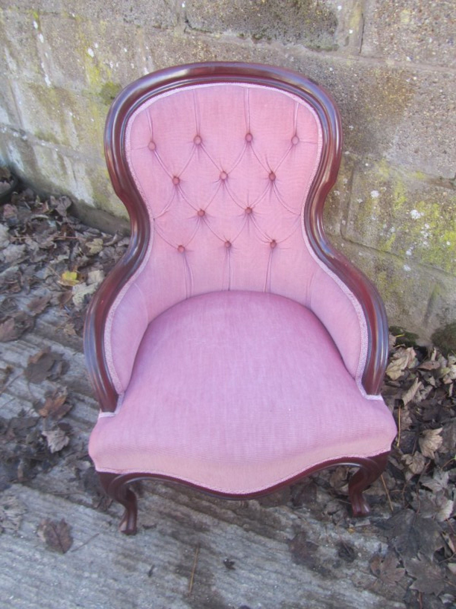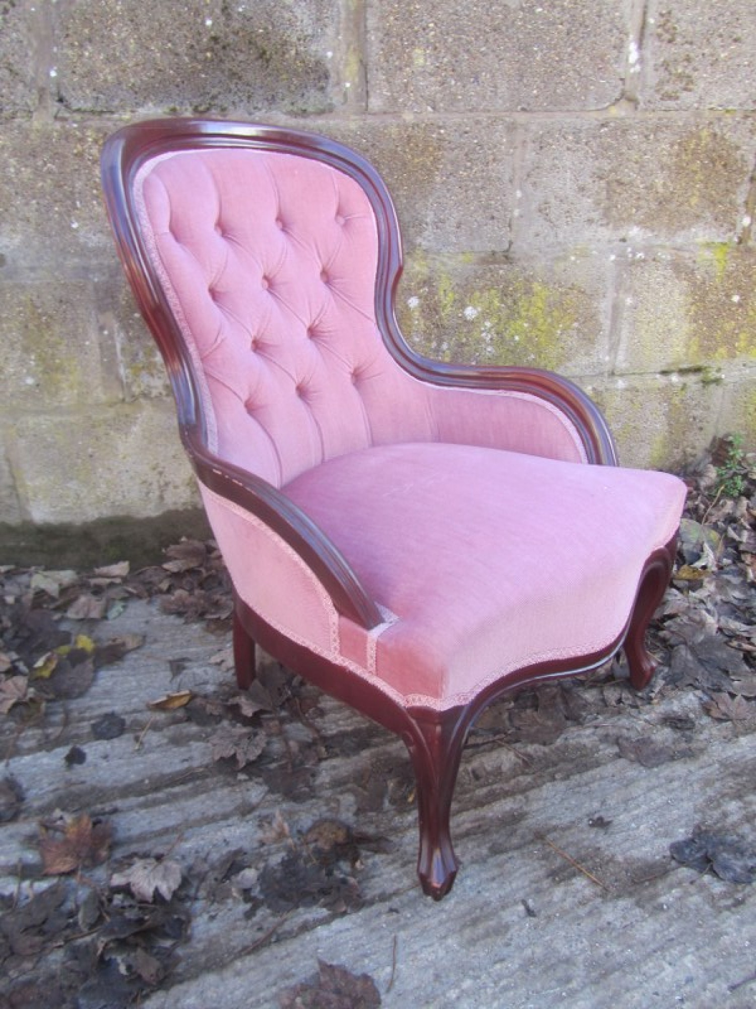 THIS IS A CHAIR IN AN ANTIQUE FRENCH STYLE. PADDED SEAT AND PADDED BACK REST, UPHOLSTERED IN MATERIAL. THE FRAME IS IN A MAHOGANY COLOURED WOOD. IN AVERAGE CONDITION, SOME WEAR TO THE MATERIAL. SEAT HEIGHT IS 36cm. ONE BACK LEG HAS A SPLIT AND NEEDS REPAIR BEFORE USE.