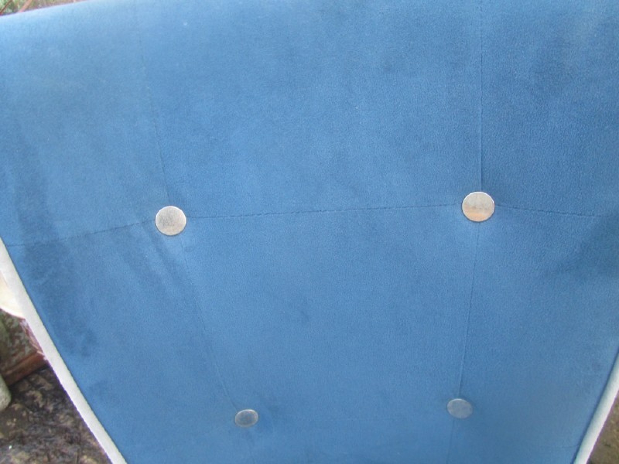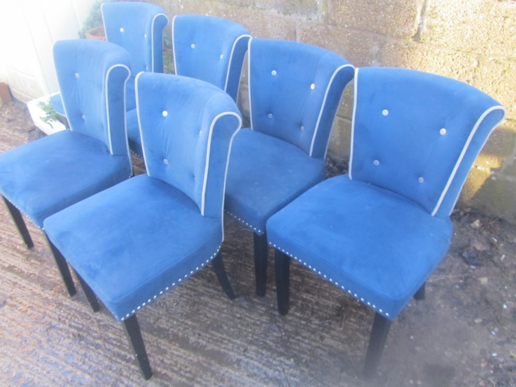 6 STURDY COMFORTABLE CHAIRS, WELL PADDED IN DARK BLUE VELVET STYLE MATERIAL. STUDDED DETAIL. SEAT HEIGHT IS 46cm. ALSO AVAILABLE IN SETS OF 4.