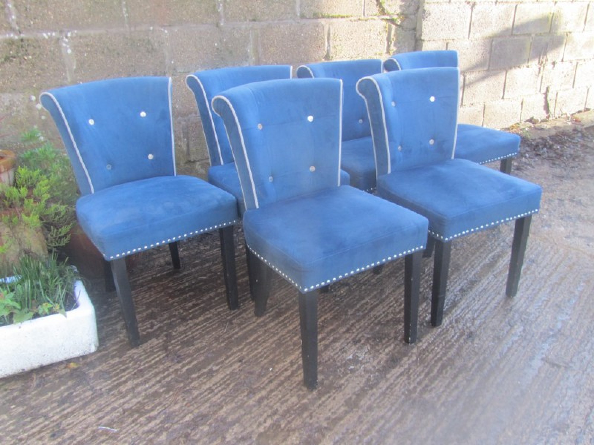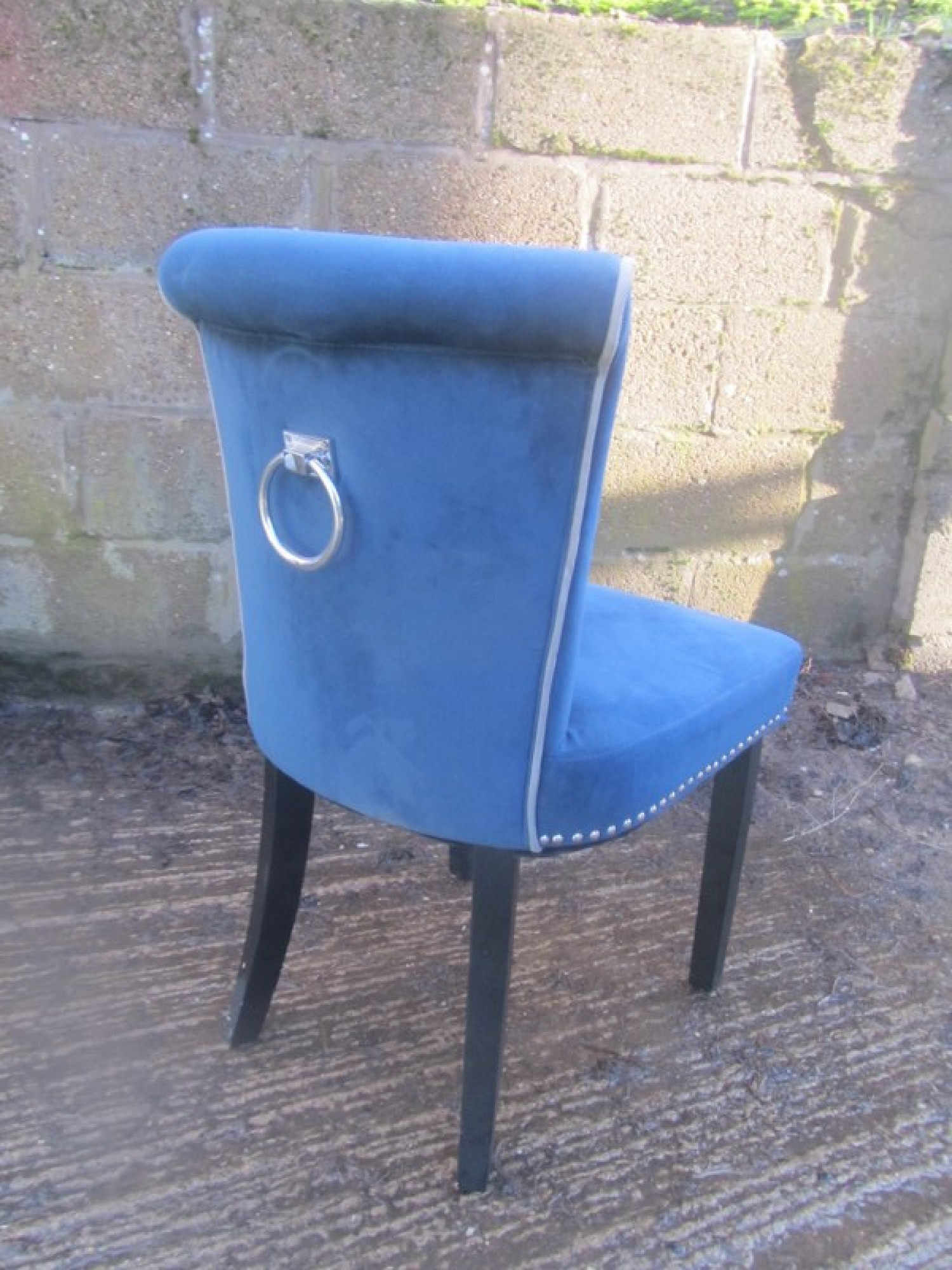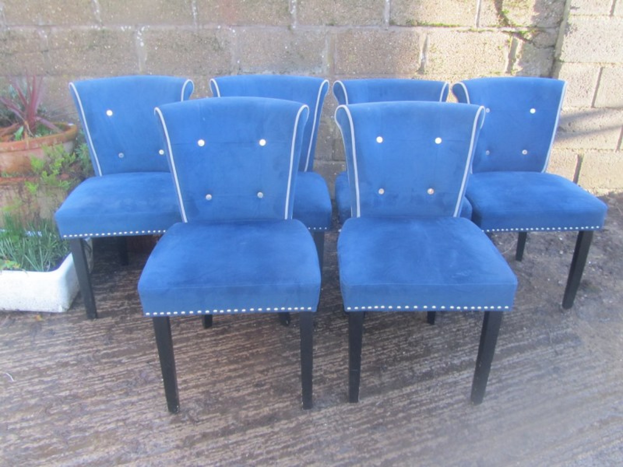 6 STURDY COMFORTABLE CHAIRS, WELL PADDED IN DARK BLUE VELVET STYLE MATERIAL. STUDDED DETAIL. SEAT HEIGHT IS 46cm. WITH CHROME METAL HANDLES ON THE BACK.