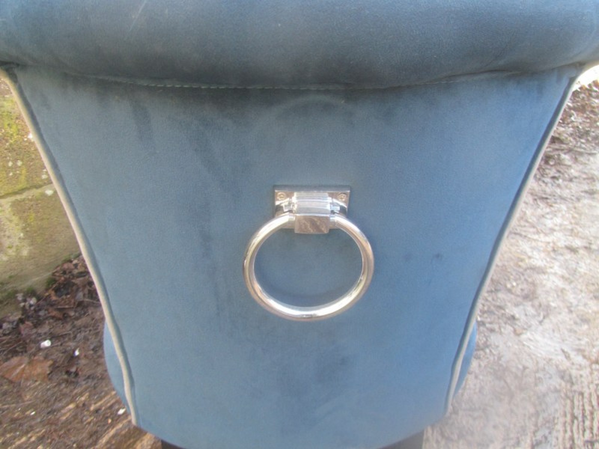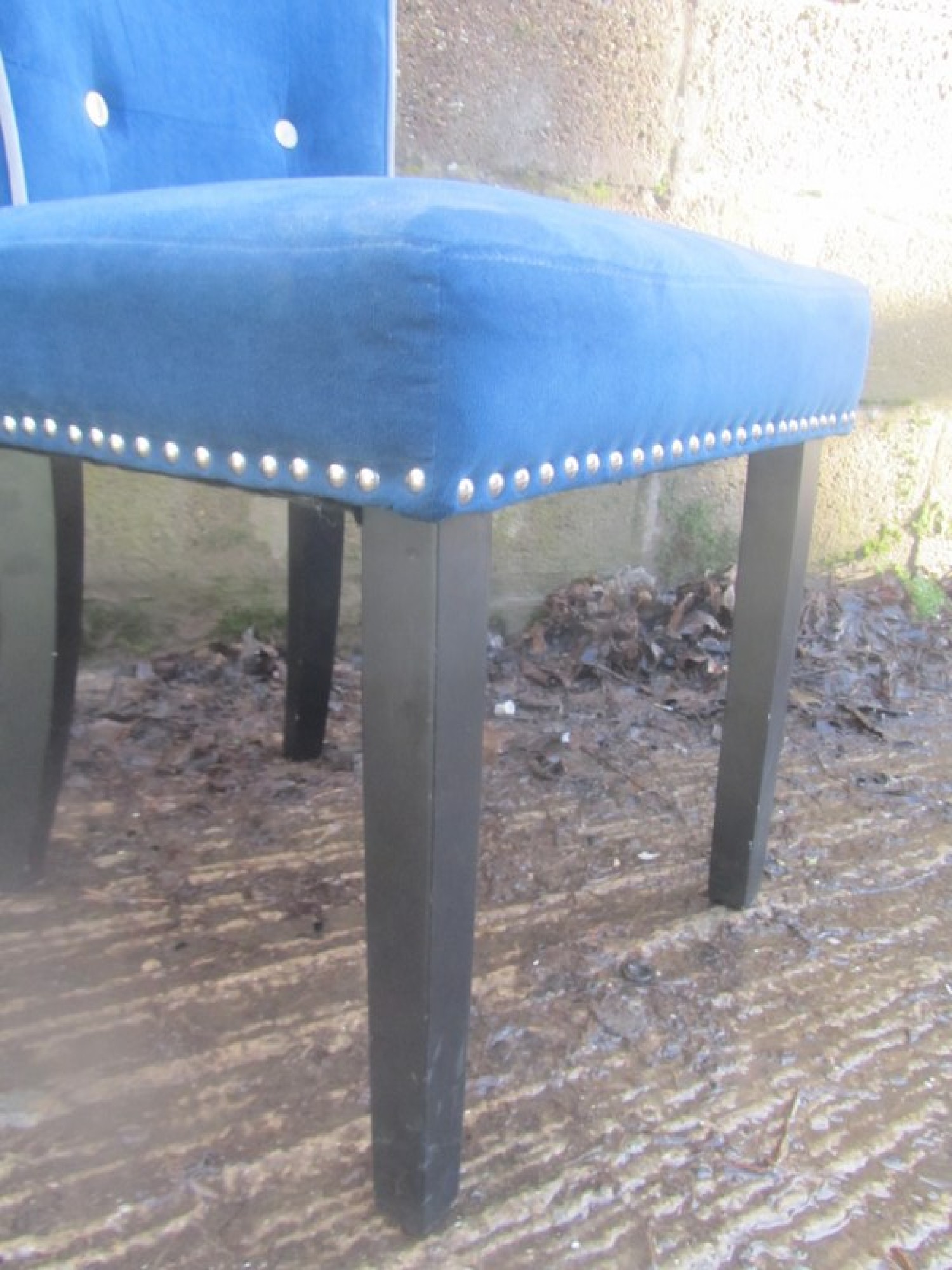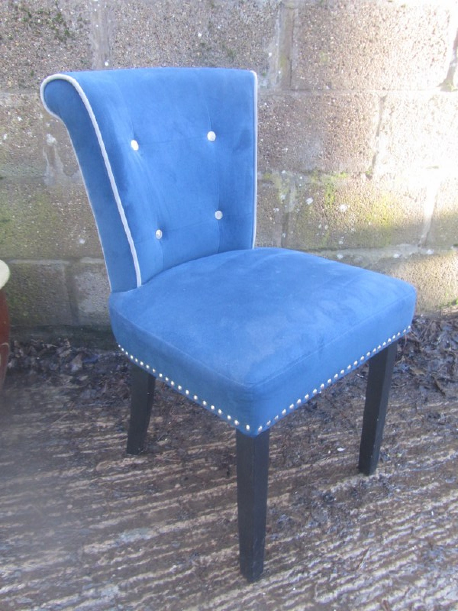 6 STURDY COMFORTABLE CHAIRS, WELL PADDED IN DARK BLUE VELVET STYLE MATERIAL. STUDDED DETAIL. SEAT HEIGHT IS 46cm. WITH CHROME METAL HANDLES ON THE BACK.
