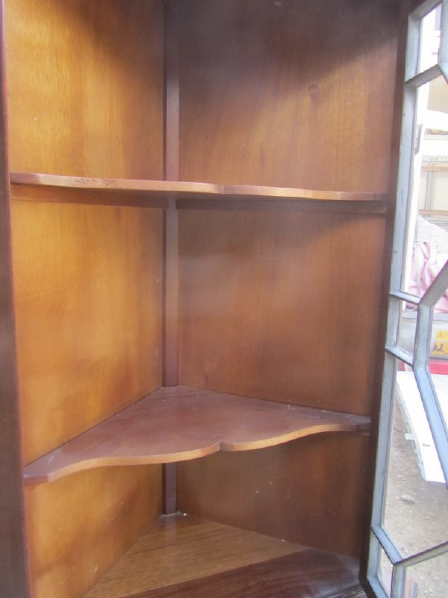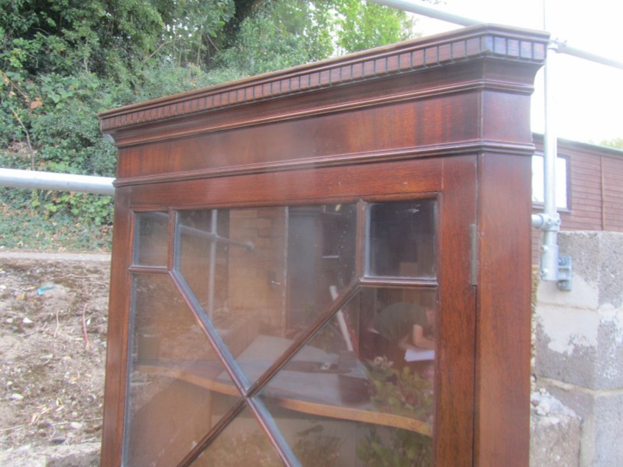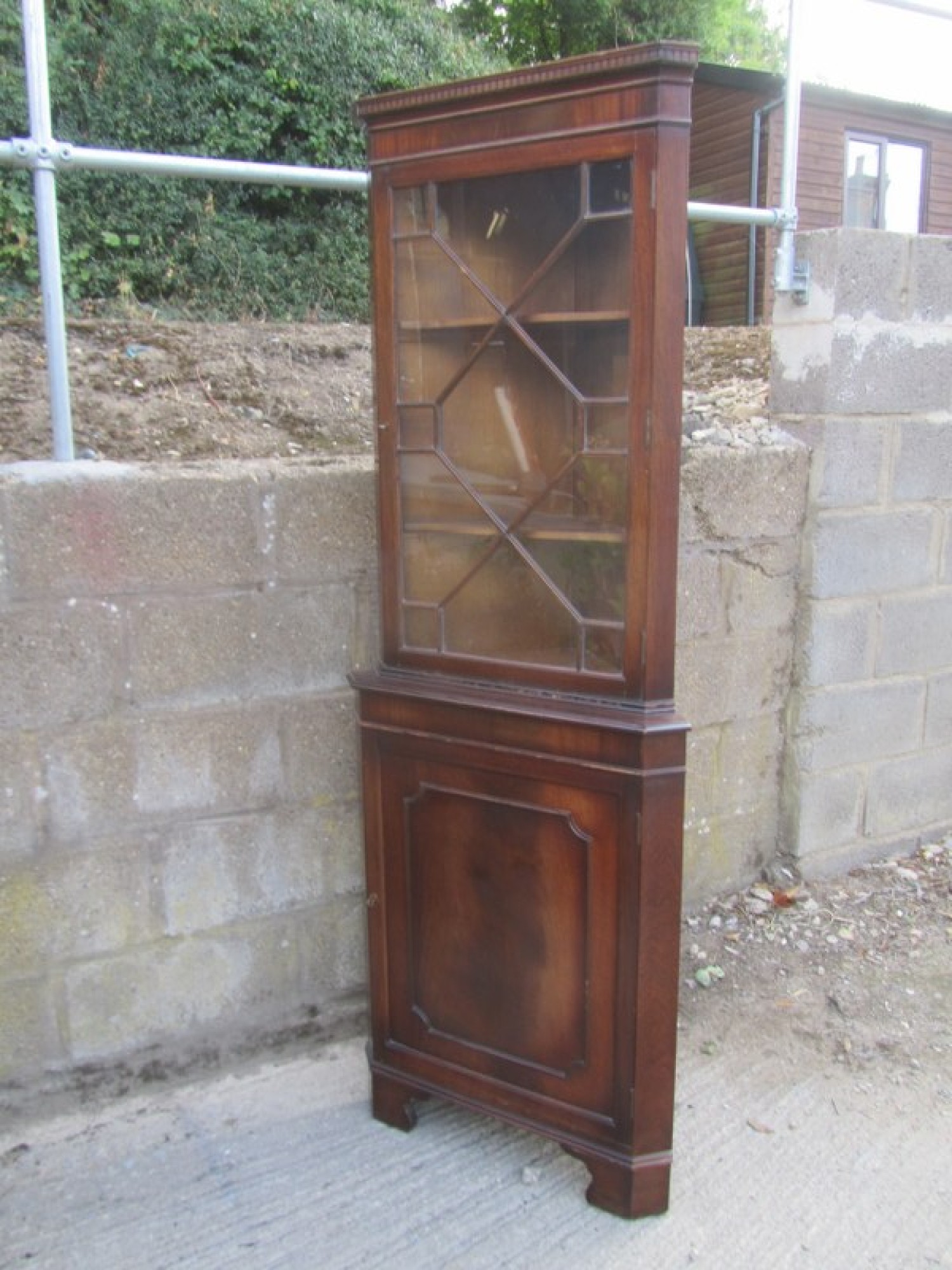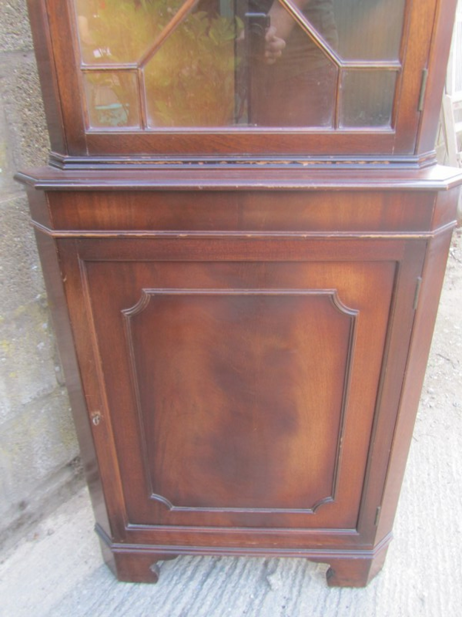 MAHOGANY VENEERED. IT IS IN A GEORGIAN REGENCY STYLE, BUT IS A LATE 20th CENTURY REPRODUCTION. THE TOP SECTION HAS A SINGLE GLAZED DOOR, INSIDE THERE ARE 2 SHELVES. BELOW THERE IS A SINGLE DOOR WITH A SHELF INSIDE. IT IS ALL ONE PIECE, IT DOES NOT SEPARATE.