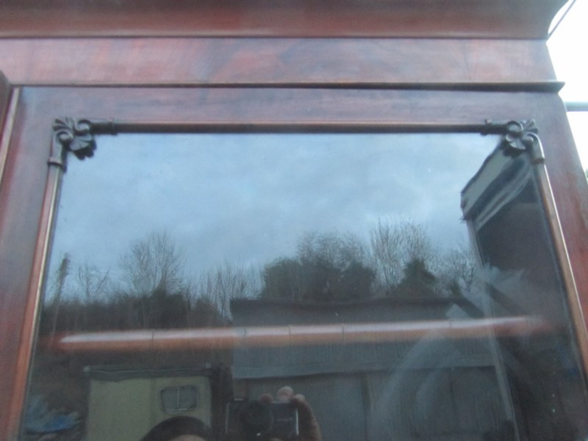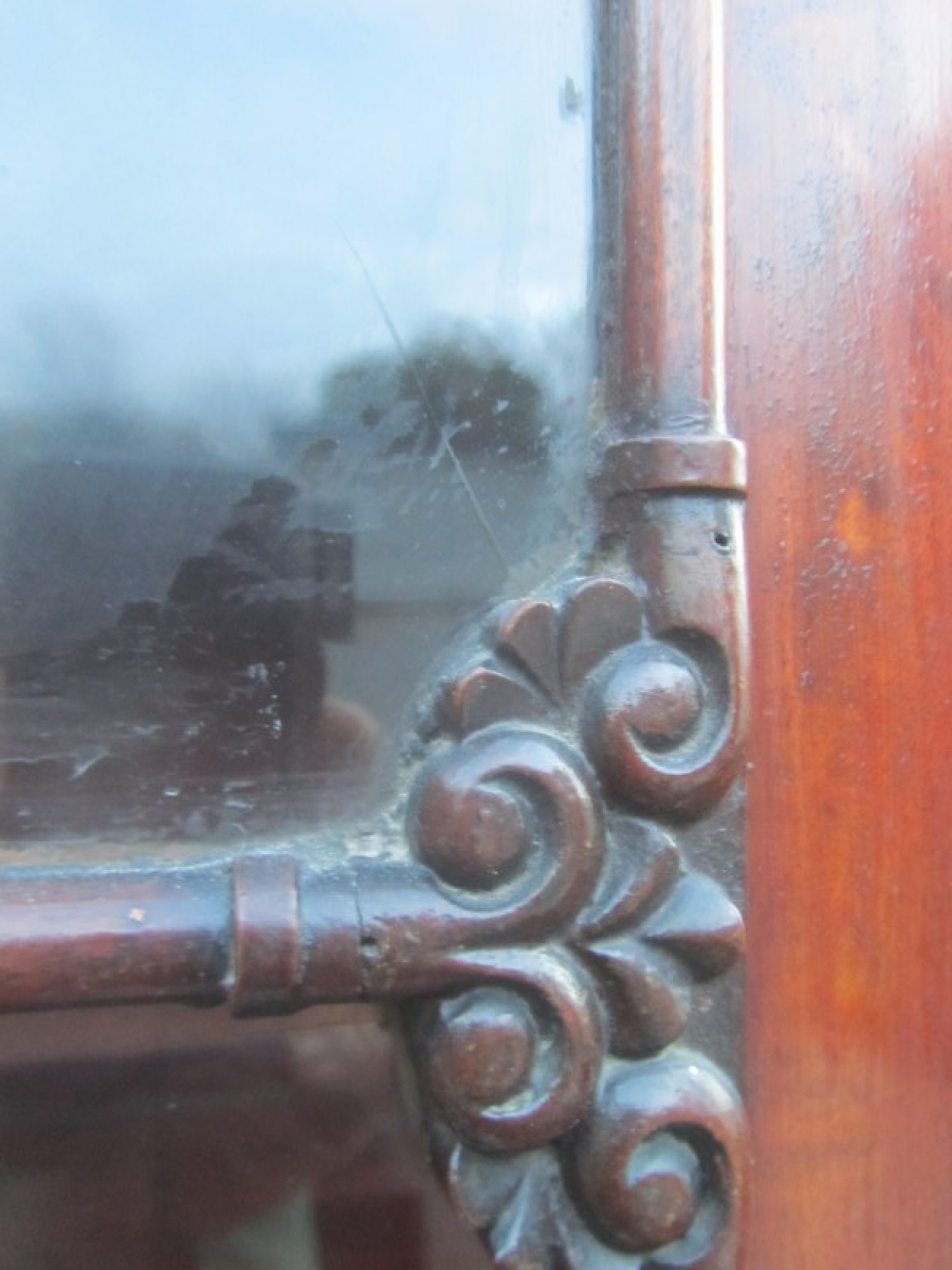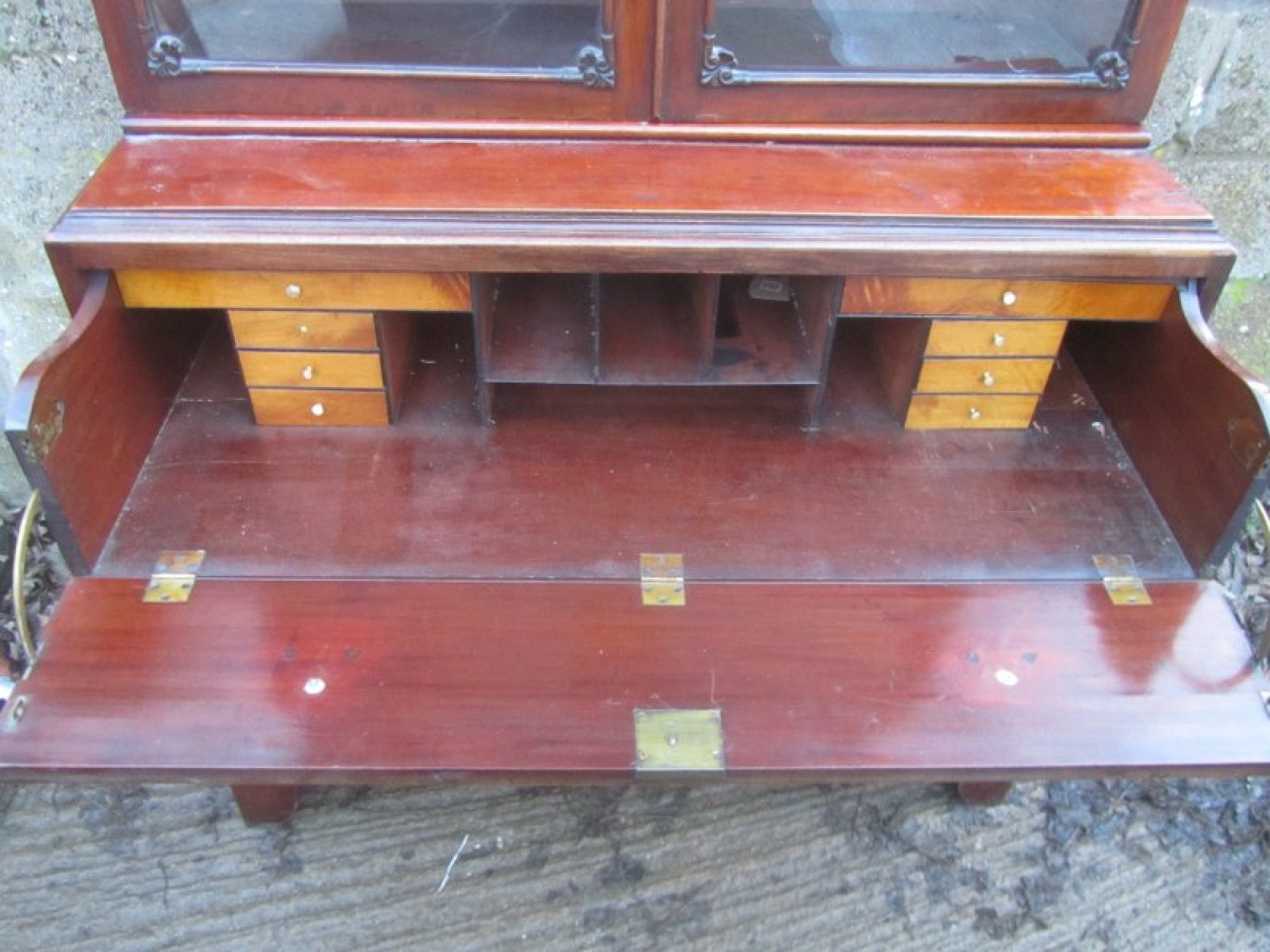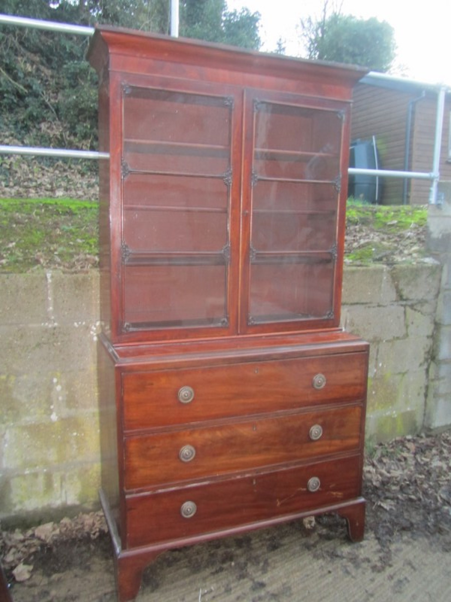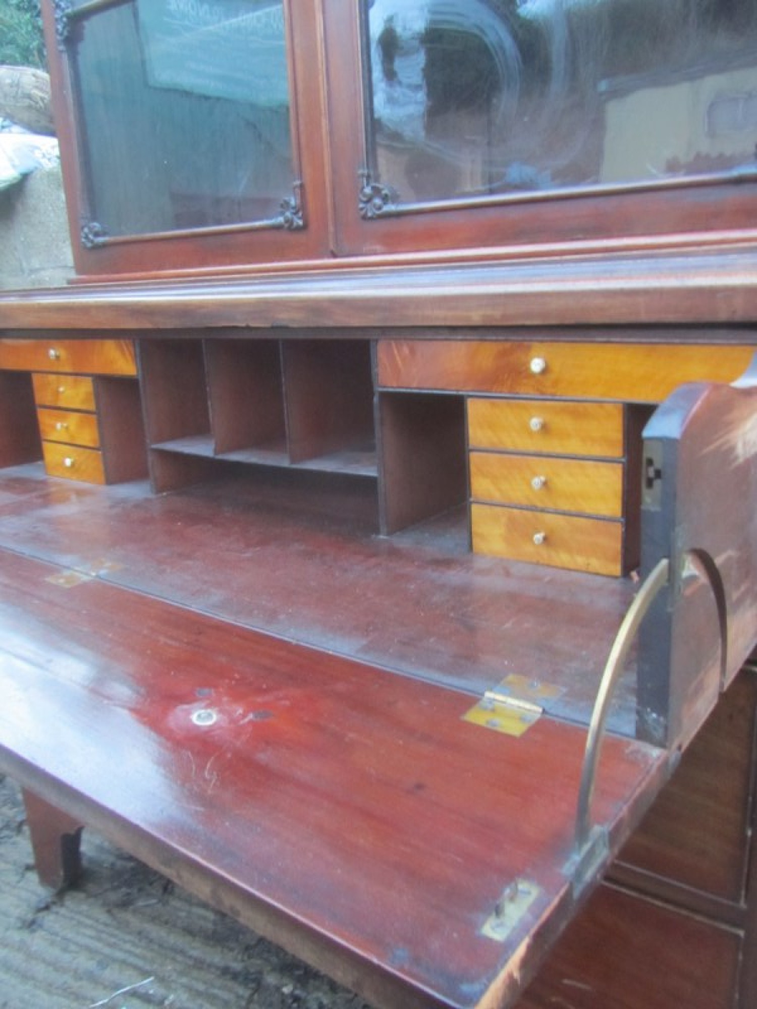 MAHOGANY (SOLID & VENEERED). IT IS A LATE VICTORIAN CABINET. THE TOP SECTION HAS GLAZED DOORS, INSIDE THERE ARE SHELVES. BELOW THERE DRAWERS. THE TOP DRAWER PULLS OUT AND HAS A DROP DOWN FRONT TO MAKE A FLAT WORK SURFACE WITH DRAWERS INSIDE WITH SMALL BONE HANDLES.