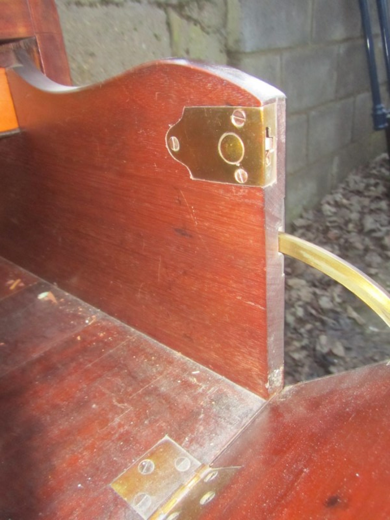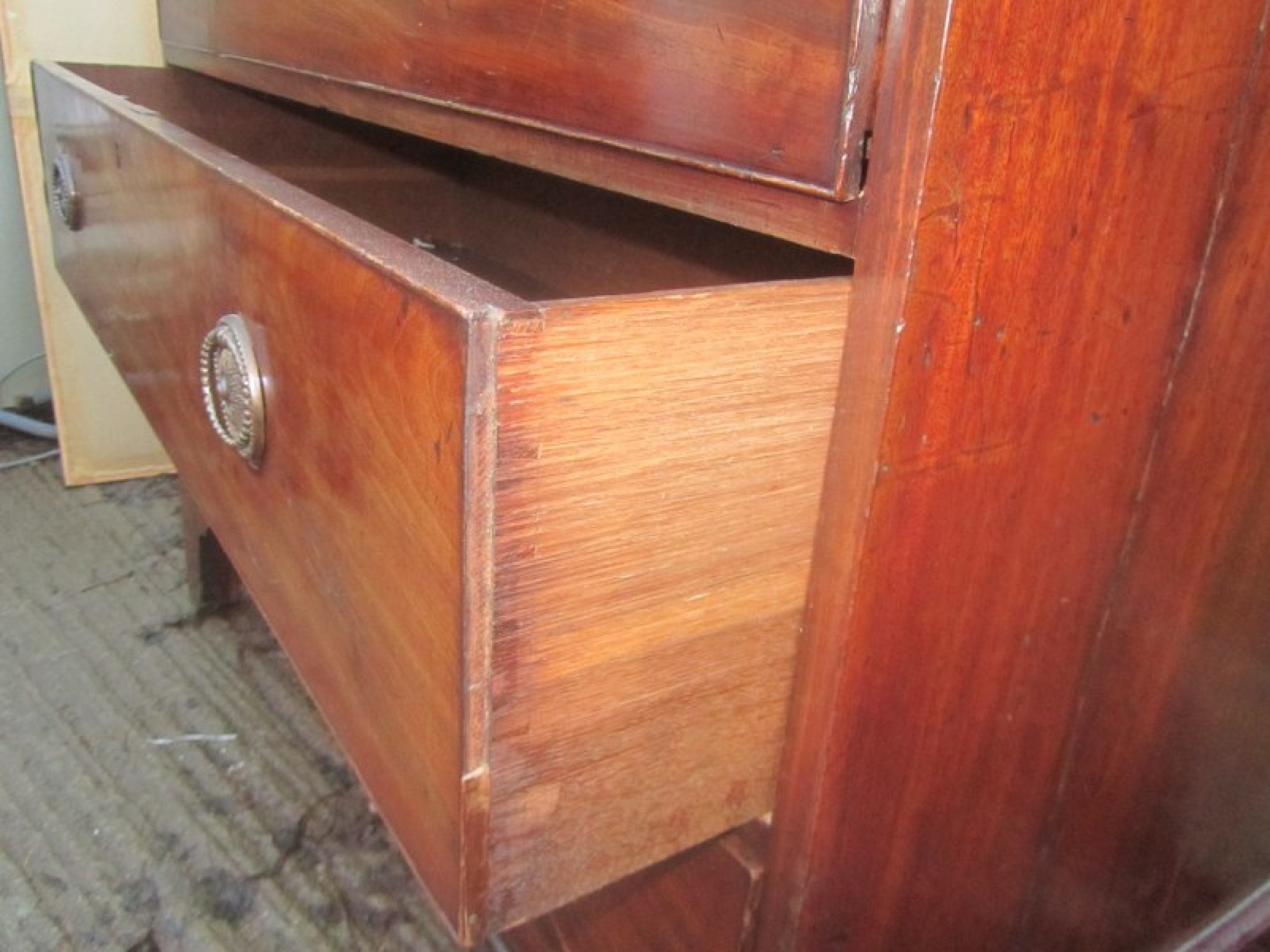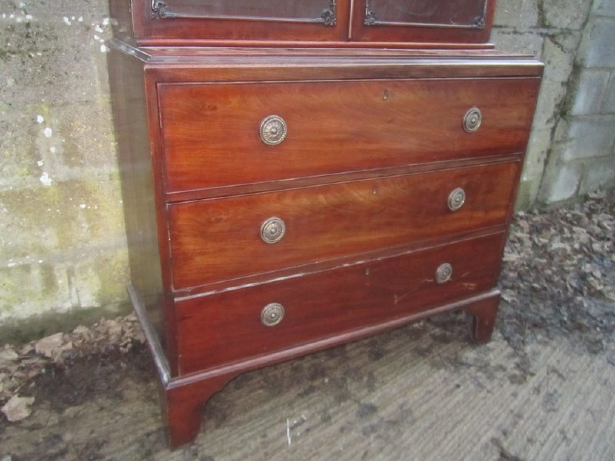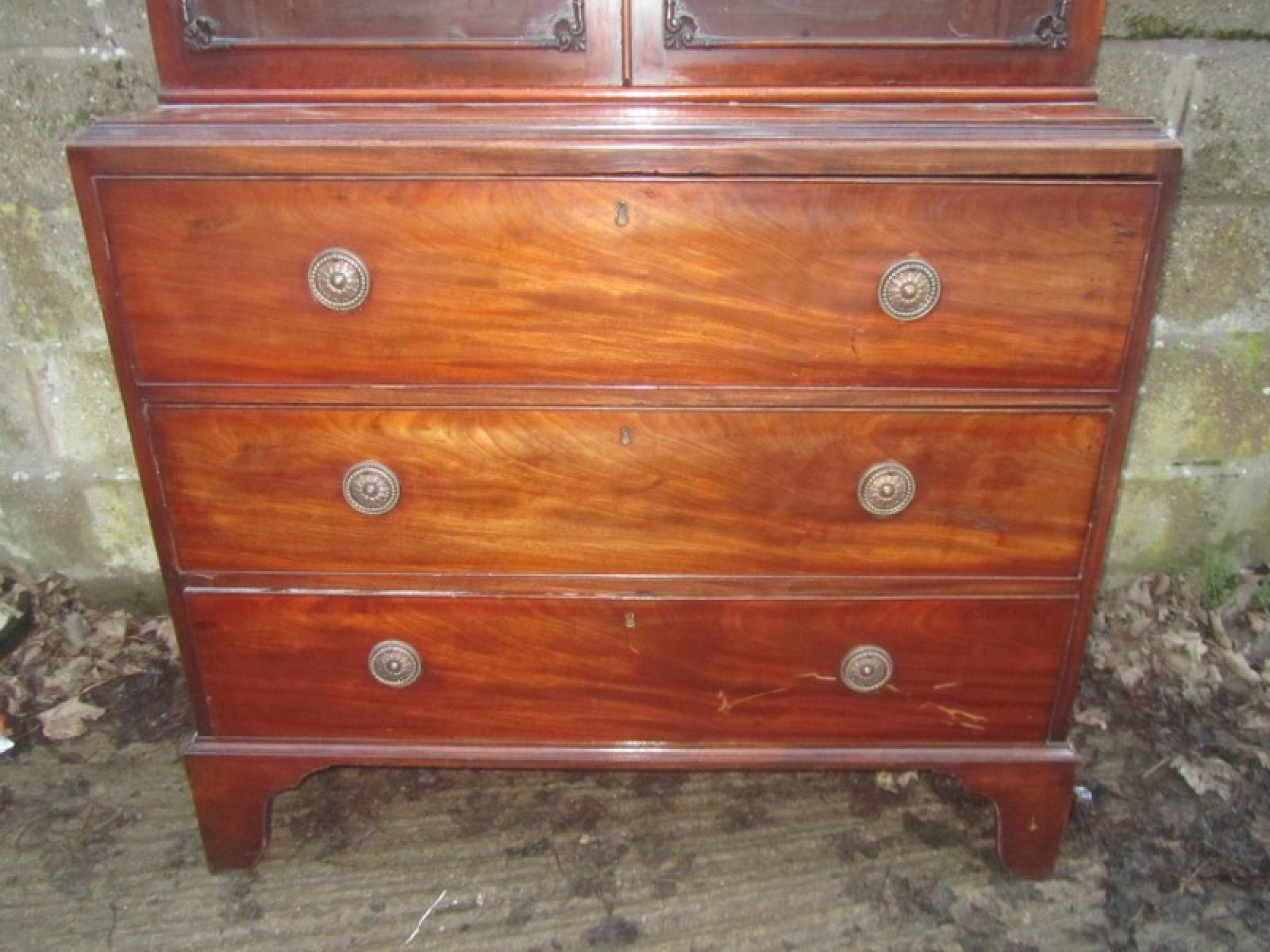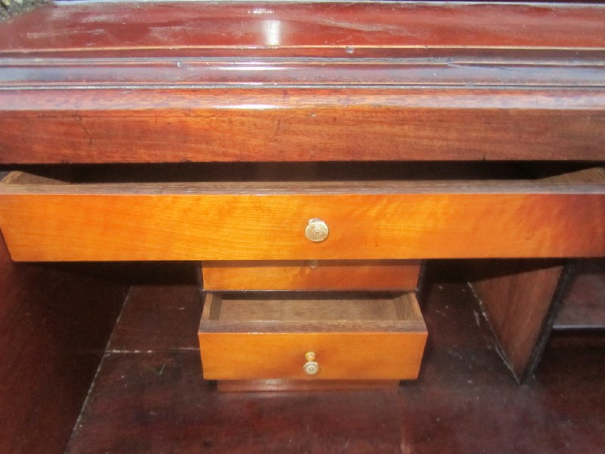 MAHOGANY (SOLID & VENEERED). IT IS A LATE VICTORIAN CABINET. THE TOP SECTION HAS GLAZED DOORS, INSIDE THERE ARE SHELVES. BELOW THERE DRAWERS. THE TOP DRAWER PULLS OUT AND HAS A DROP DOWN FRONT TO MAKE A FLAT WORK SURFACE WITH DRAWERS INSIDE WITH SMALL BONE HANDLES.