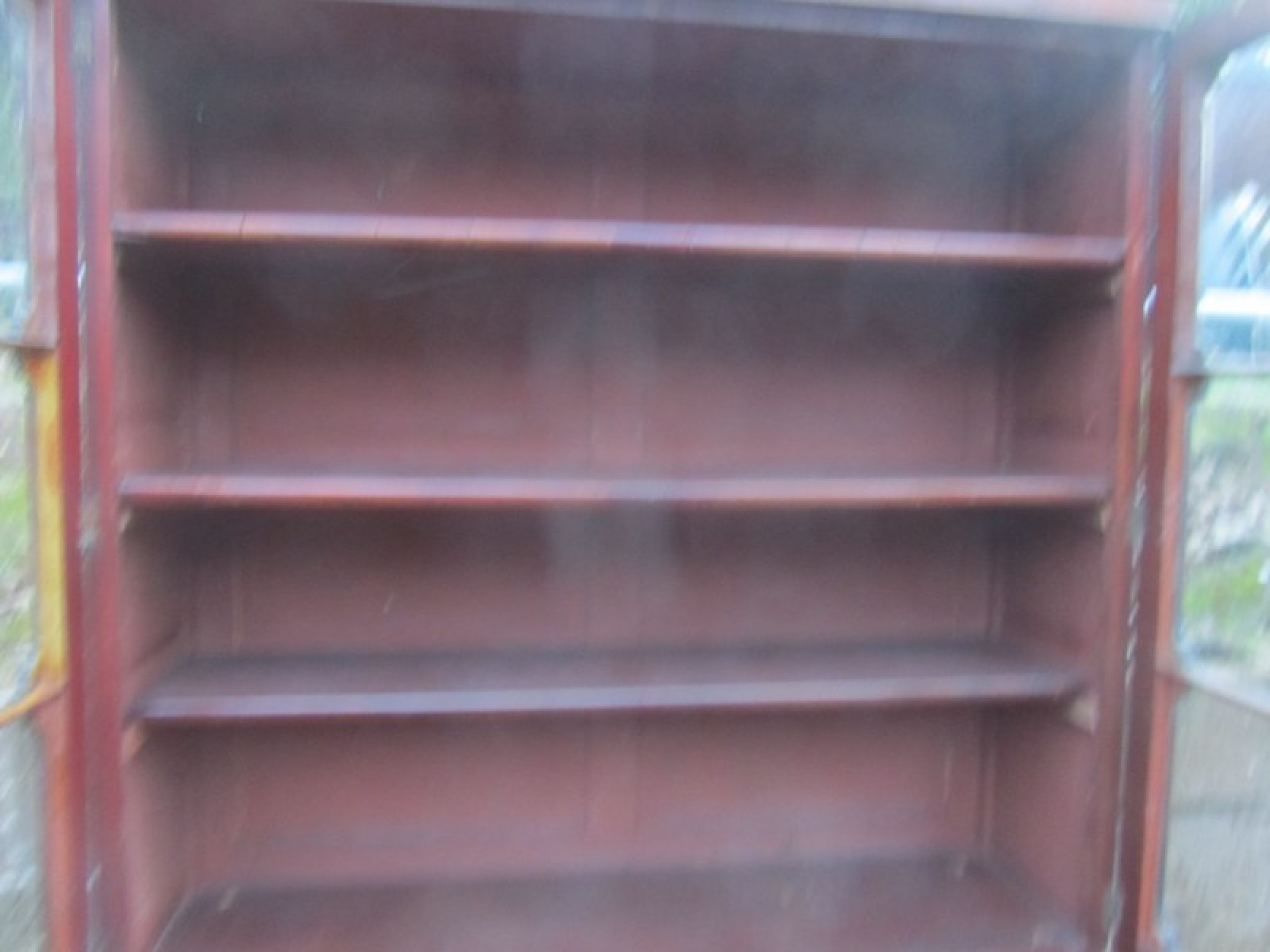 IT IS IN 2 PARTS FOR TRANSPORT, IT REQUIRES SCREWS TO PUT IT FIRMLY BACK TOGETHER. THE TOP TRIM IS UNATTACHED. SMALL CRACK ON ONE PANEL OF GLASS. GENERAL WEAR.