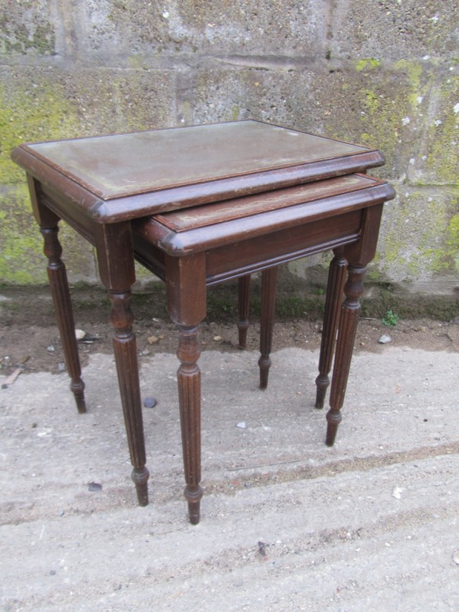 A STYLISH NEST OF 2 MAHOGANY VENEERED TABLES IN THE REGENCY STYLE. THE TABLES FIT UNDER EACH OTHER SO THEY NEATLY STORE AWAY. THE BIG TABLE HAS A GLASS TOP WITH LEATHER EFFECT INLAY BELOW.