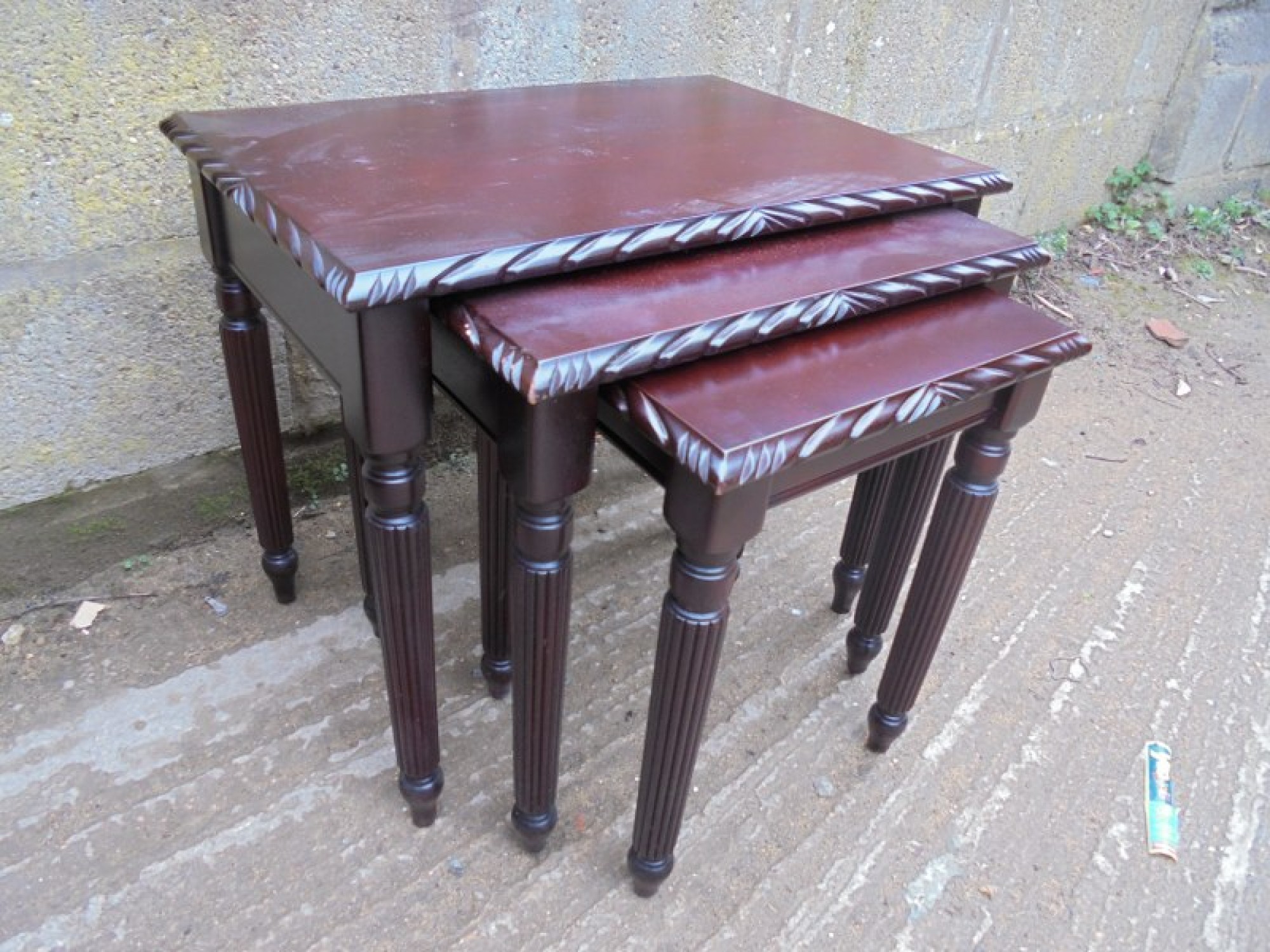 A STYLISH NEST OF 3 MAHOGANY COLOURED TABLES IN THE REGENCY STYLE. THE TABLES FIT UNDER EACH OTHER SO THEY NEATLY STORE AWAY.